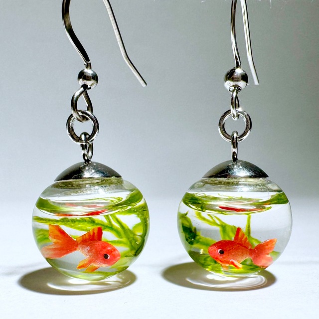 こちらは人気の金魚玉ピアスのロングタイプです。 つるし玉が振り子のように揺れるデザインとなっております。 江戸時代、金魚売りから買った金魚は「金魚玉」と呼ばれるガラスの金魚鉢に入れ、軒に吊るしたりして楽しんだそうです。 そんな金魚玉をミニチュアにして、耳飾りにしてみました。 14mmの硝子玉がゆらゆらと揺れます。 +70円でイヤリング(ネジバネ式)に変更も可能です。 選択欄からお選びください。 ◆金具◆ ピアス:サージカルステンレス イヤリング(オプション+70円):真鍮 その他 丸カン等の金具を使用 ◆サイズ◆ 金魚玉 直径約14mm ○お写真はイメージです。 金魚も一匹ずつ型を使わずに造形し、小さな目をつけ、ヒレを描いておりますので、体の大きさやお顔や模様などお写真と若干異なります。 水草も一本ずつ封入しているため、量や形など作品ごとに違いがございます。 同じものは世界で一つとしてない、自分だけの子との出会いをたのしんでいただけると幸いです。 ○お写真はイメージです。 金魚も一匹ずつ型を使わずに造形し、小さな目をつけ、ヒレを描いておりますので、体の大きさやお顔や模様などお写真と若干異なります。 水草も一本ずつ封入しているため、量や形など作品ごとに違いがございます。 同じものは世界で一つとしてない、自分だけの子との出会いをたのしんでいただけると幸いです。 ○硝子を使用した作品のため、衝撃を加えると割れることがあります。 (中のお水は固まっておりますので、液体漏れの心配はございません) ○水や衝撃にも強い高性能の接着剤でキャップと硝子玉を接着しておりますが、どうしても強い力で引っ張ると取れてしまう可能性があります。優しくお取り扱いいただきますようお願いいたします。