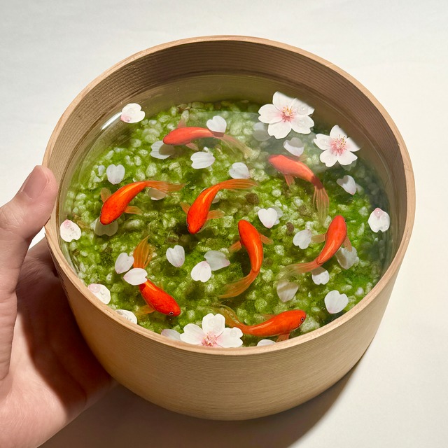 こちらは木桶の中で和金が泳ぐ置物です。 特大サイズですので、置物としての存在感がとてもあります。 【大きさ】 直径約 15.5cm 高さ 約7cm 水底には砂利と苔を敷き、水中で舞う花びらや金魚の立体感も楽しんでいただけるよう、樹脂を何層にも重ねてお作りいたしました。 桜は小さな花びら一枚ずつ、細かな雄しべも一本ずつ、ピンセットを使って造形いたしました。 花びらをよりリアルに再現できるよう、葉脈をつけて根本部分は僅かに彩色を施しております。 花の瑞々しさを表現するため、花びらには水滴を落としました。 当店の金魚は、お顔の可愛らしさにもこだわっております。 おめめは黒目、白目の他に、白目の外側をほのかに縁取って描いております。 (金魚の品種) 和金 8匹