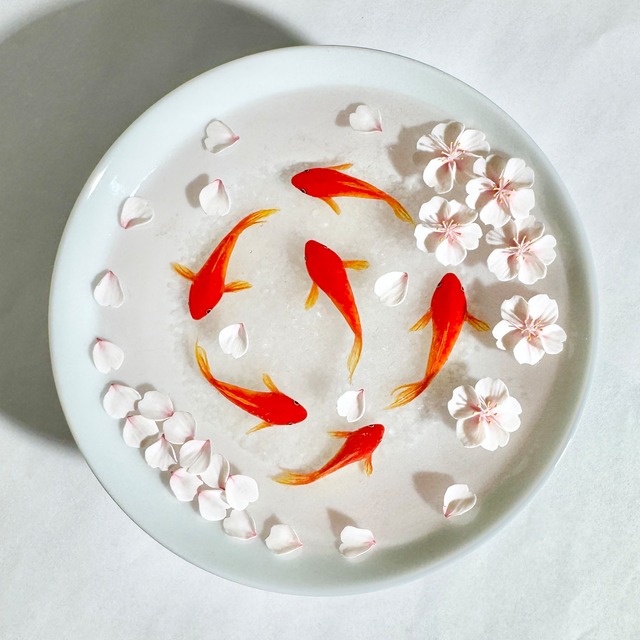 こちらは桜の浮かぶ盃に和金を泳がせた置物です。 水面に浮かべた桜の花びらは、光の当たり具合で水底に美しく影を落とします。 桜は小さな花びら一枚ずつ、細かな雄しべも一本ずつ、ピンセットを使って造形いたしました。 花びらをよりリアルに再現できるよう、根本部分は僅かに彩色を施しております。 金魚は水を泳ぐしなやかな姿を再現するために、フォルムや体のカーブまでこだわって造形しました。 透き通るような色味を再現するため、色付けは単色ではなく異なる色を数回に分け、グラデーションをつけております。 水の中で泳ぐ優雅な姿を表現するために、ヒレの細い筋も小さな筆で一本ずつ描いております。 当店の金魚は、お顔の可愛らしさにもこだわっております。 小さなおめめは、本物に近い表情になるよう、ペン先ほどの黒目、白目の他に、白目の外側をほのかに縁取って描いておりますので、小さくても存在感を感じていただけると思います。 (金魚の品種) 和金 2匹 【大きさ】 直径約8cm 高さ約3.7cm ○お写真はイメージです。 金魚も一匹ずつ型を使わずに造形し、小さな目をつけ、ヒレを描いておりますので、体の大きさやお顔や模様などお写真と若干異なります。 桜の配置なども多少の個体差がございます。 同じものは世界で一つとしてない、自分だけの子との出会いをたのしんでいただけると幸いです。