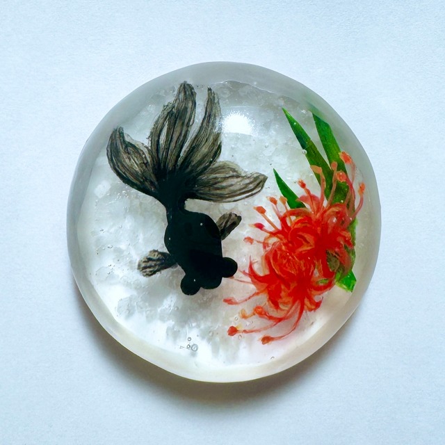 ご覧いただきありがとうございます。 こちらは秋の訪れを告げる彼岸花の水底に出目金が泳ぐモチーフです。 無料でワイヤーキーリング、又はブローチ加工ができますので、オプションからお選びください。 もちろんパーツのみでのお渡しも可能です。 ぷるんと柔らかな円形になるよう、原型から製作して型取りをしました。 裏面から側面にかけて磨り硝子風の加工が施しましたので、フォルムに更に柔らかい印象を与えます。 黒の出目金の雰囲気に合わせて、赤の彼岸花もコントラストをつけて手描きしております。 【サイズ】 直径 約3.8cm 厚み 約1.4cm ○お写真はイメージです。 金魚も一匹ずつ型を使わずに造形し、小さな目をつけ、ヒレを描いておりますので、体の大きさやお顔や模様などお写真と若干異なります。 同じものは世界で一つとしてない、自分だけの子との出会いをたのしんでいただけると幸いです。