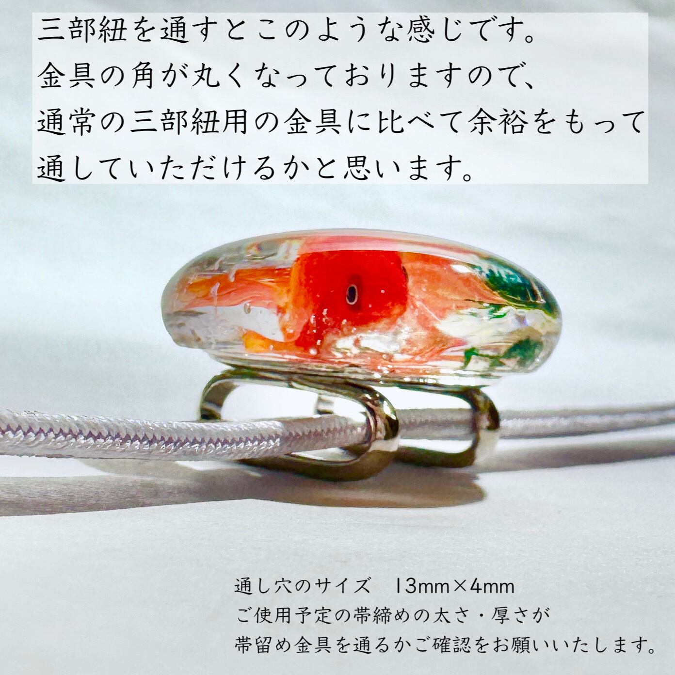 通し穴の角が丸い形なっていますので、通常の三部紐用の金具よりも余裕をもって通していただけるかと思いますが、以下のとおりサイズを記載いたしますので、ご使用予定の帯締めの太さ・厚さが帯留め金具を通るかご確認をお願いいたします。