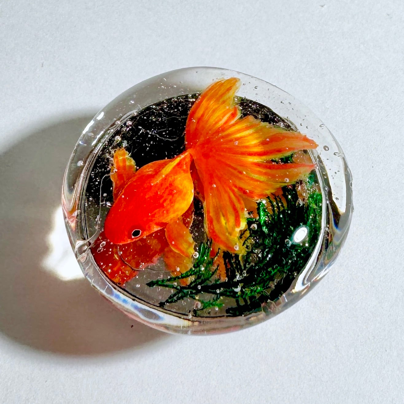 水草も一本ずつ封入しているため、量や形など作品ごとに違いがございます。