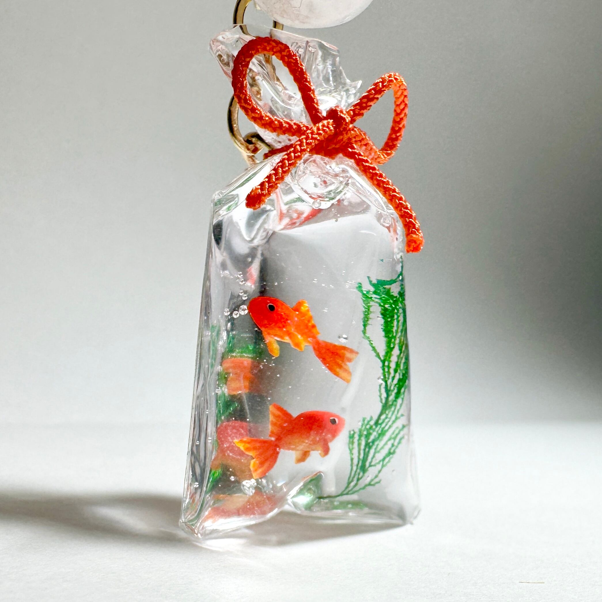 金魚も一匹ずつ型を使わずに造形し、小さな目をつけ、ヒレを描いておりますので、体の大きさやお顔や模様などお写真と若干異なります。