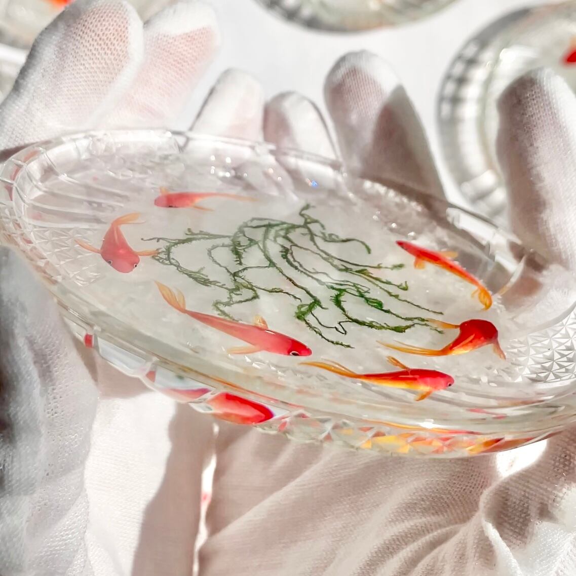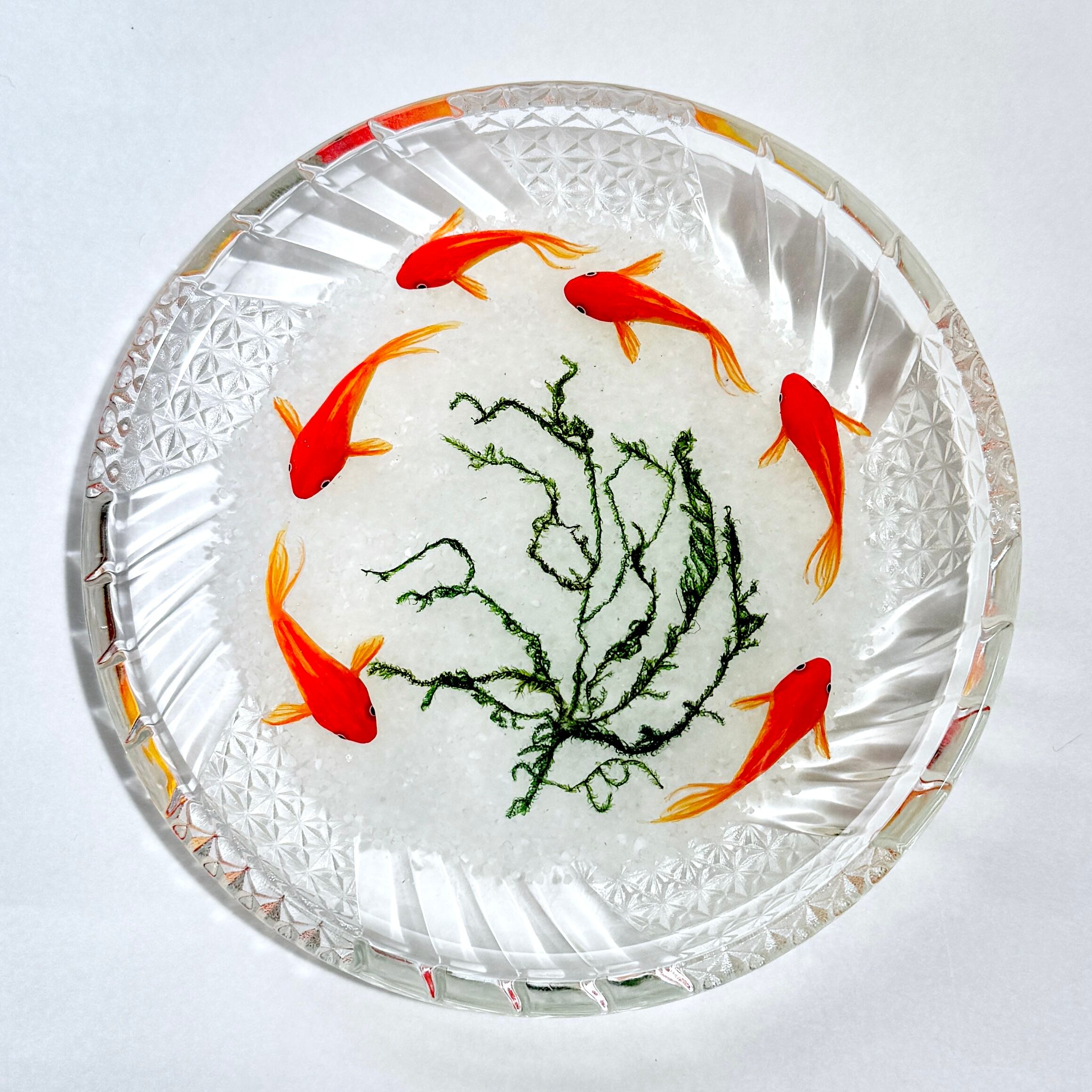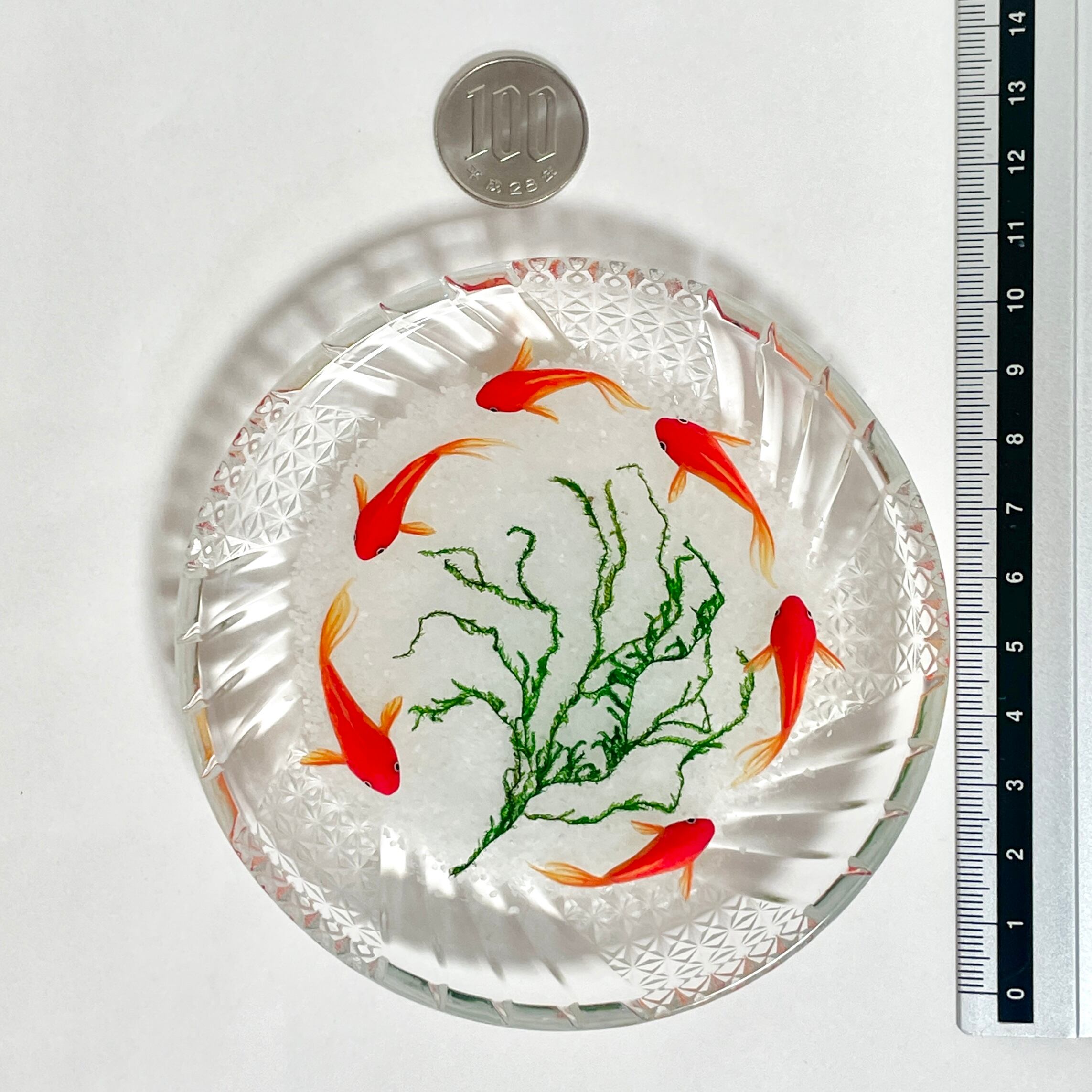 こちらは硝子皿に和金をまるく泳がせた置物です。