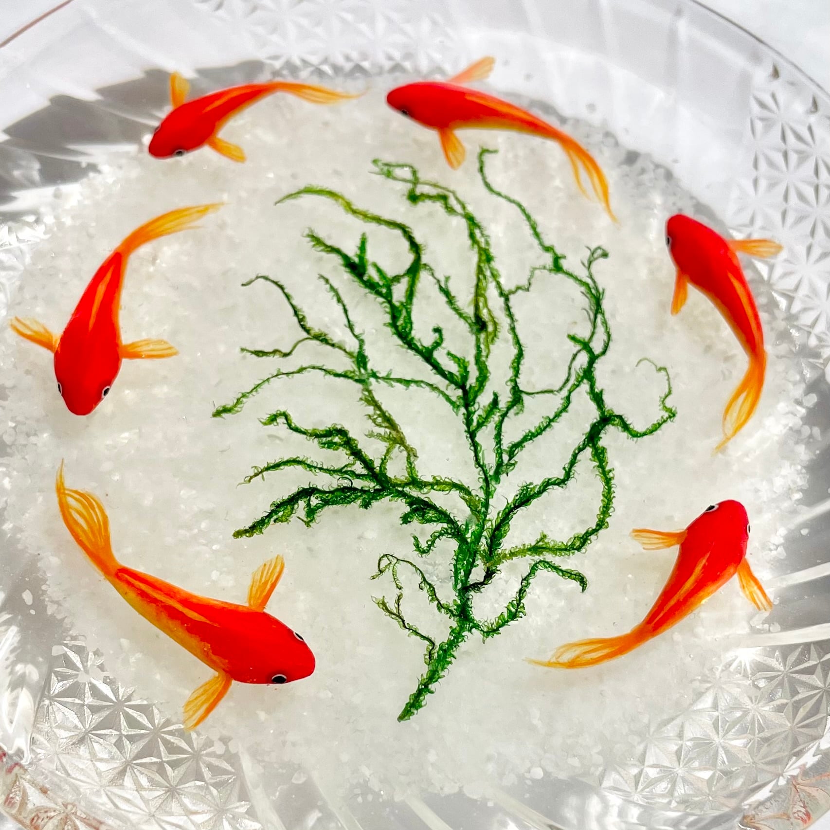 金魚も一匹ずつ型を使わずに造形し、小さな目をつけ、ヒレを描いておりますので、体の大きさやお顔や模様などお写真と若干異なります。