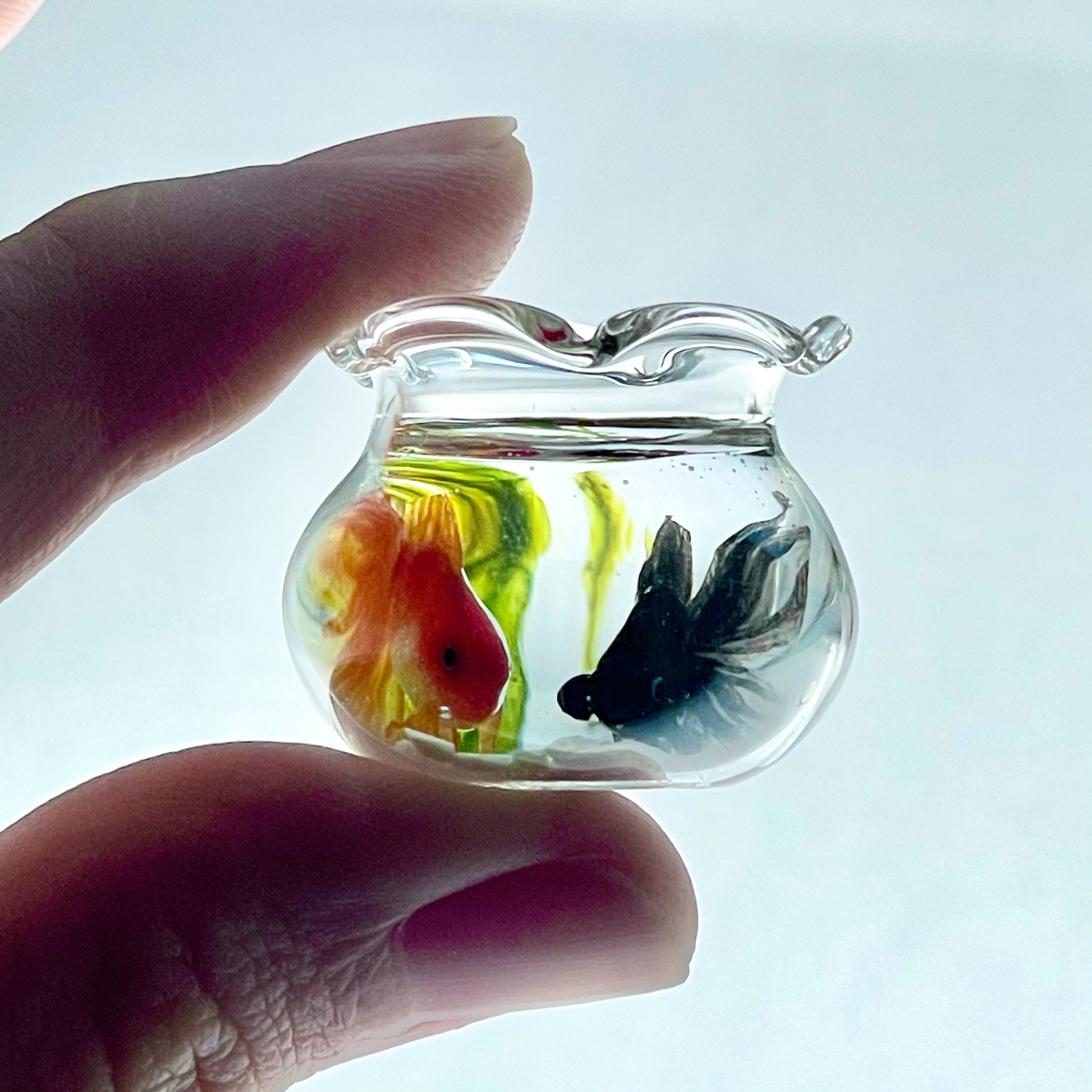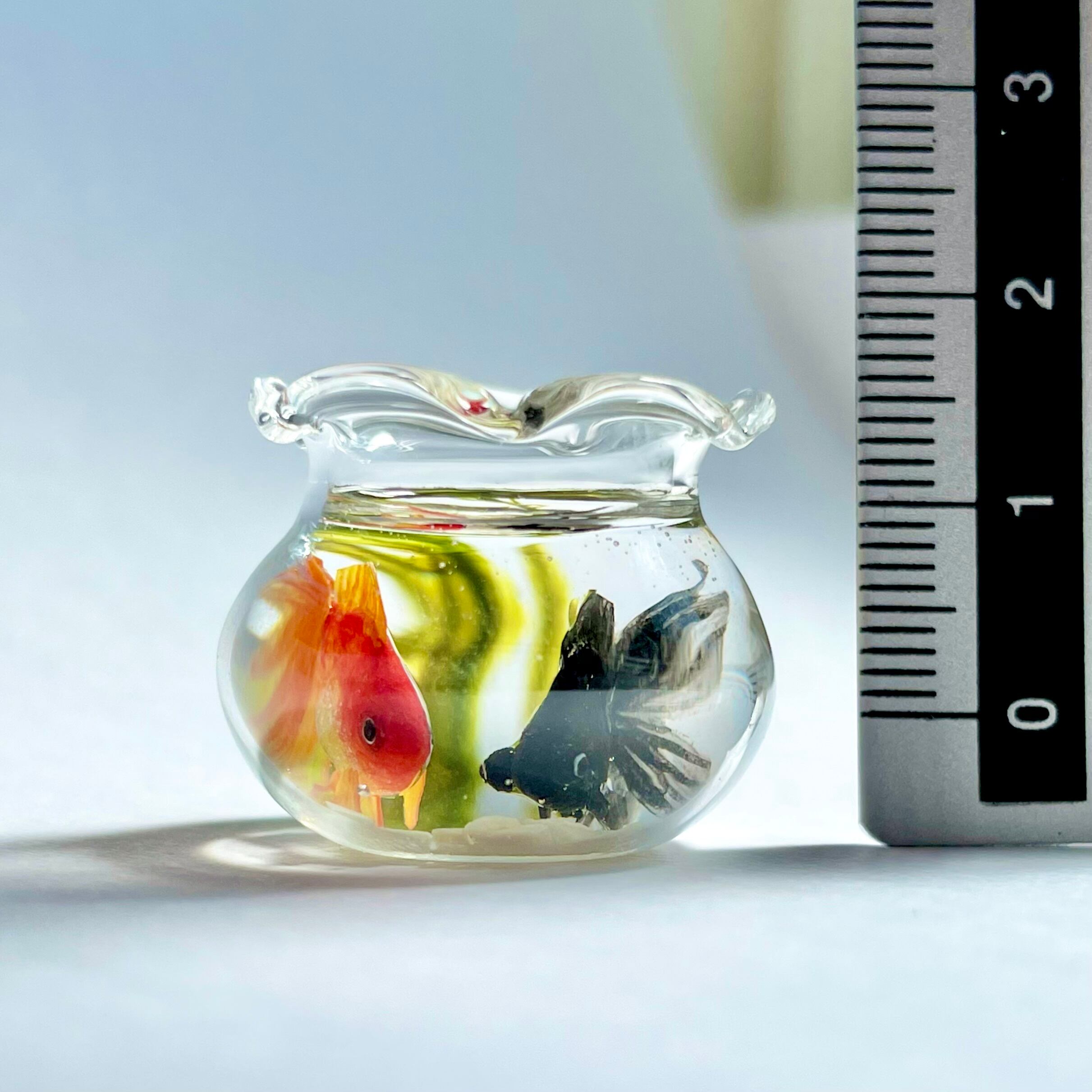 こちらはガラス製の金魚鉢に琉金と出目金が泳ぐミニチュアです。