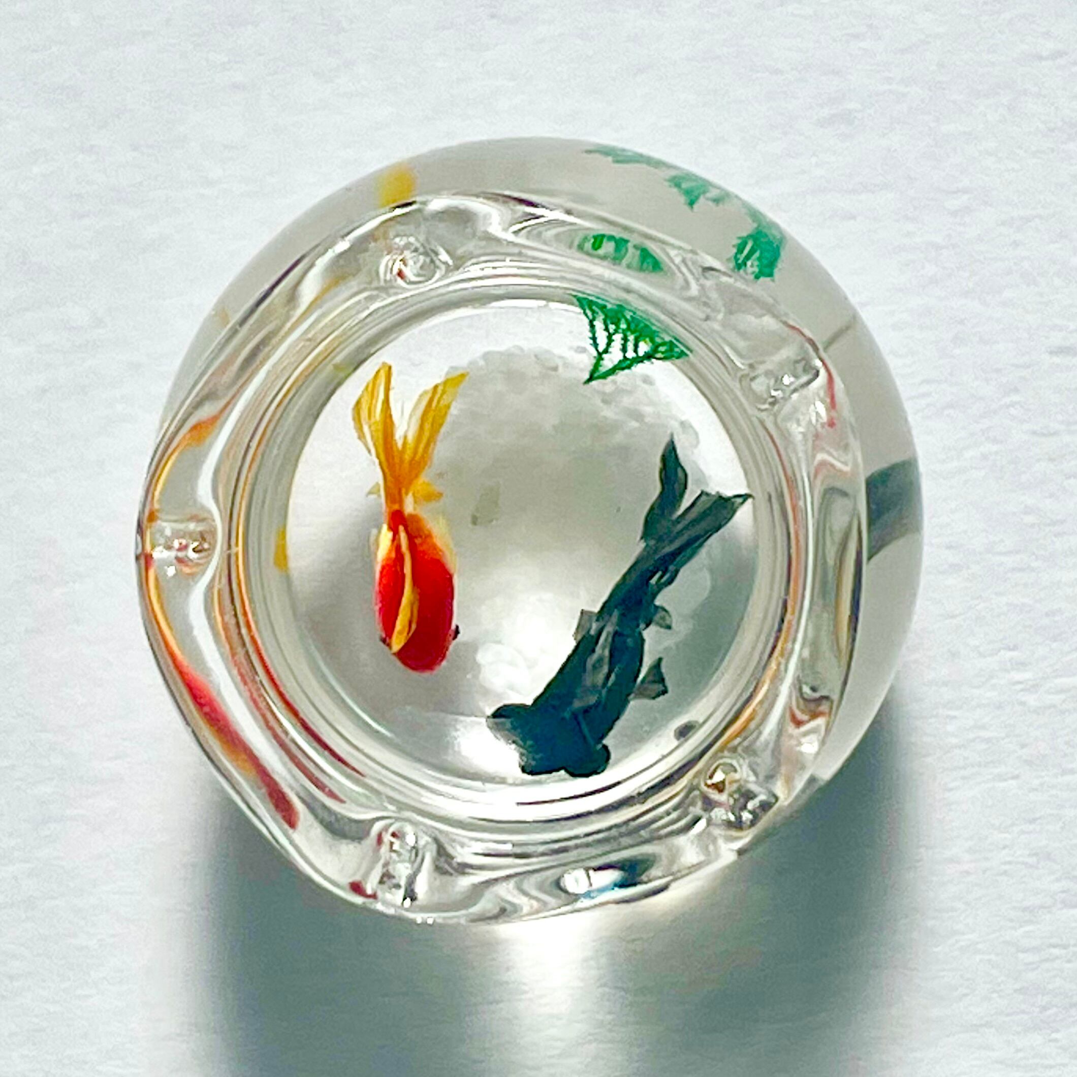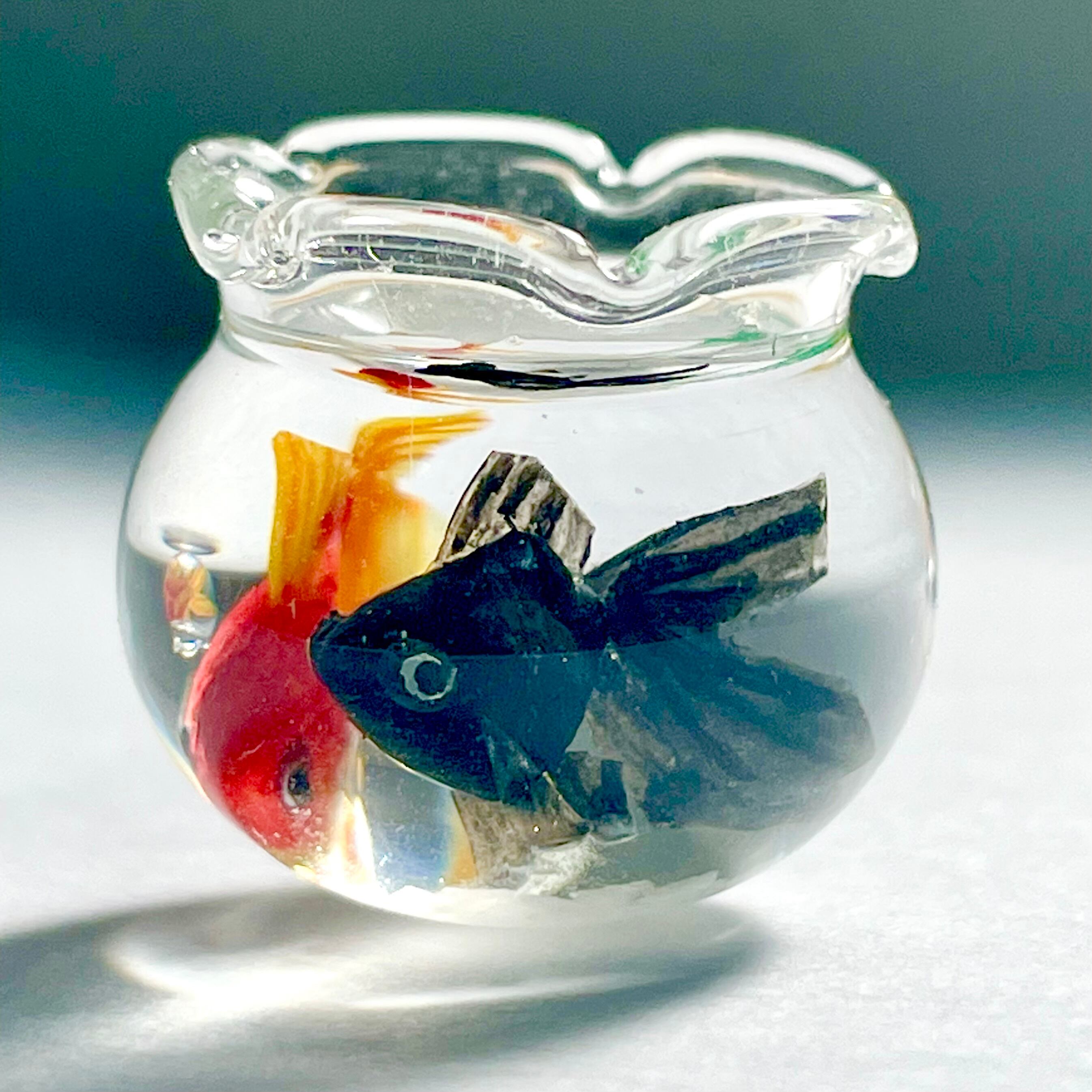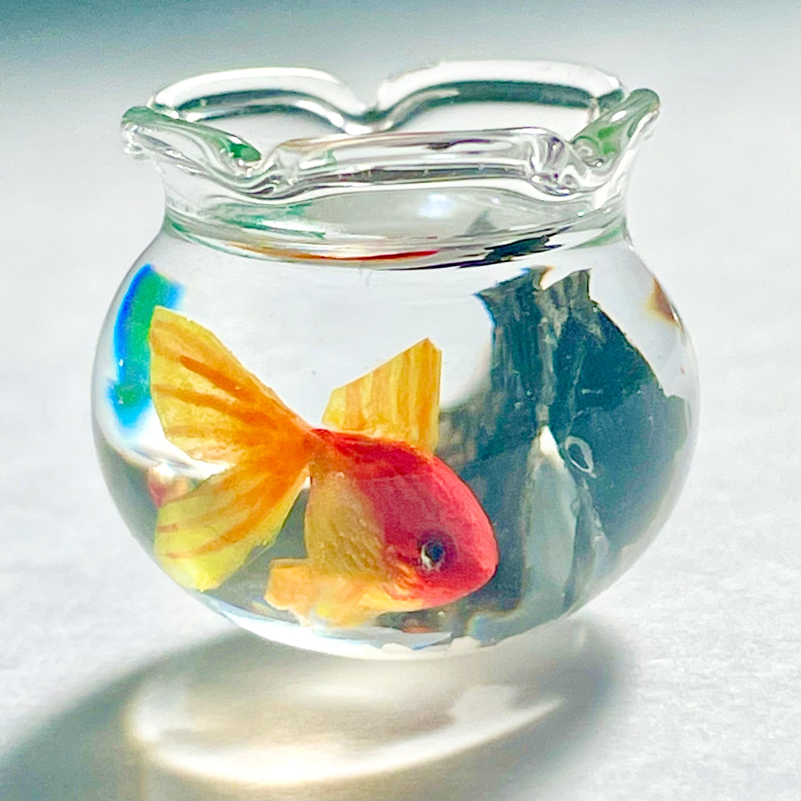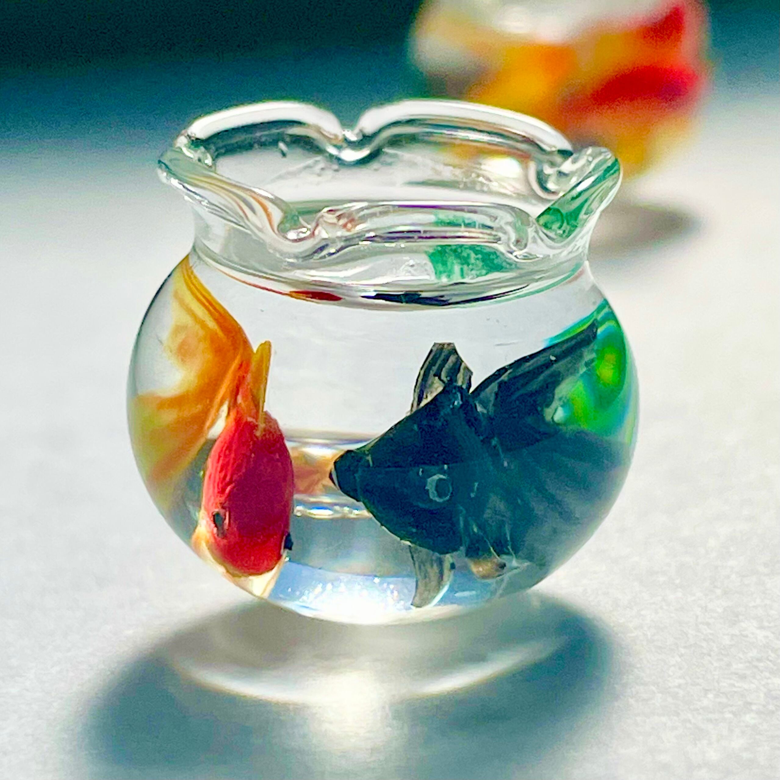 こちらはガラス製の金魚鉢に琉金と出目金が泳ぐミニチュアです。