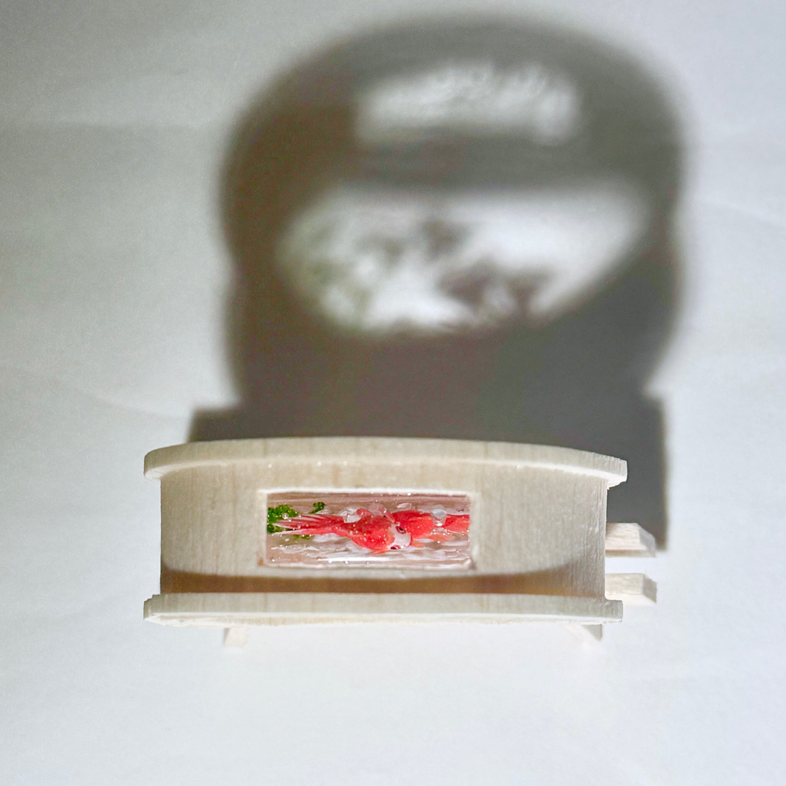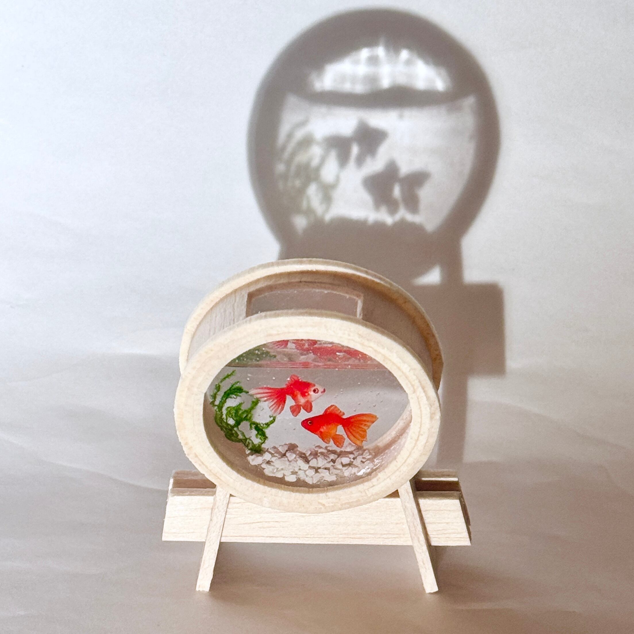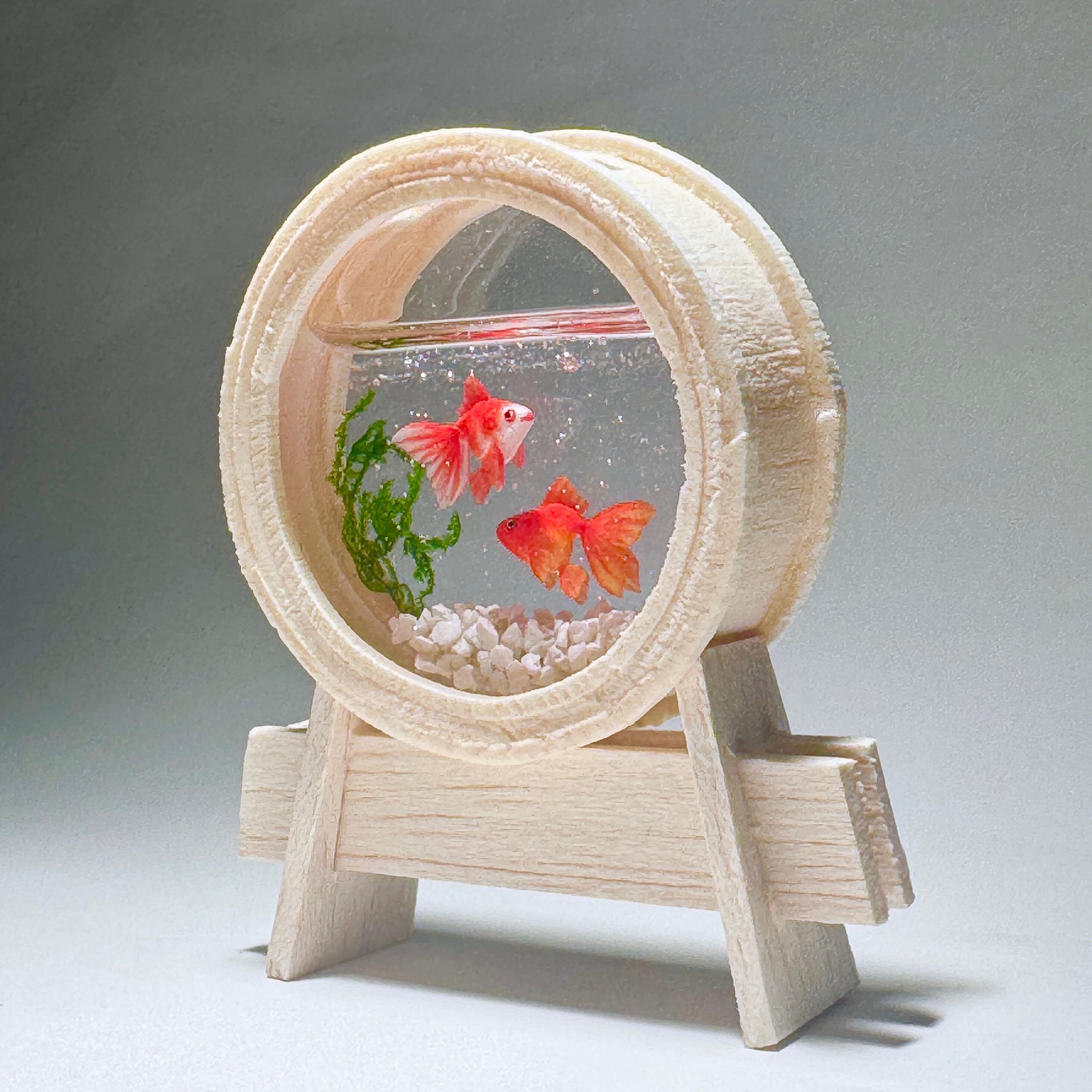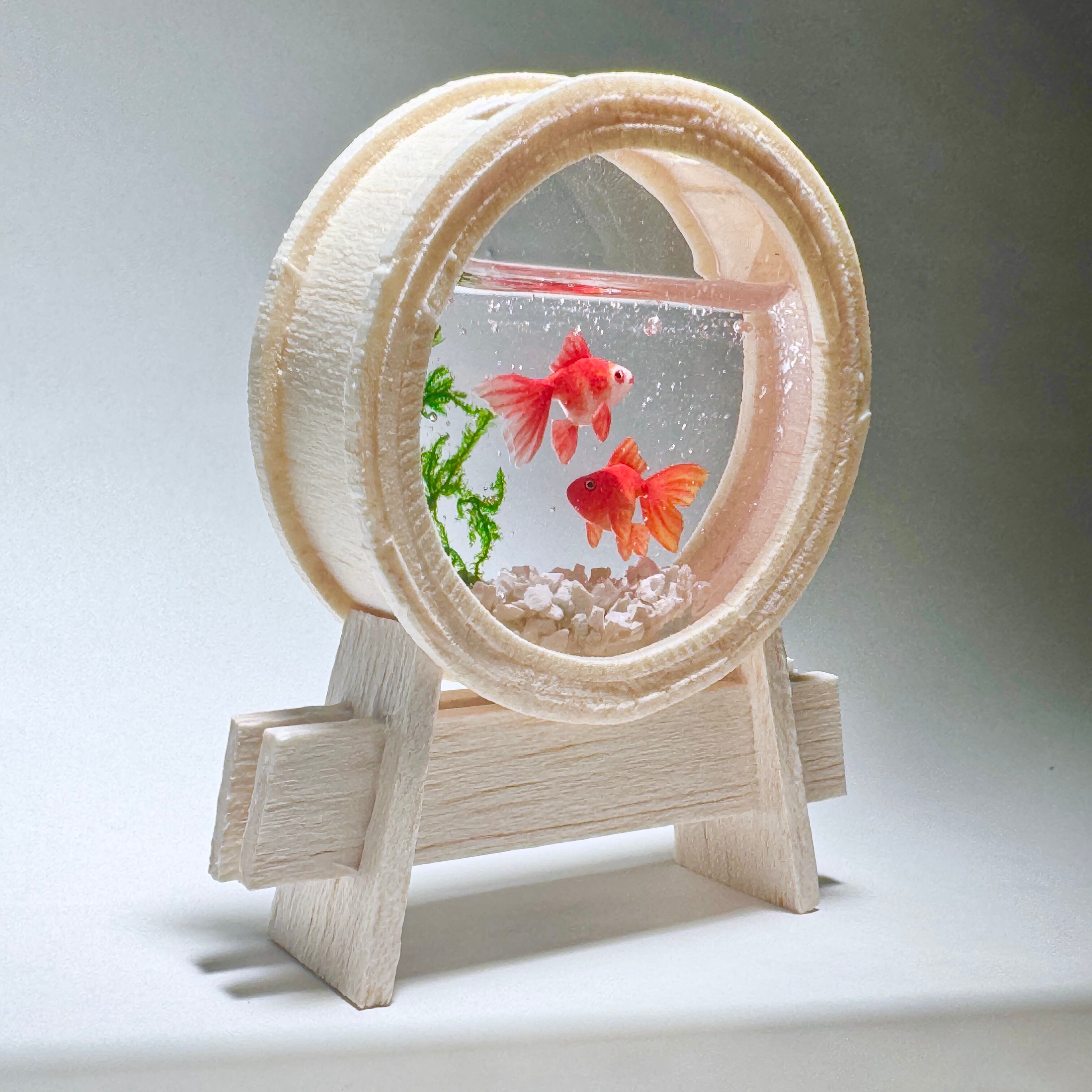 こちらは手作りの金魚桶で泳ぐ金魚の置物です。