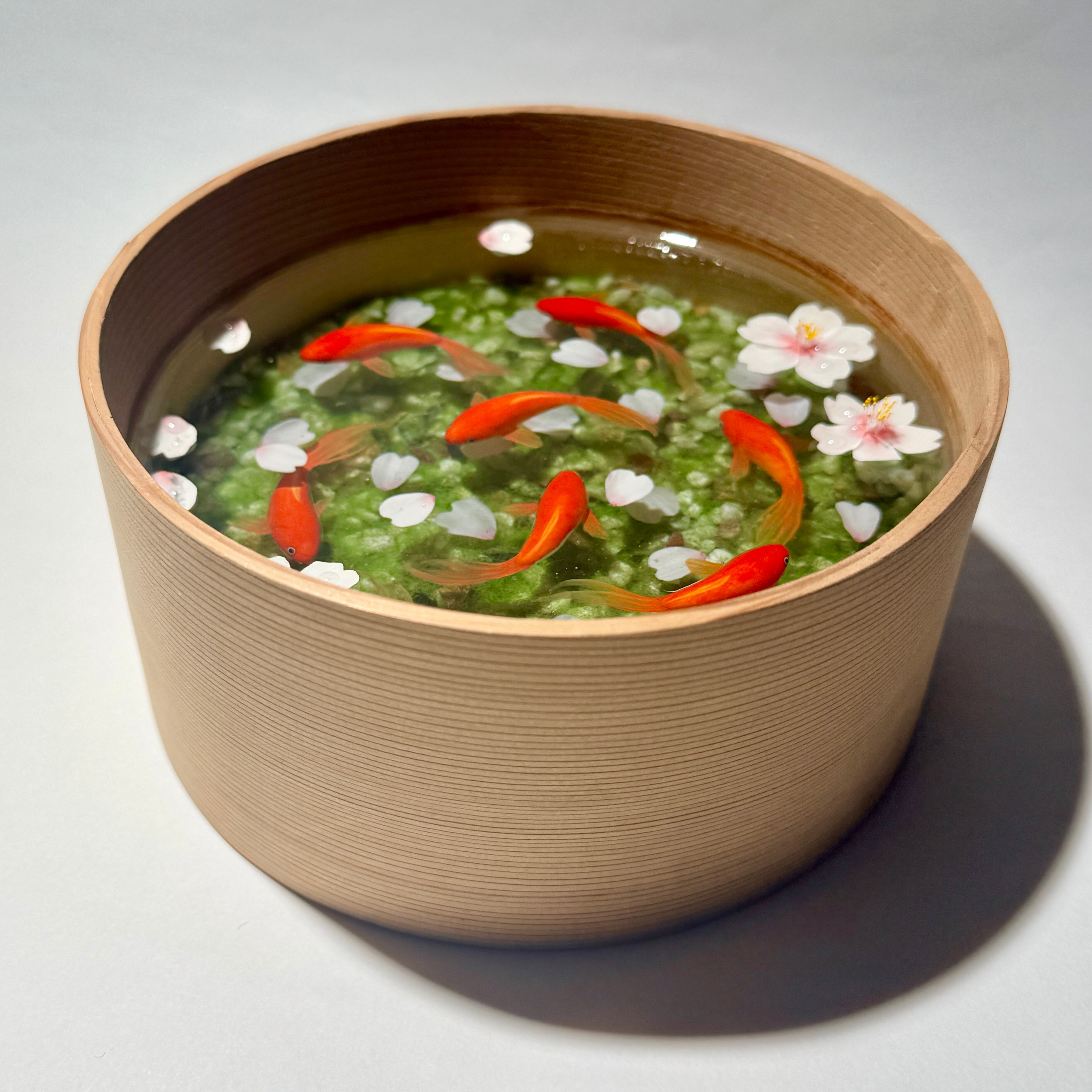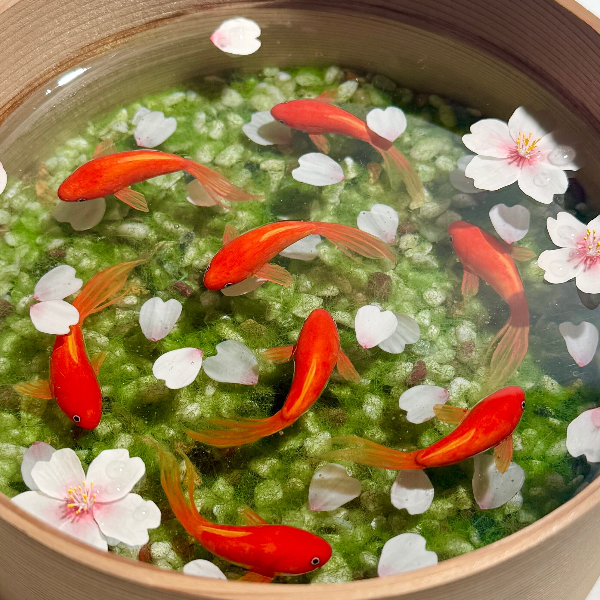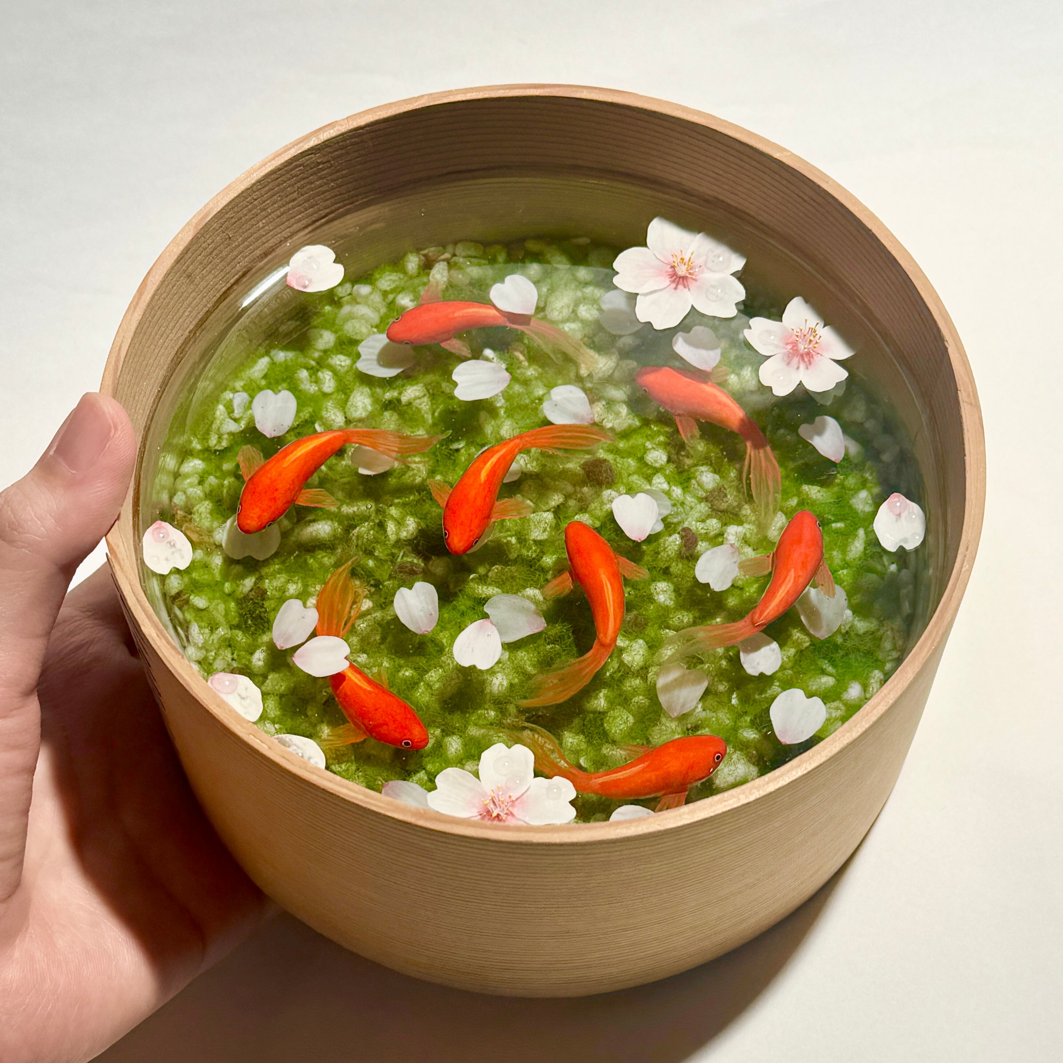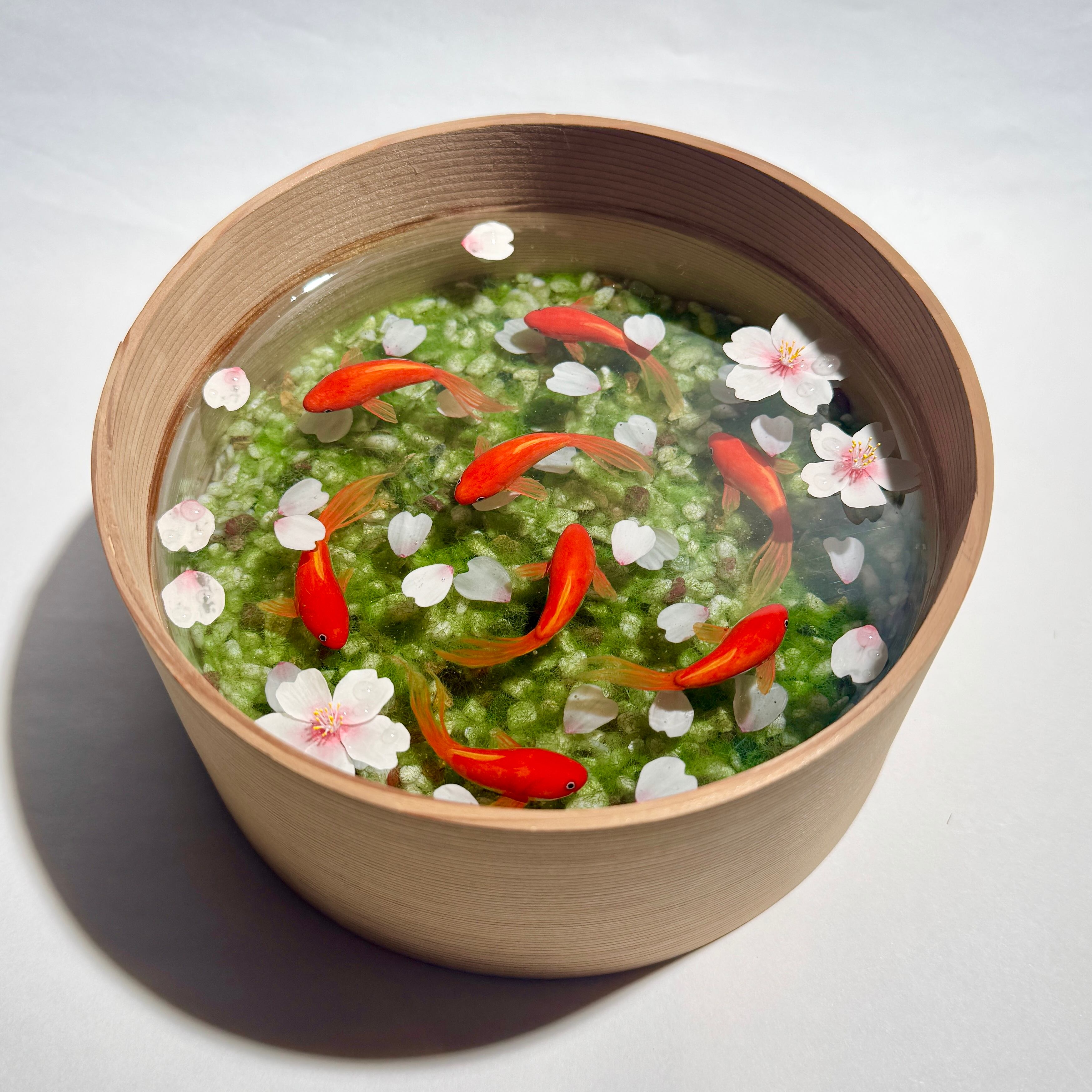 水底には砂利と苔を敷き、水中で舞う花びらや金魚の立体感も楽しんでいただけるよう、樹脂を何層にも重ねてお作りいたしました。