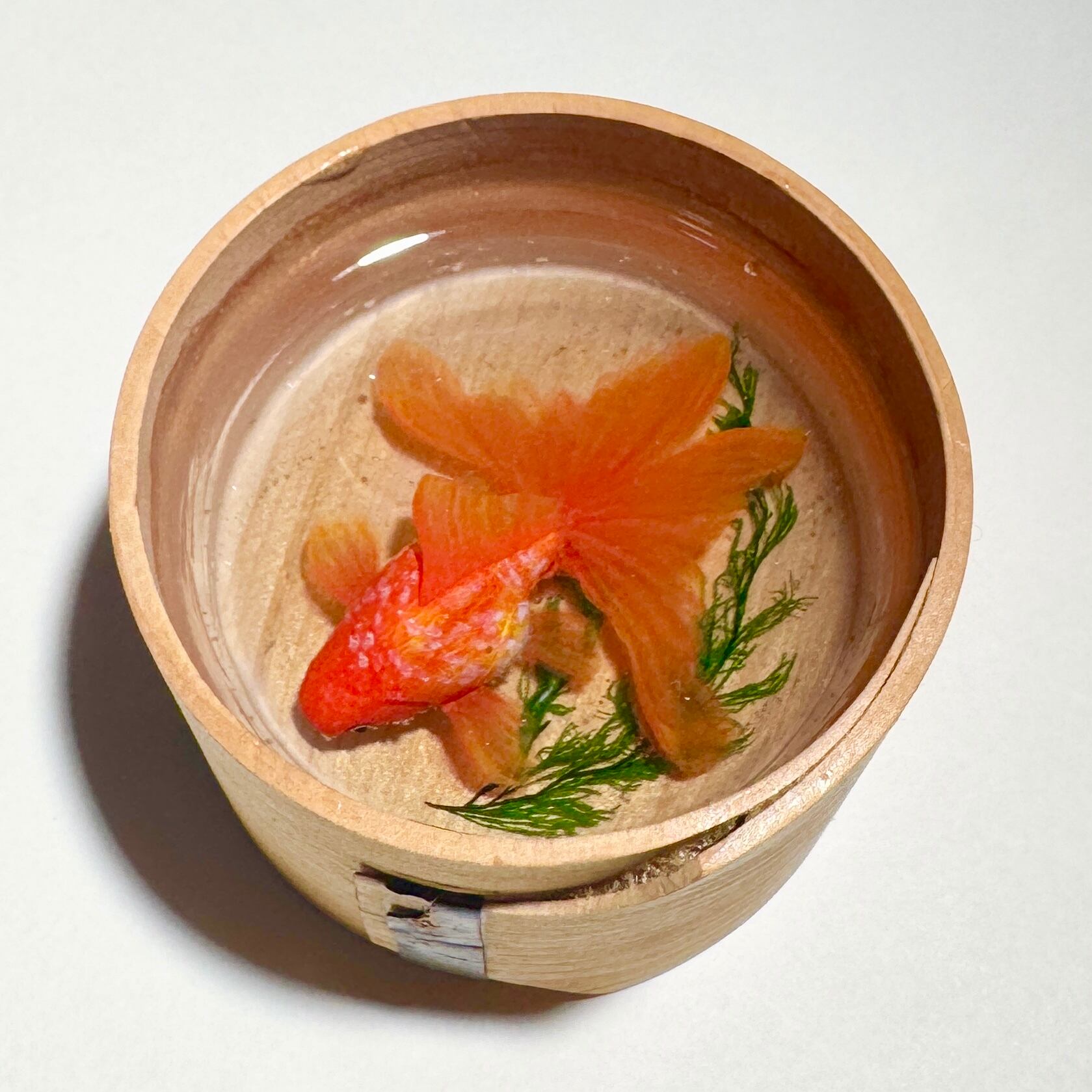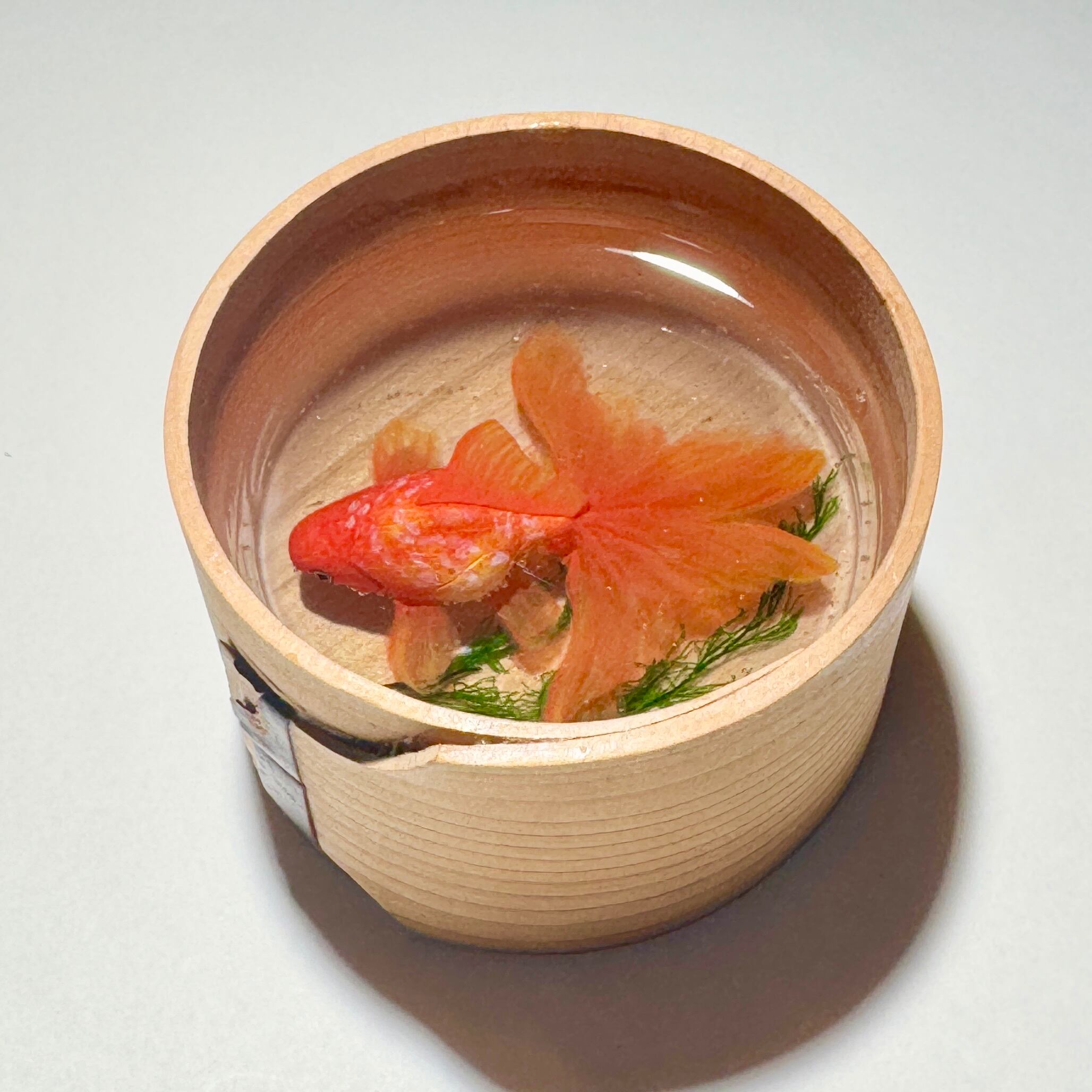 こちらは木製の酒器の中で琉金が泳ぐ置物です。