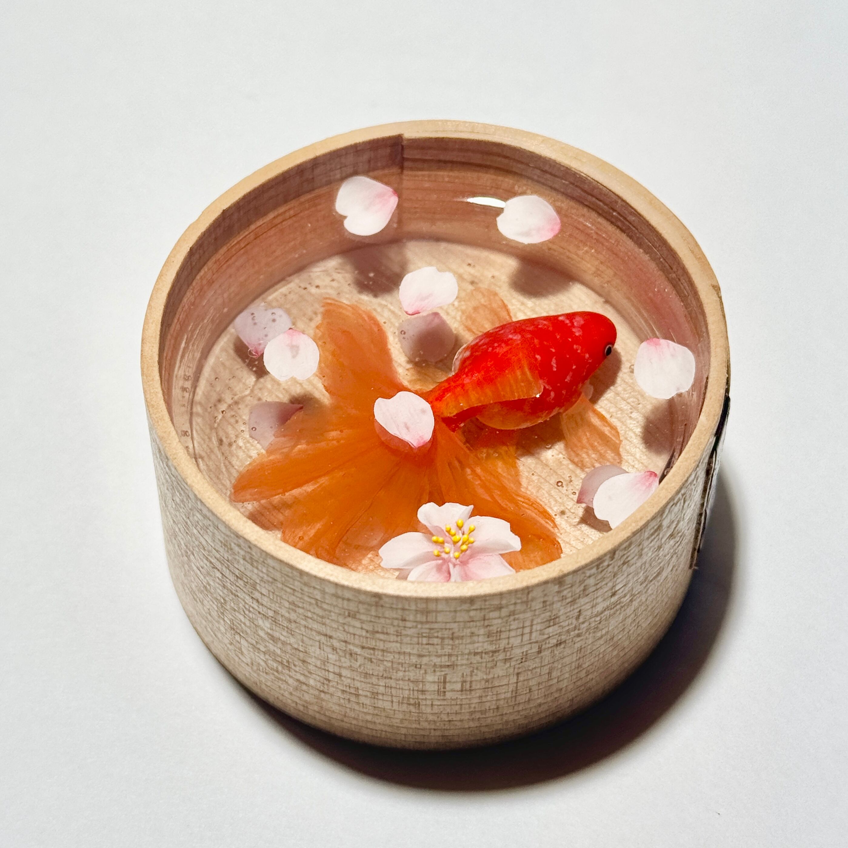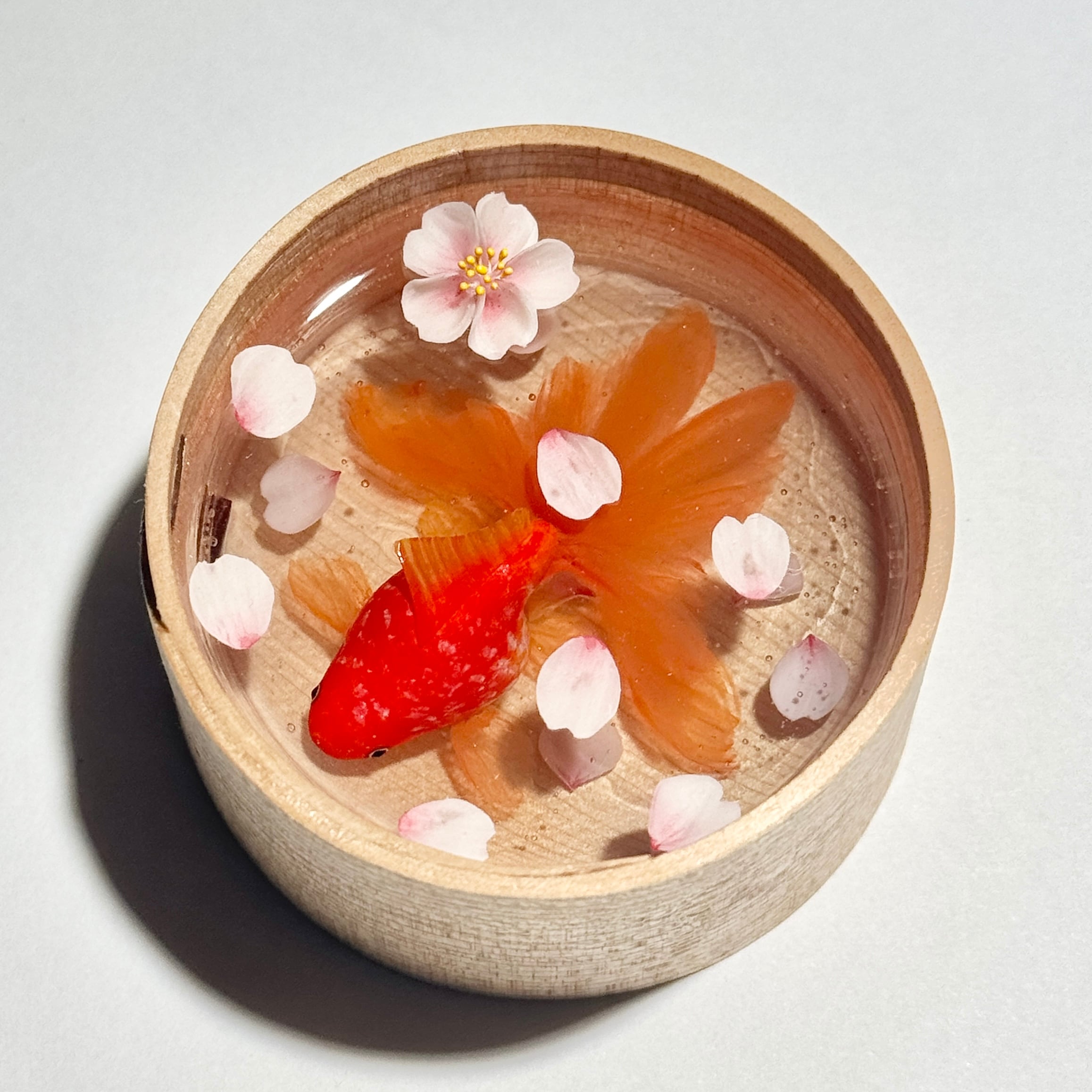 水中で舞う花びらや金魚の立体感を楽しんでいただけるよう、樹脂を何層にも重ねてお作りいたしました。