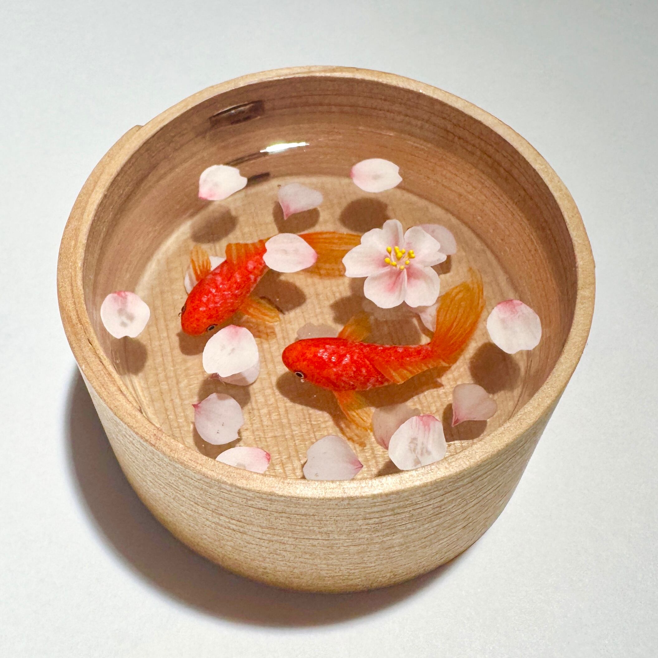 水中で舞う花びらや金魚の立体感を楽しんでいただけるよう、樹脂を何層にも重ねてお作りいたしました。
