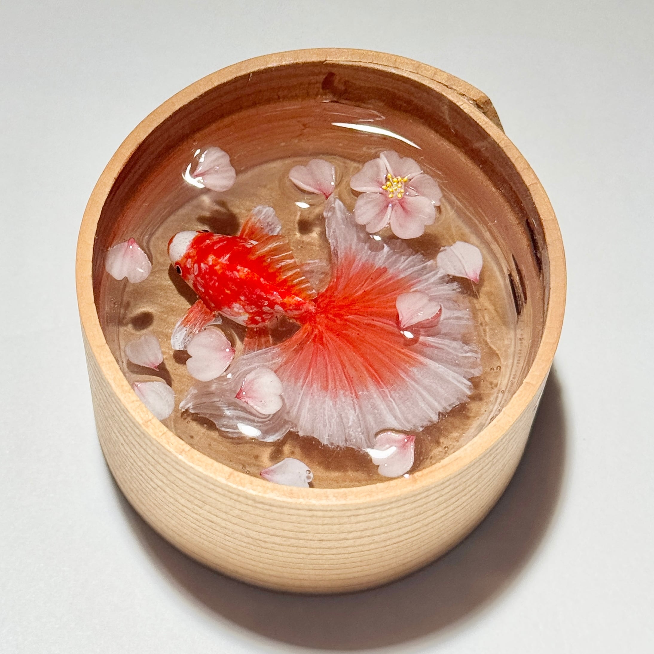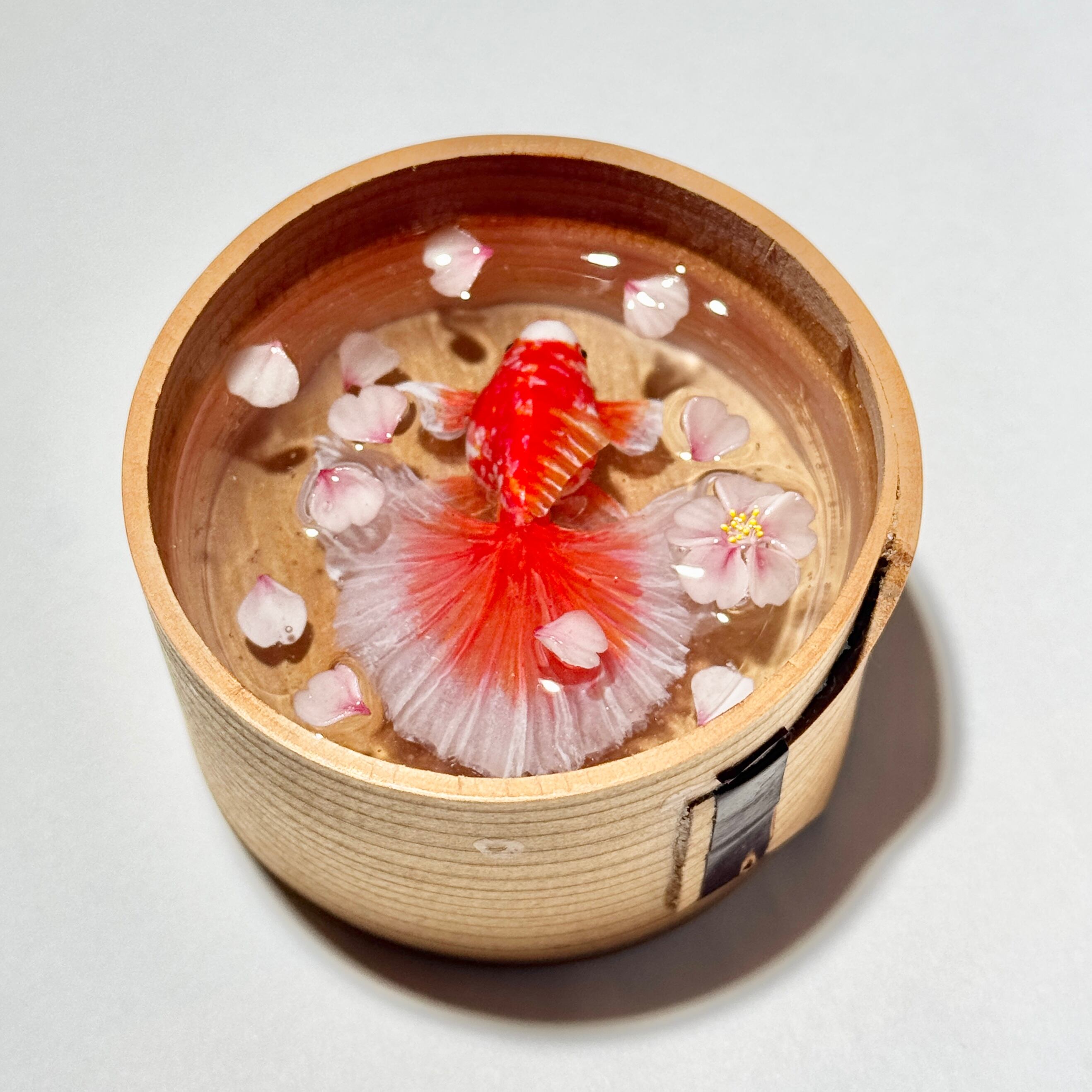 水中で舞う花びらや金魚の立体感を楽しんでいただけるよう、樹脂を何層にも重ねてお作りいたしました。