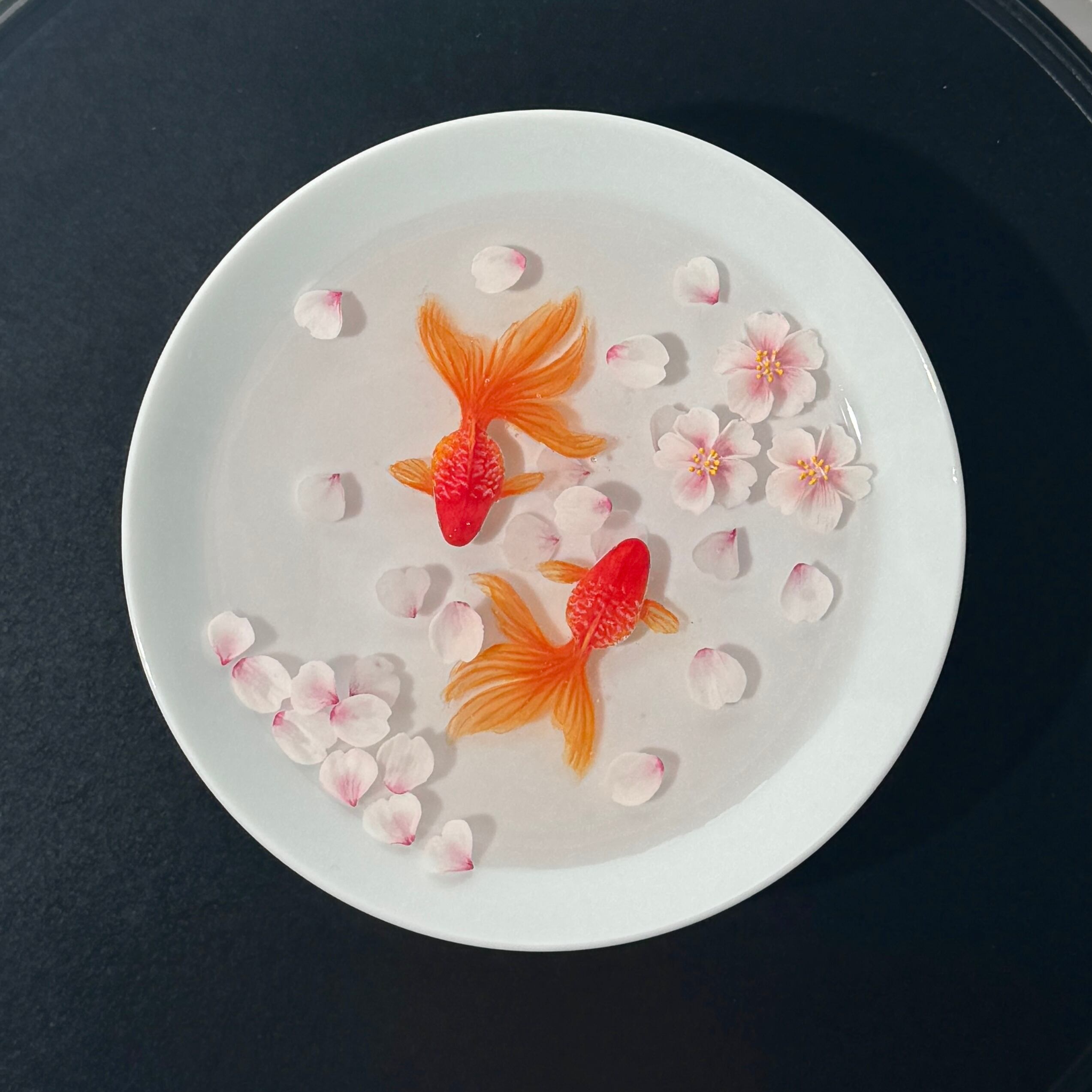 こちらは桜の浮かぶ盃に和金を泳がせた置物です。