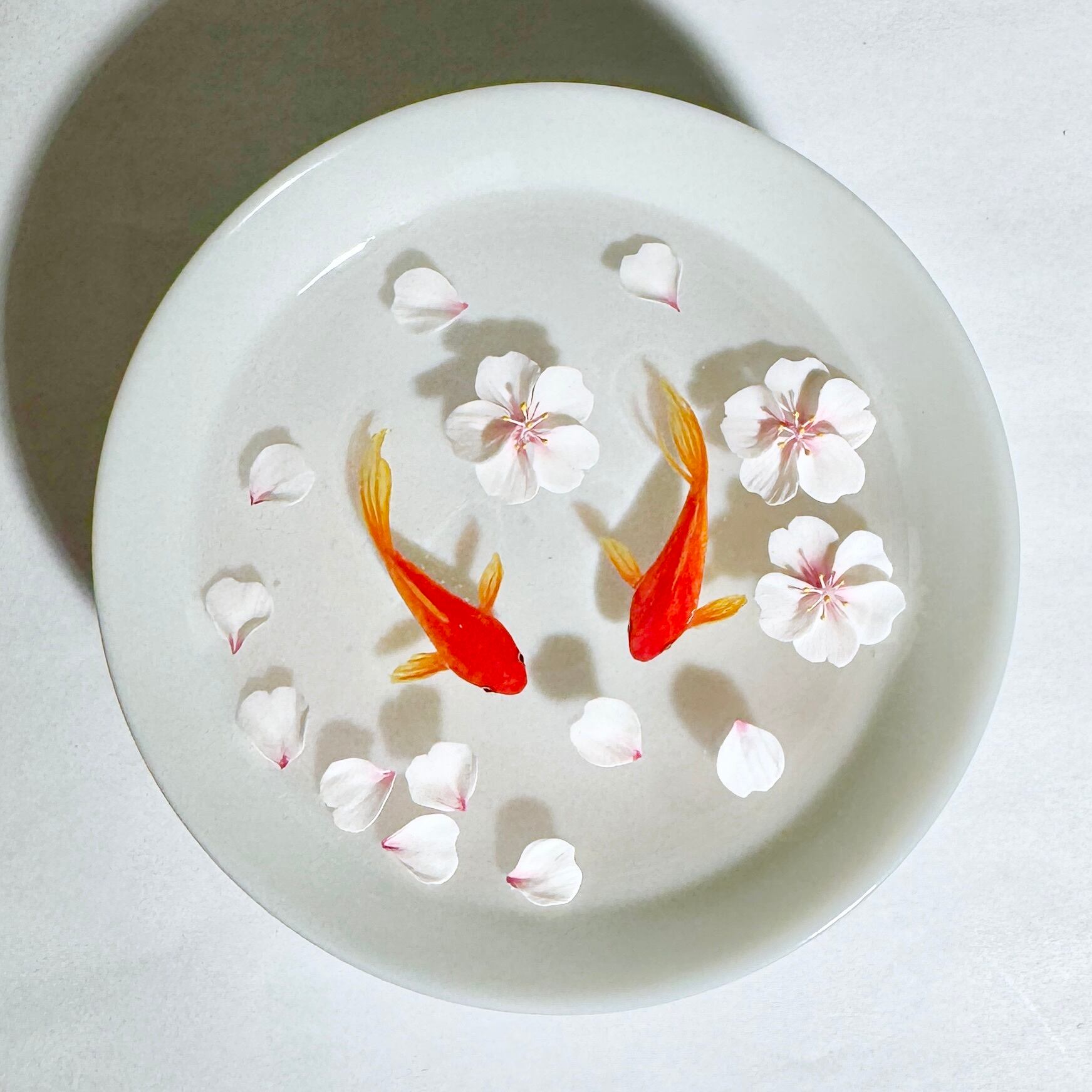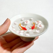 こちらは桜の浮かぶ盃に和金を泳がせた置物です。