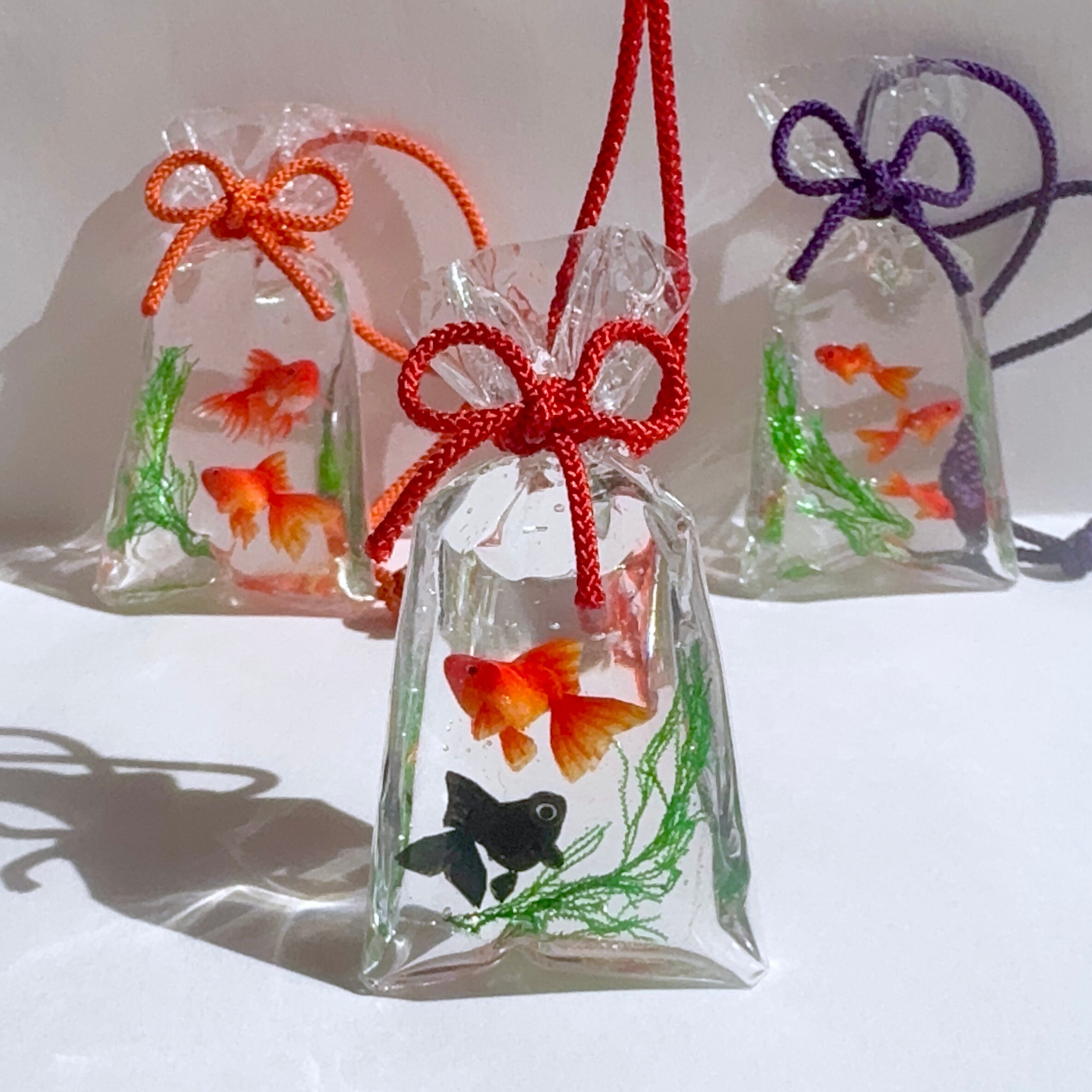 金魚も一匹ずつ型を使わずに造形し、小さな目をつけ、ヒレを描いておりますので、体の大きさやお顔や模様などお写真と若干異なります。