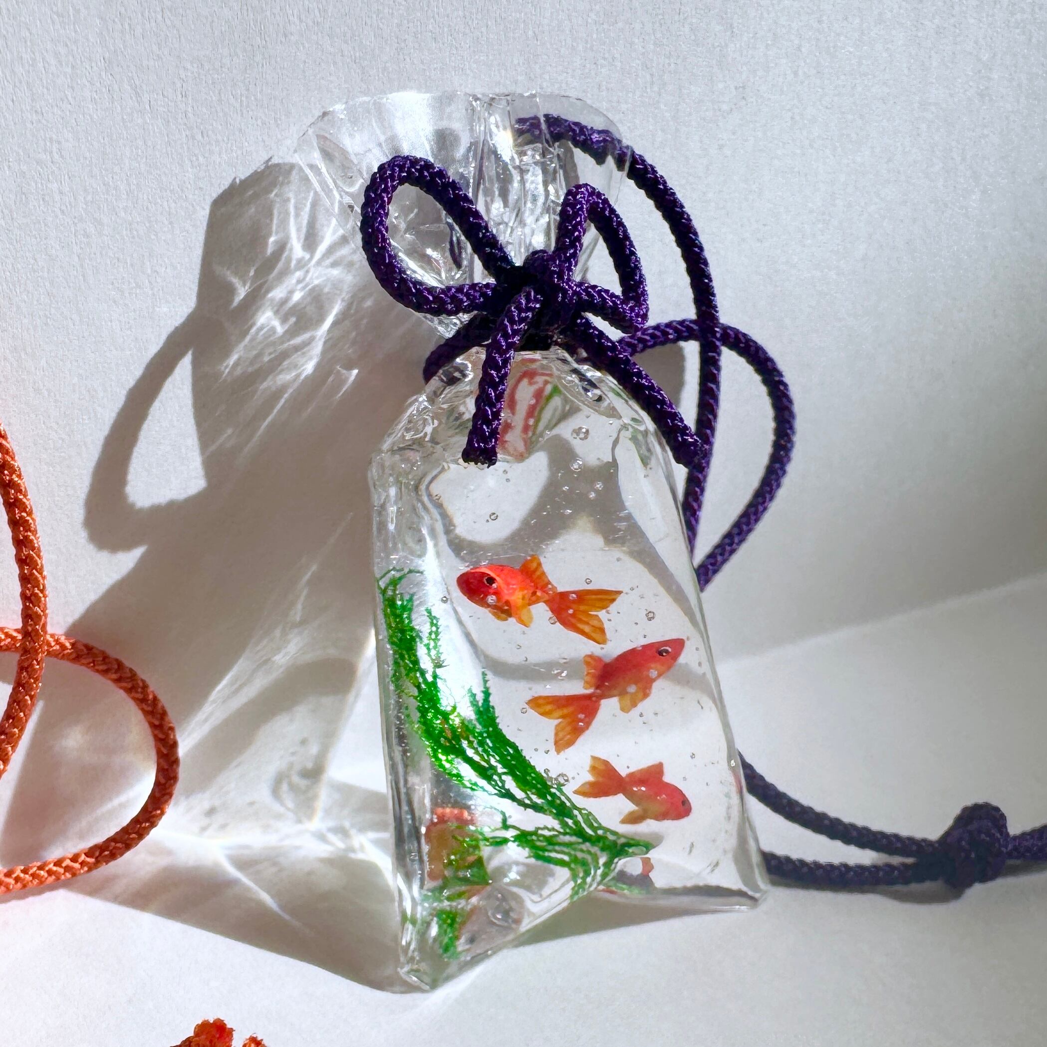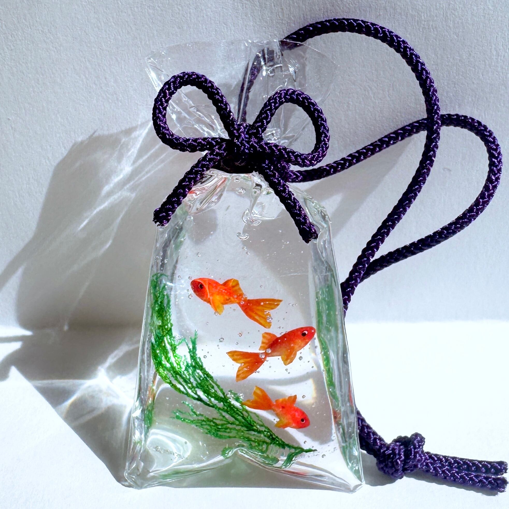 透き通る袋の中で、金魚たちがふわりと泳ぐ情景を表現いたしました。