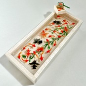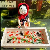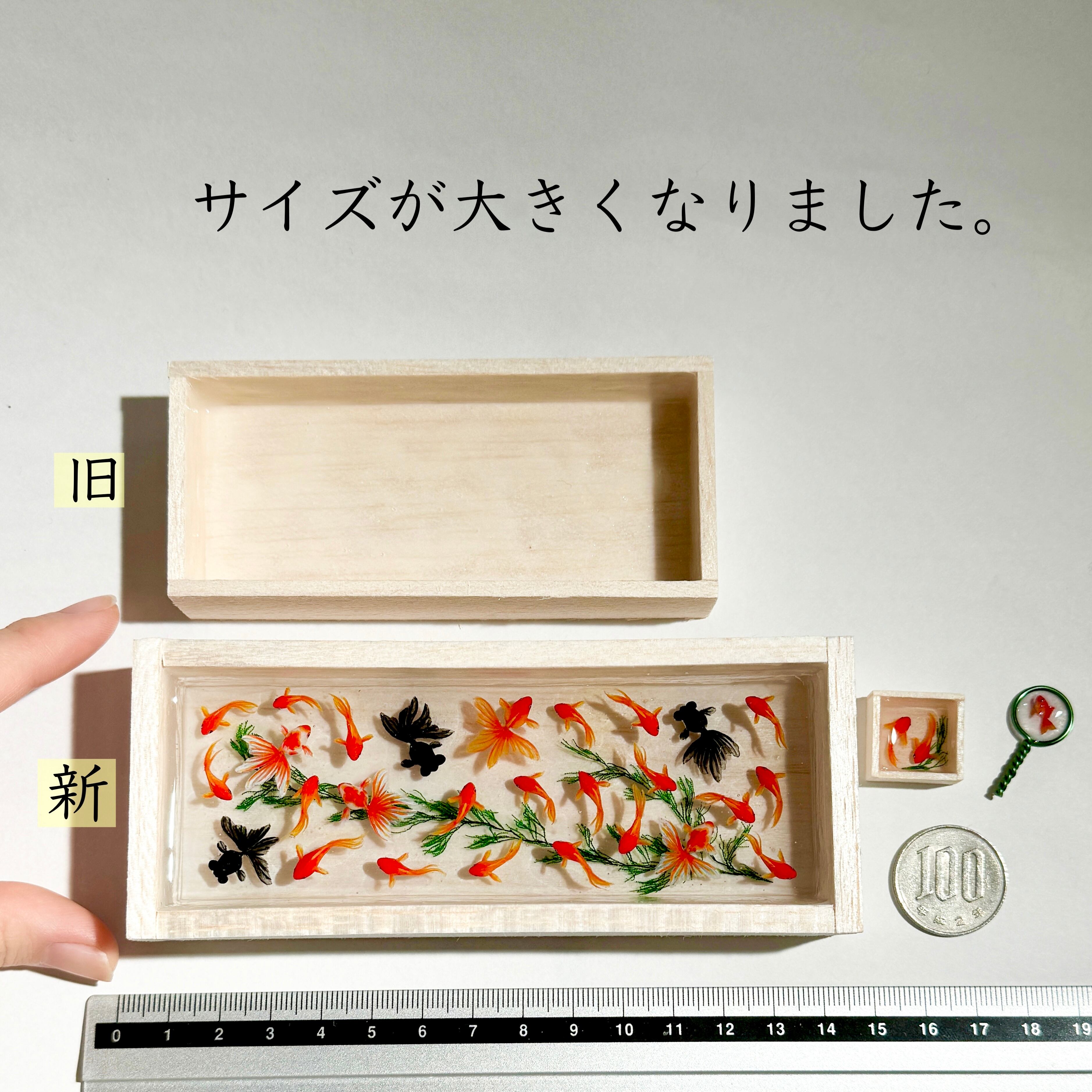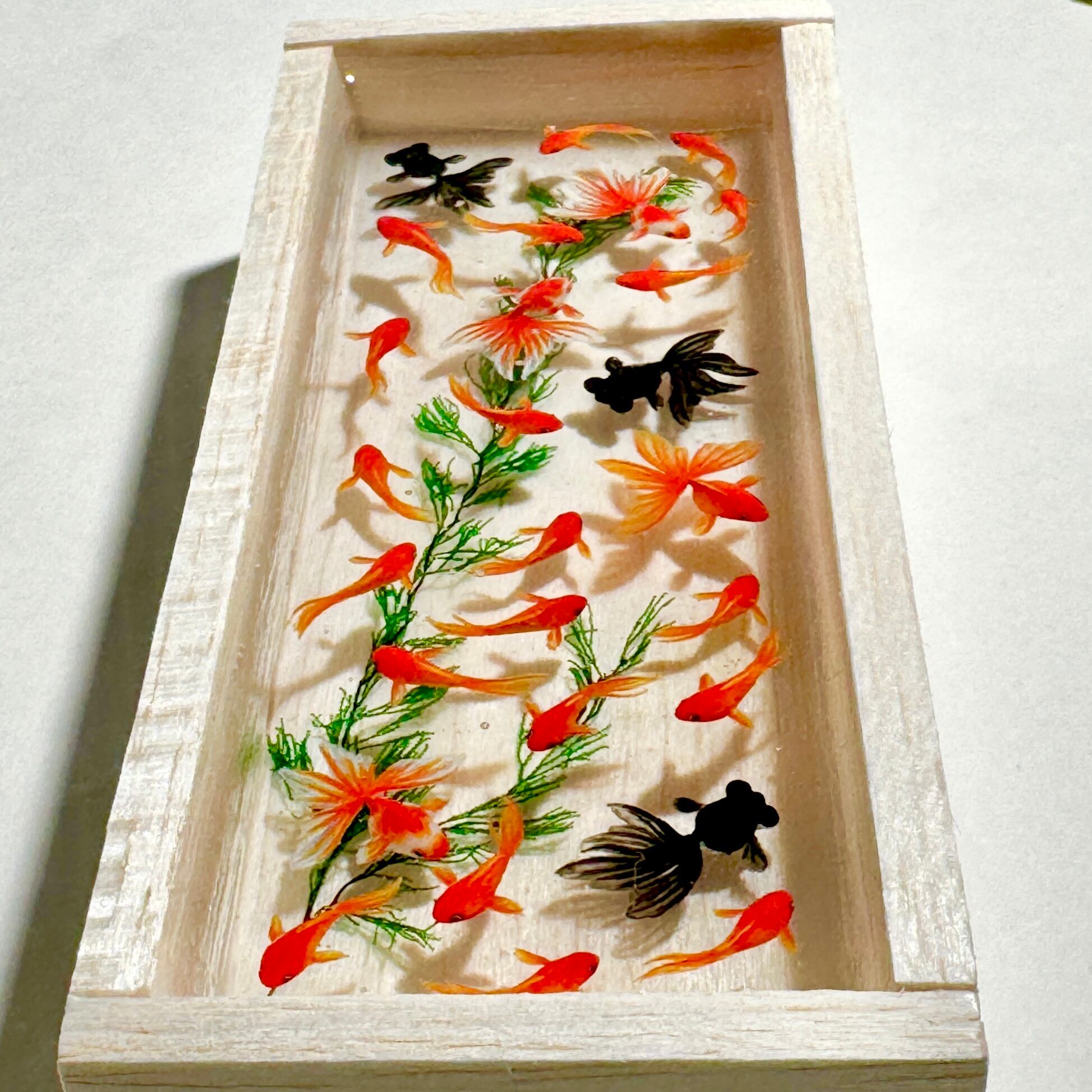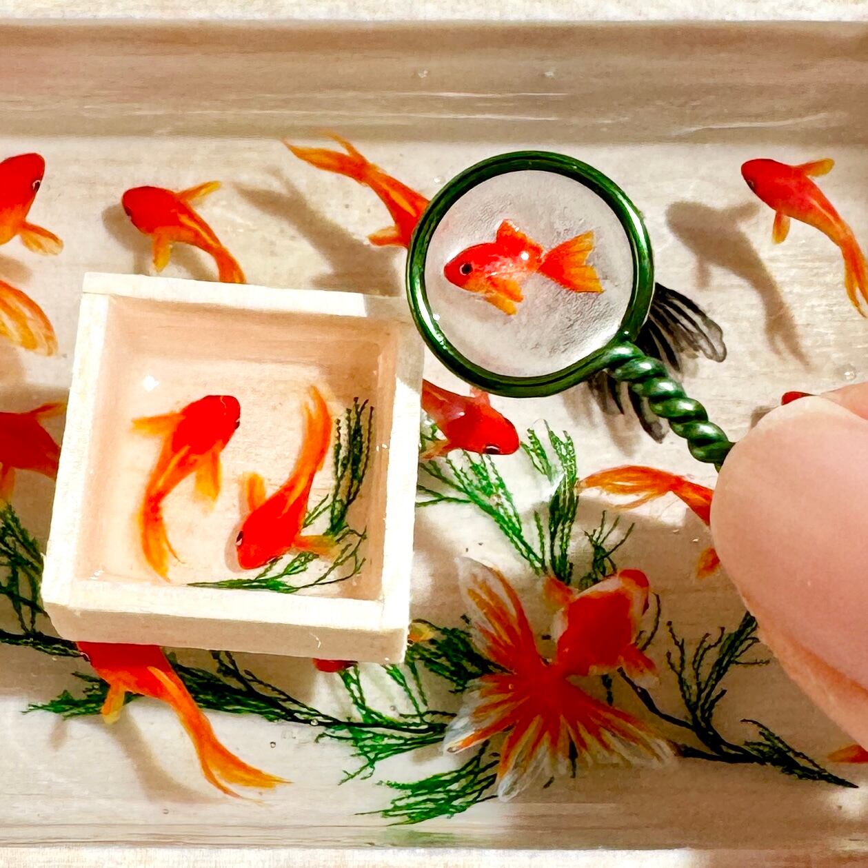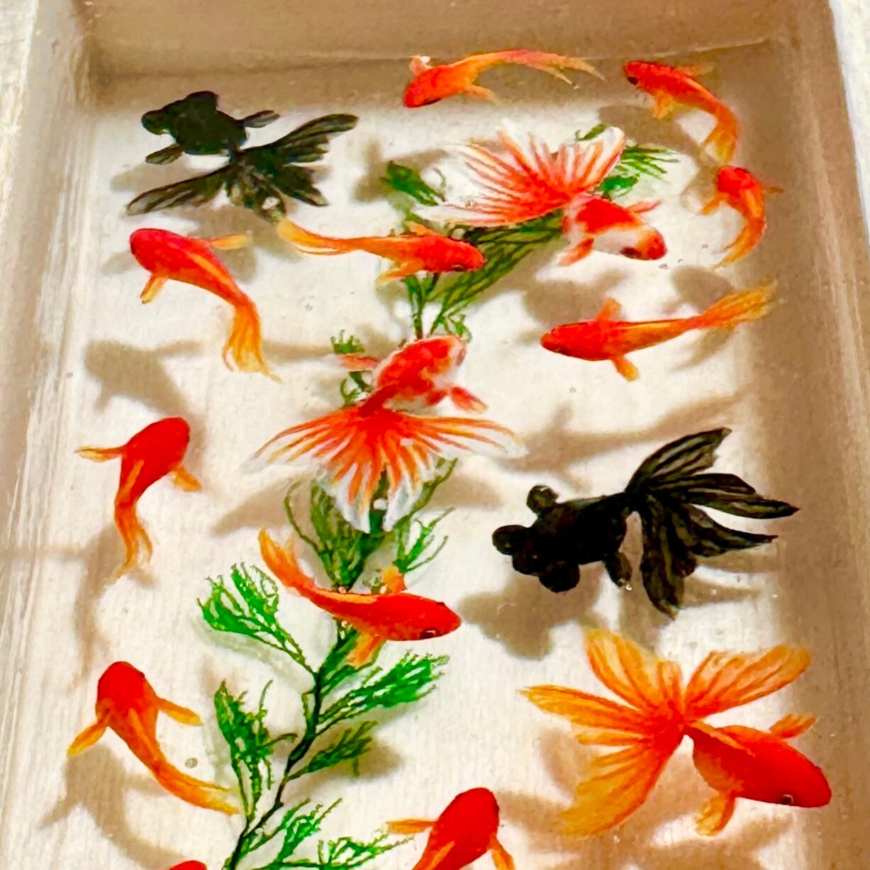 金魚も一匹ずつ型を使わずに造形し、小さな目をつけ、ヒレを描いておりますので、体の大きさやお顔や模様などお写真と若干異なります。