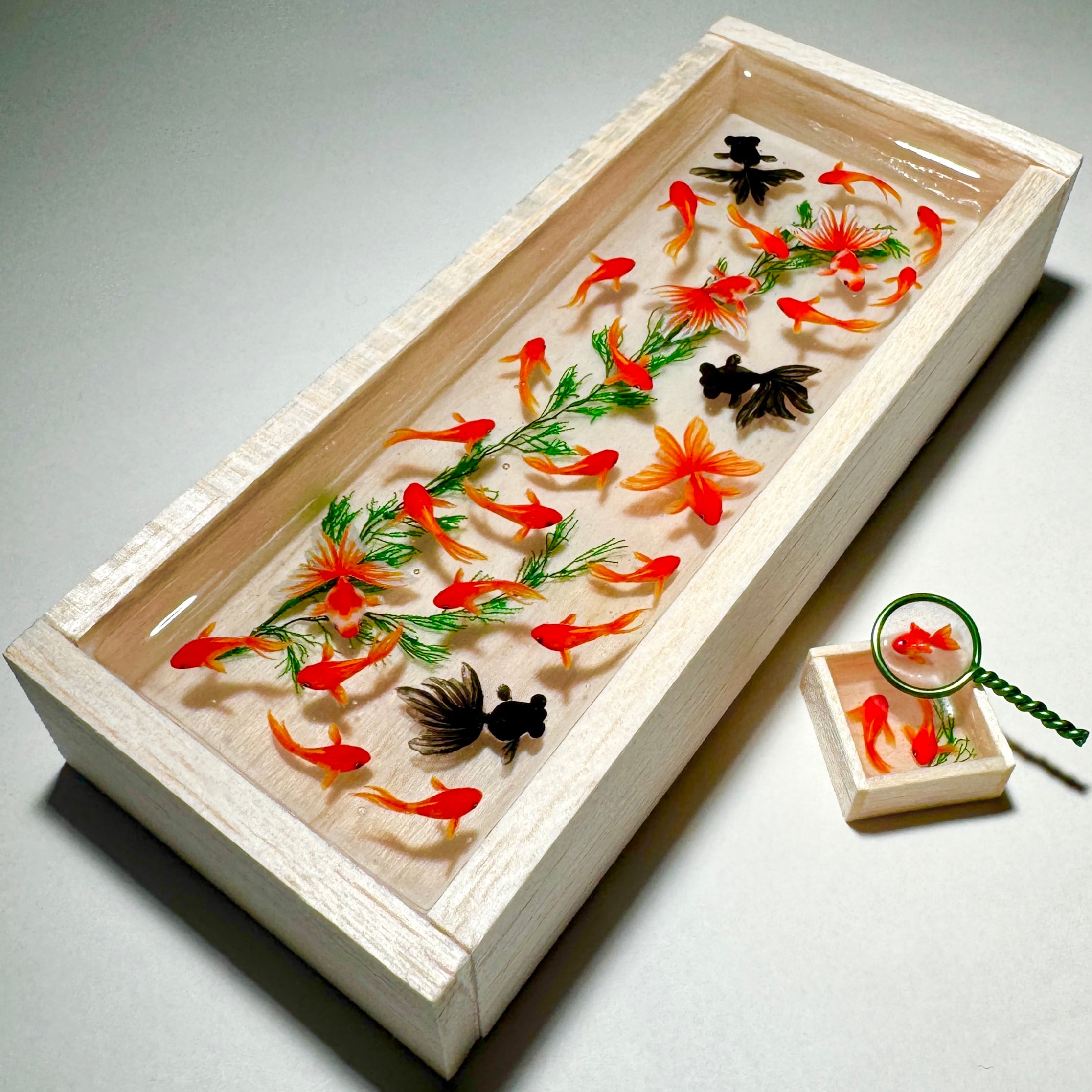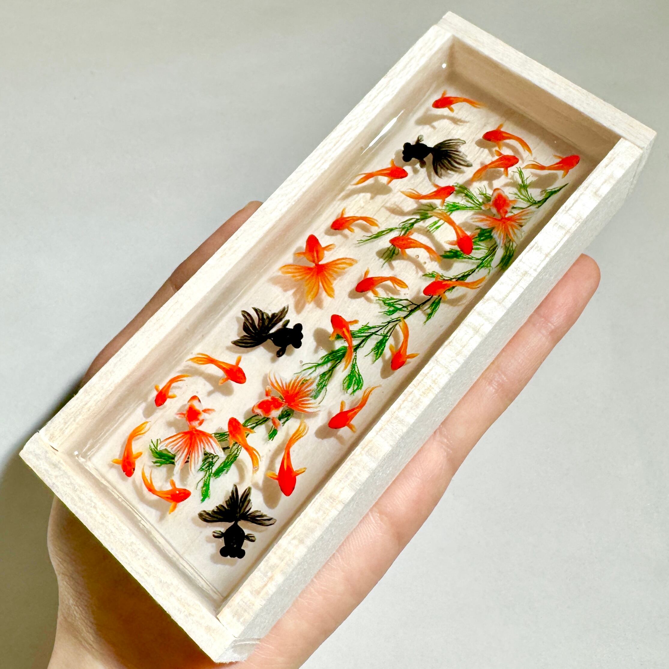 金魚はレジンを数層に分けて高低差をつけて配置しております。シールを封入したものではございませんので、立体感があり、横見も楽しんでいただけます。