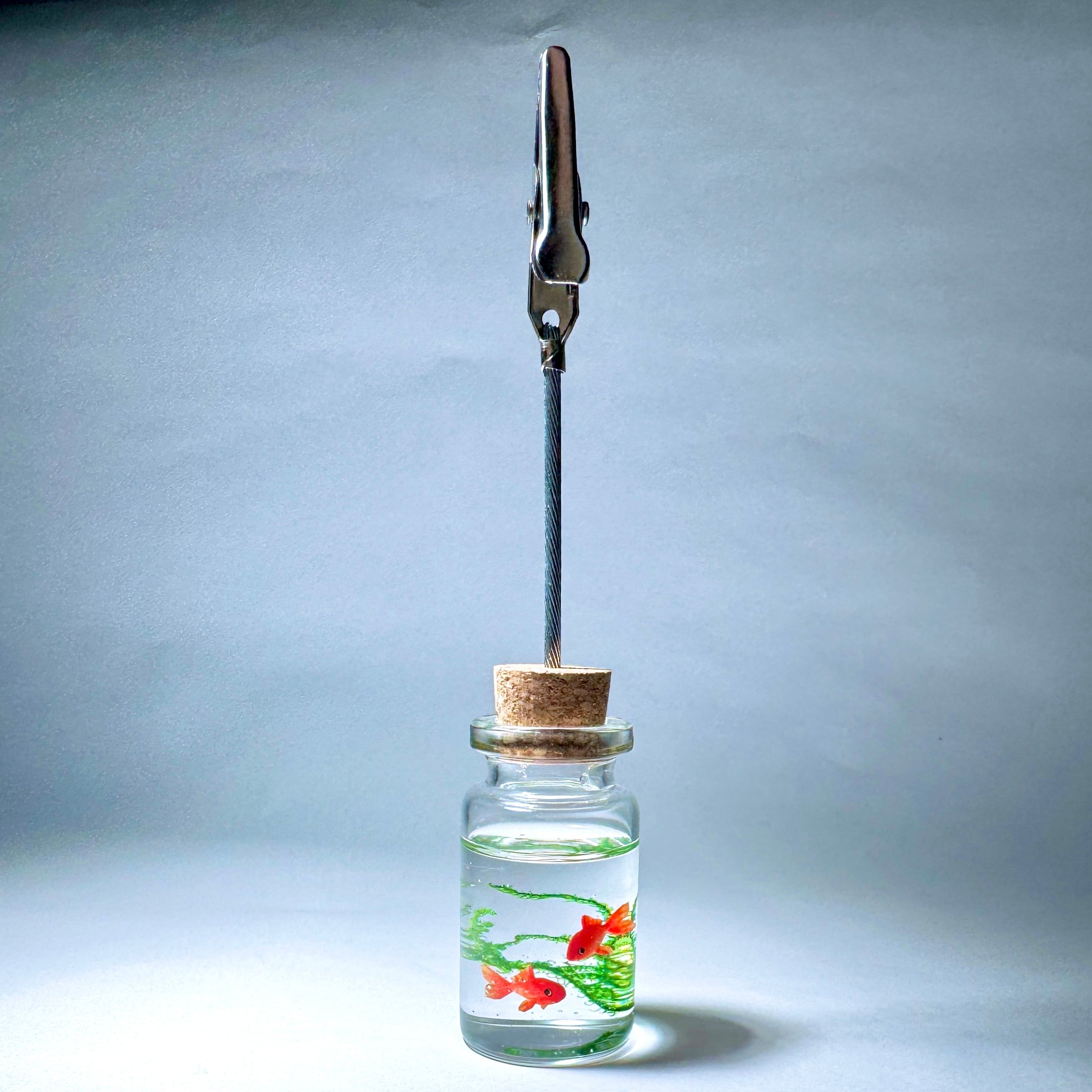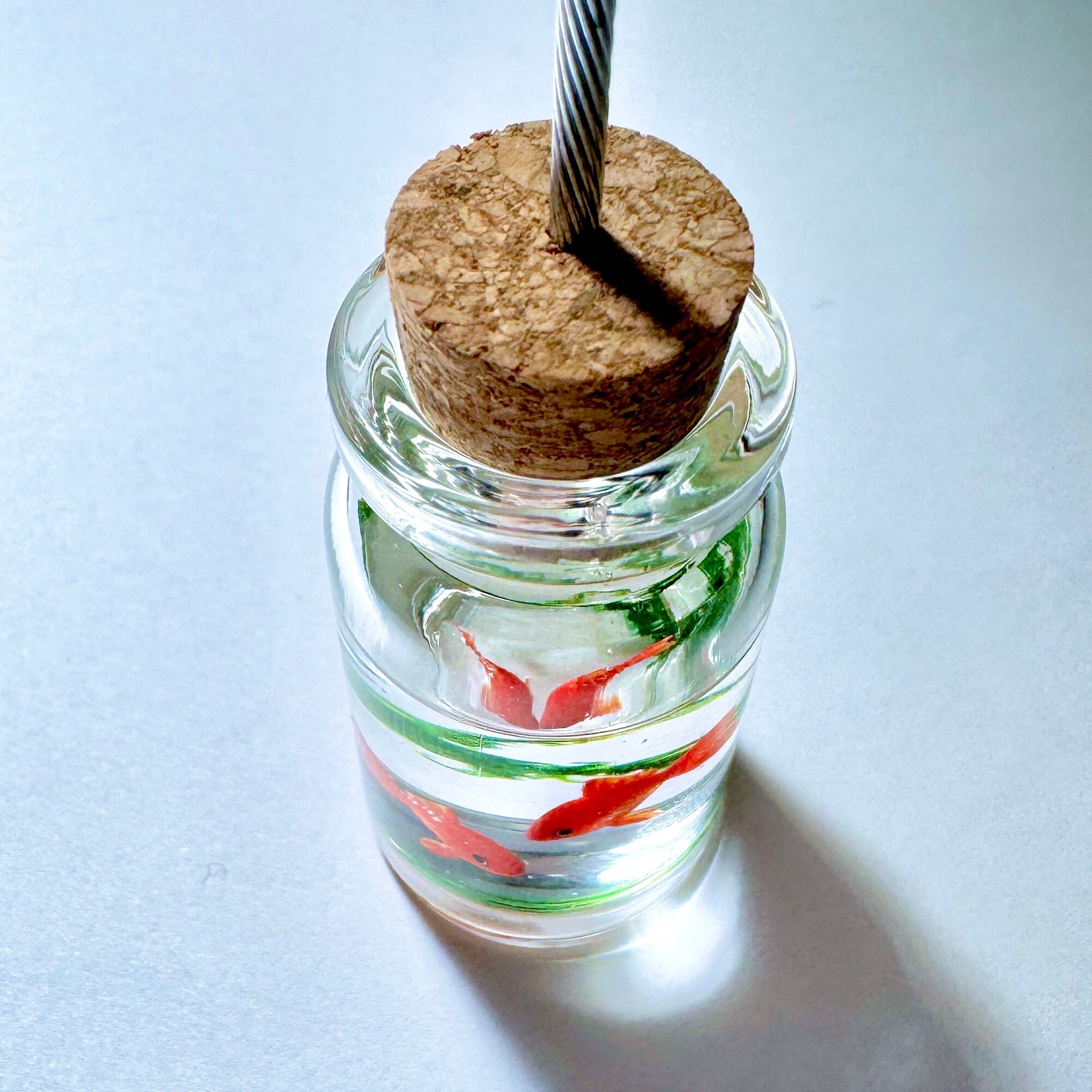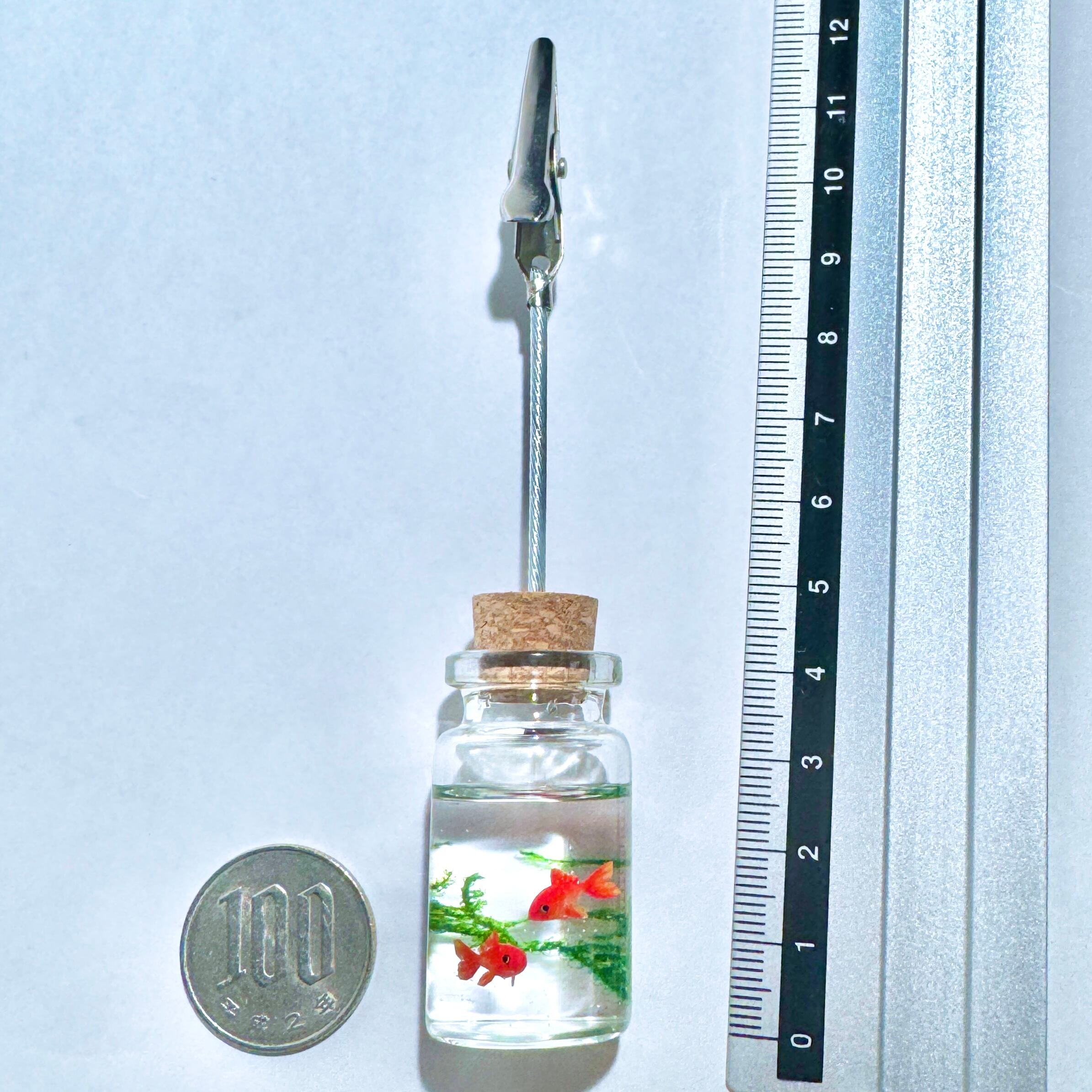 こちらはガラス製の小瓶に、和金を2匹泳がせたメモスタンドです。