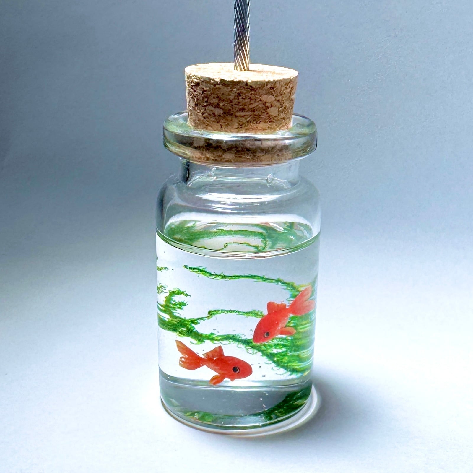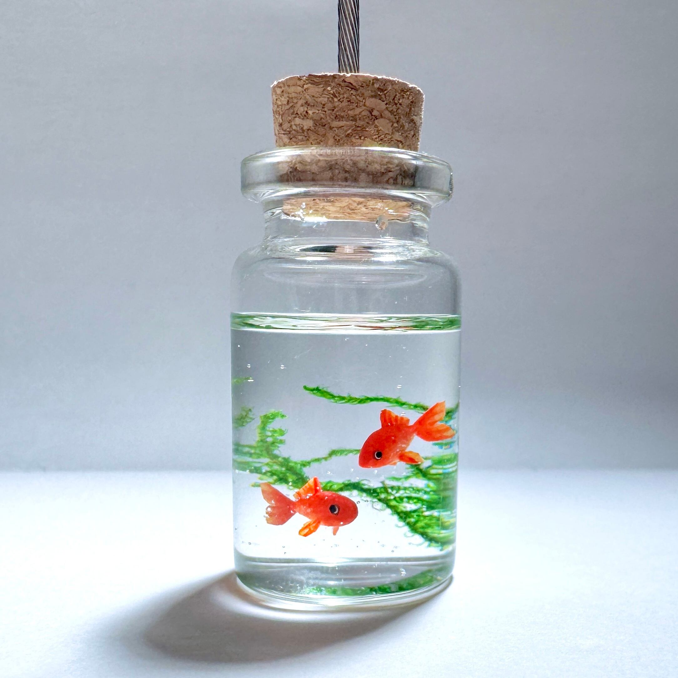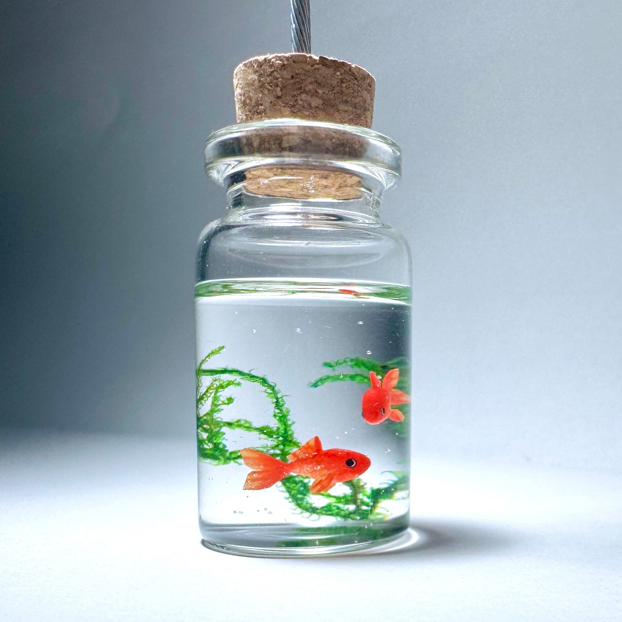 こちらはガラス製の小瓶に、和金を2匹泳がせたメモスタンドです。
