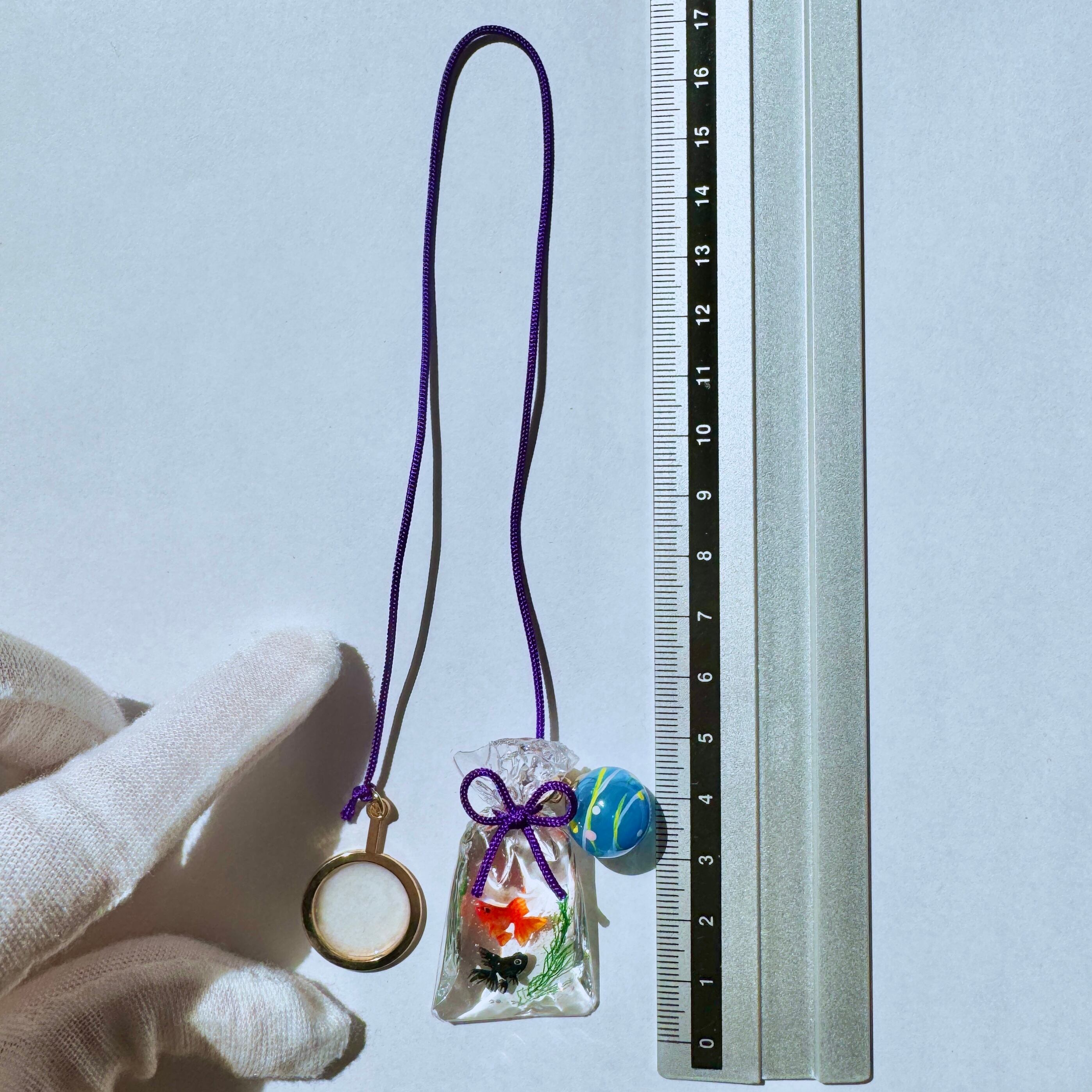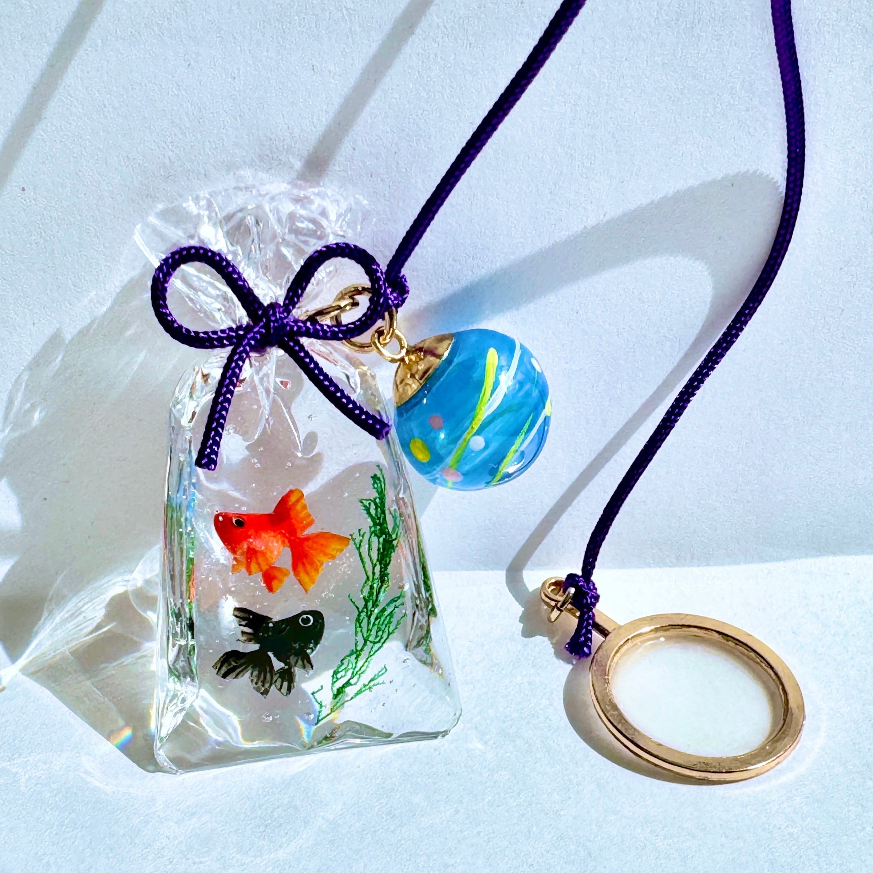 金魚袋に添えた水風船は絵柄も一つずつ手描きいたしました。