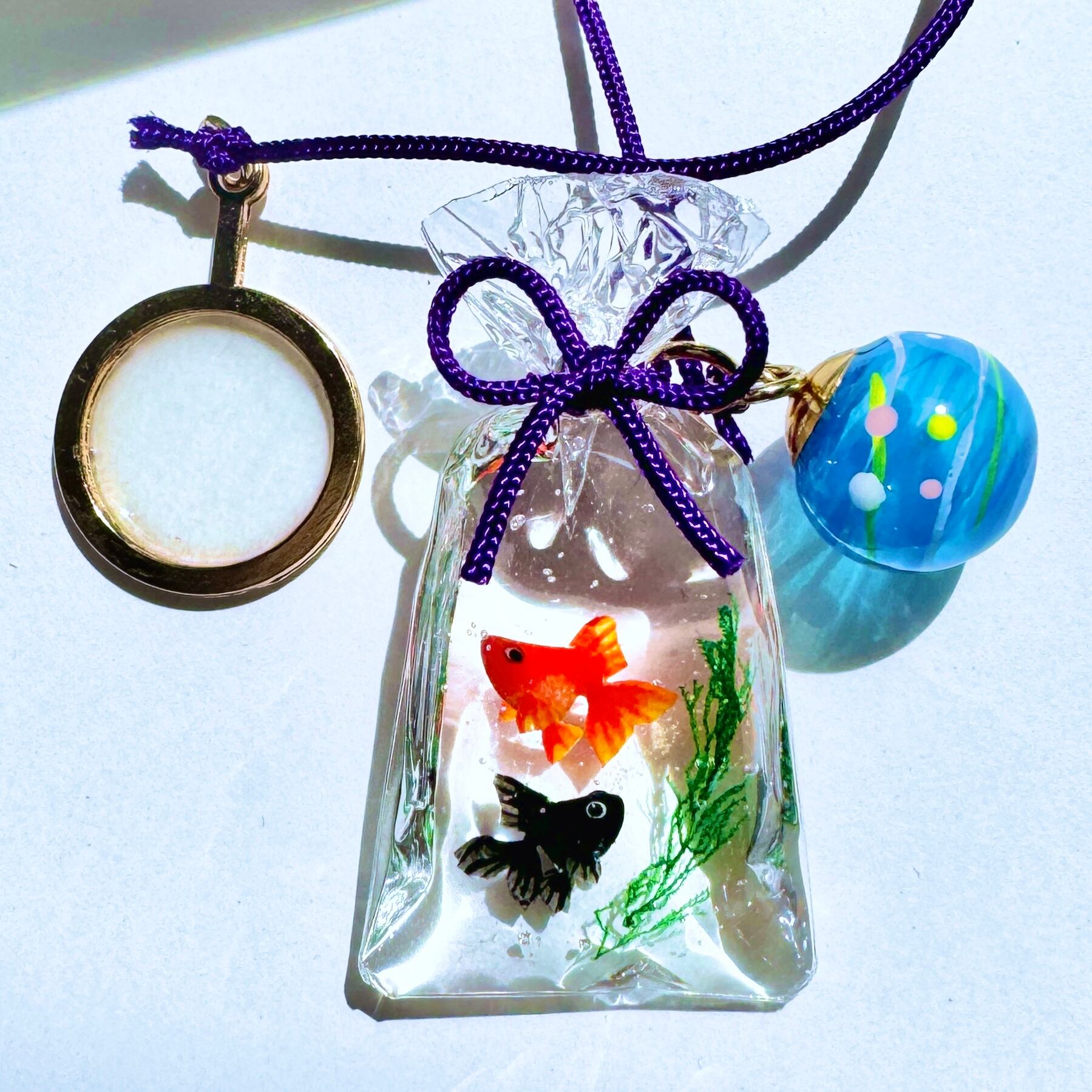 金魚も一匹ずつ型を使わずに造形し、小さな目をつけ、ヒレを描いておりますので、体の大きさやお顔や模様などお写真と若干異なります。