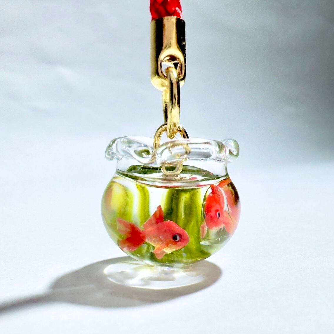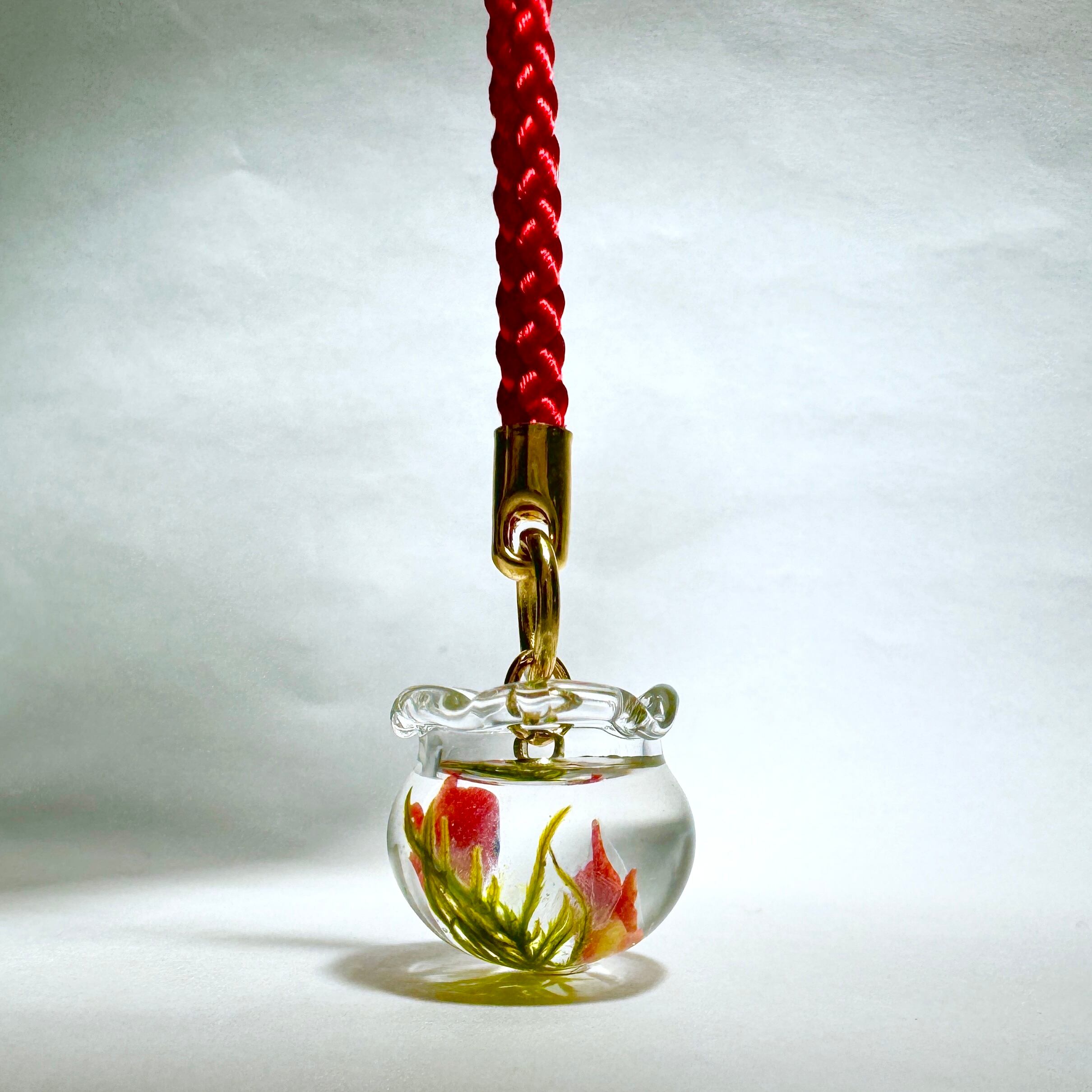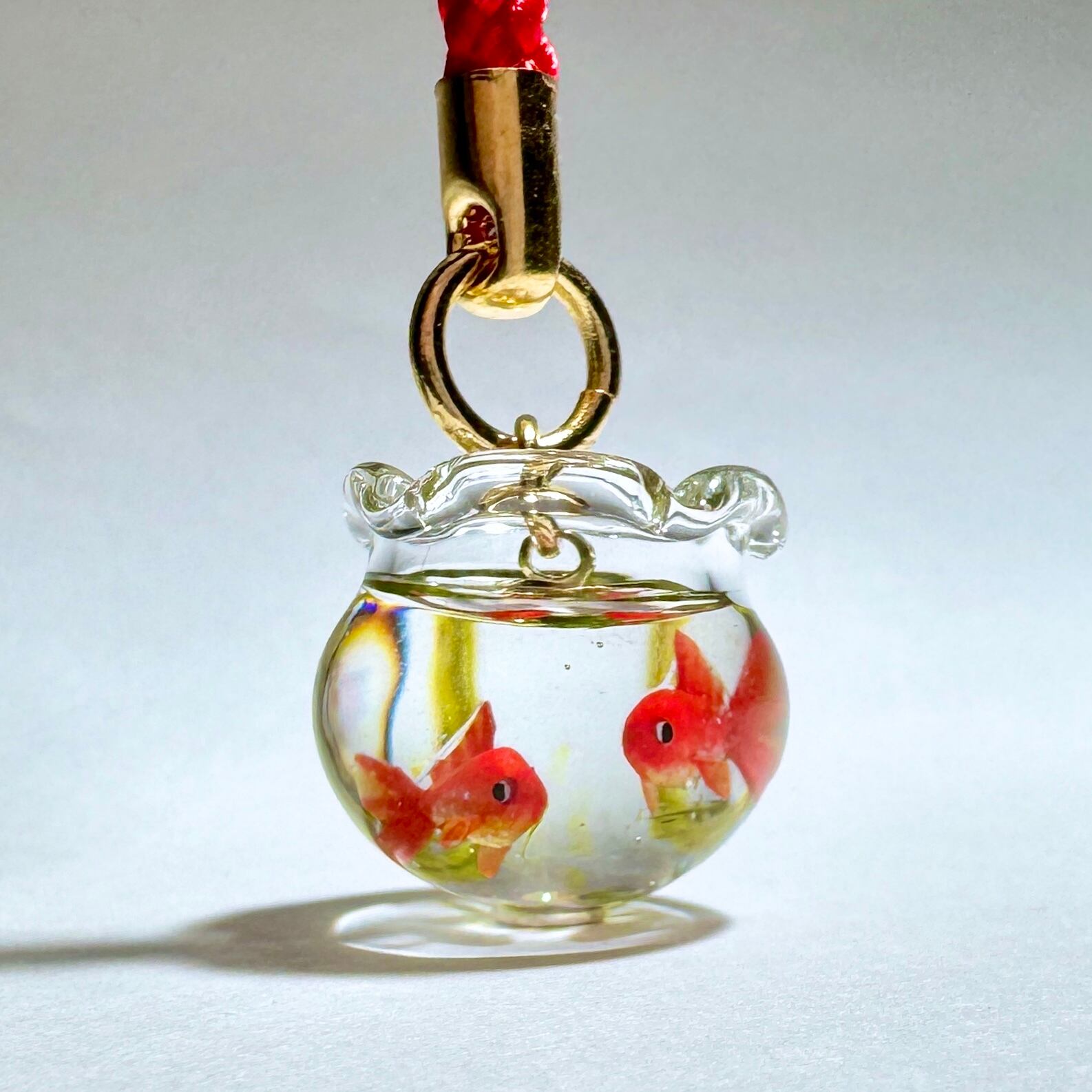 硝子の金魚鉢で泳ぐ金魚 小(和金二匹) 根付 帯飾り ストラップ ミニチュア