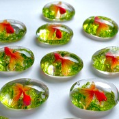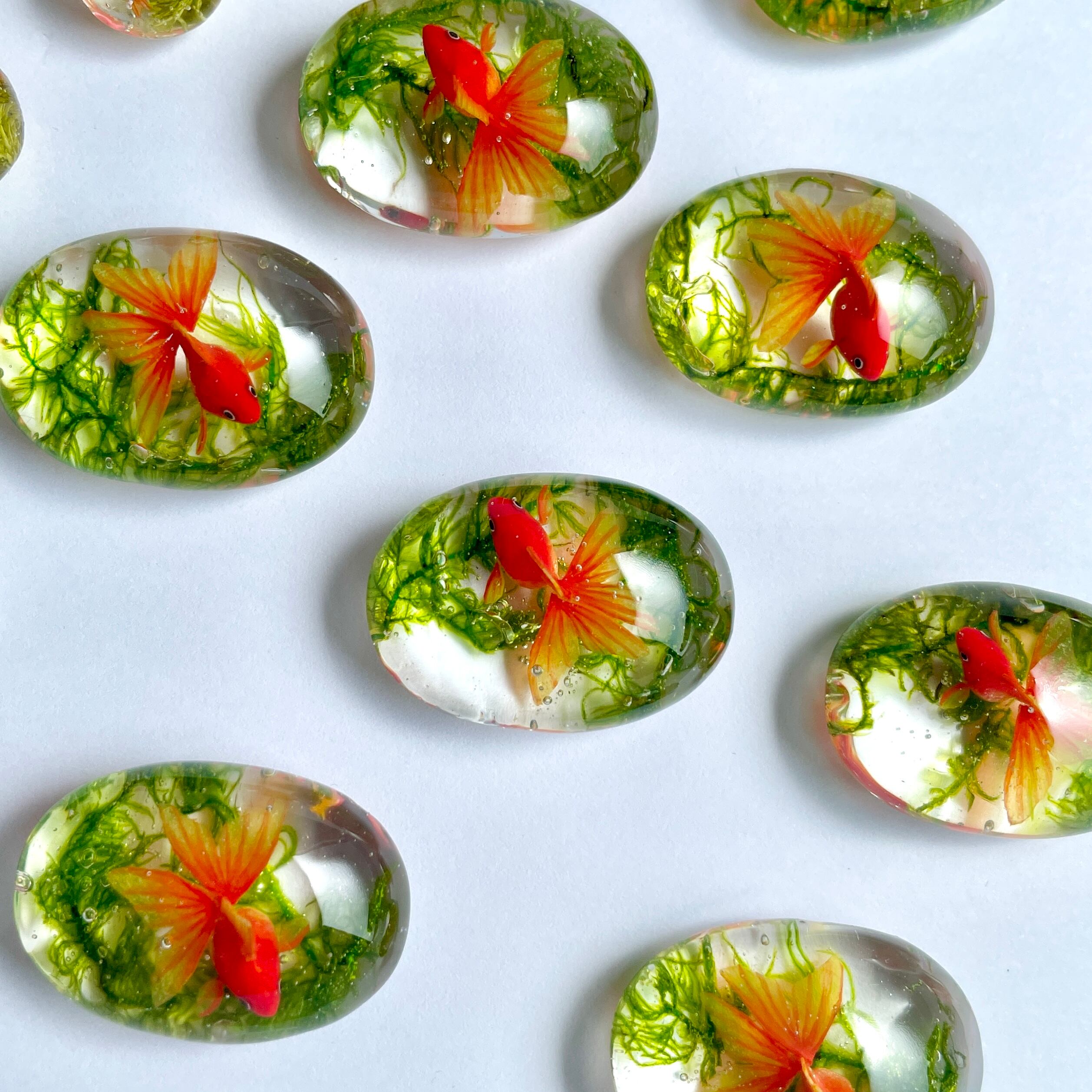金魚も一匹ずつ型を使わずに造形し、小さな目をつけ、ヒレを描いておりますので、体の大きさやお顔や模様などお写真と若干異なります。