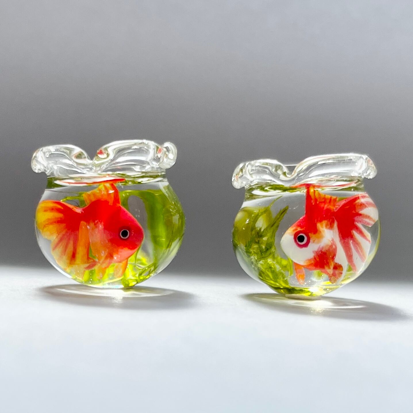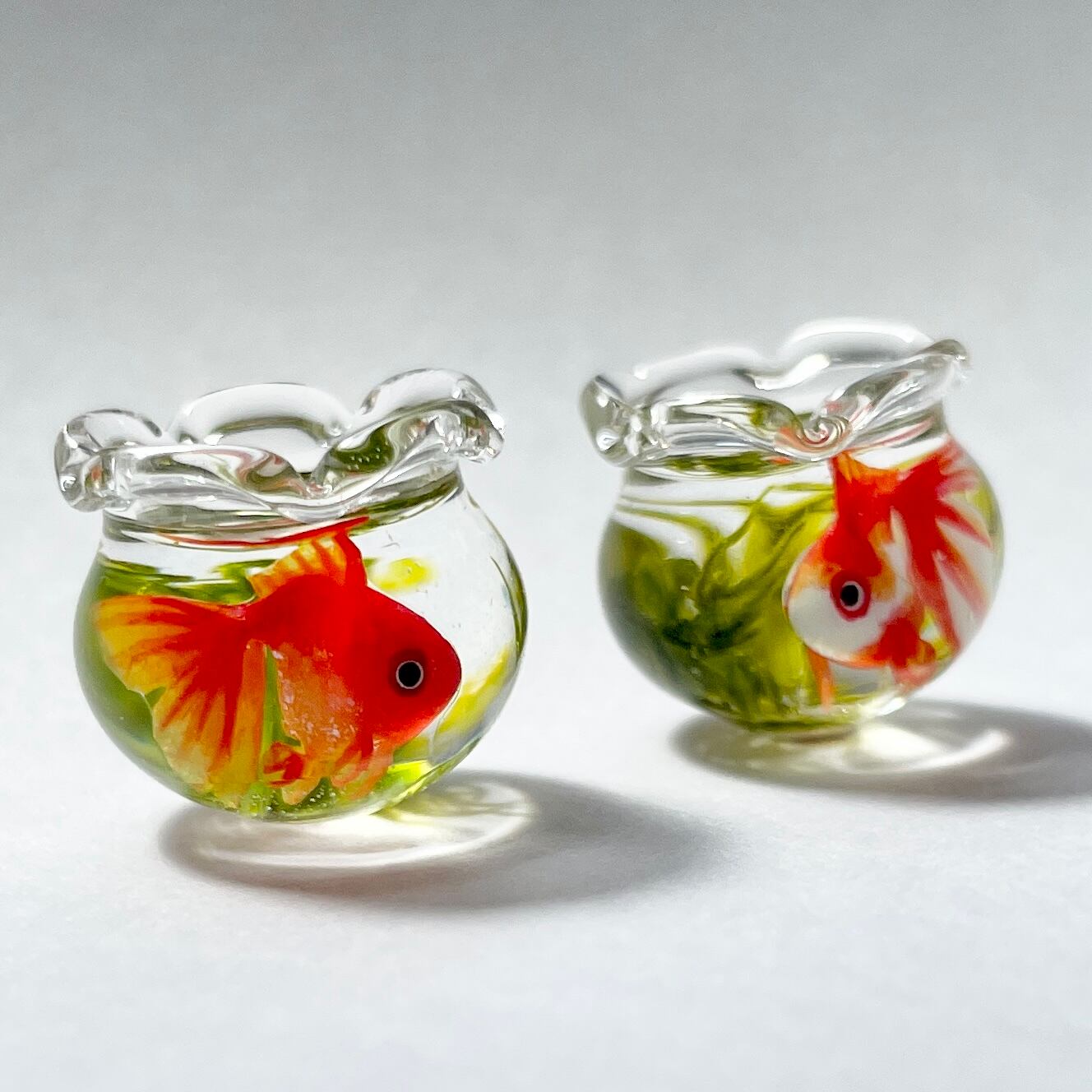 金魚も一匹ずつ型を使わずに造形し、小さな目をつけ、ヒレを描いておりますので、体の大きさやお顔や模様などお写真と若干異なります。