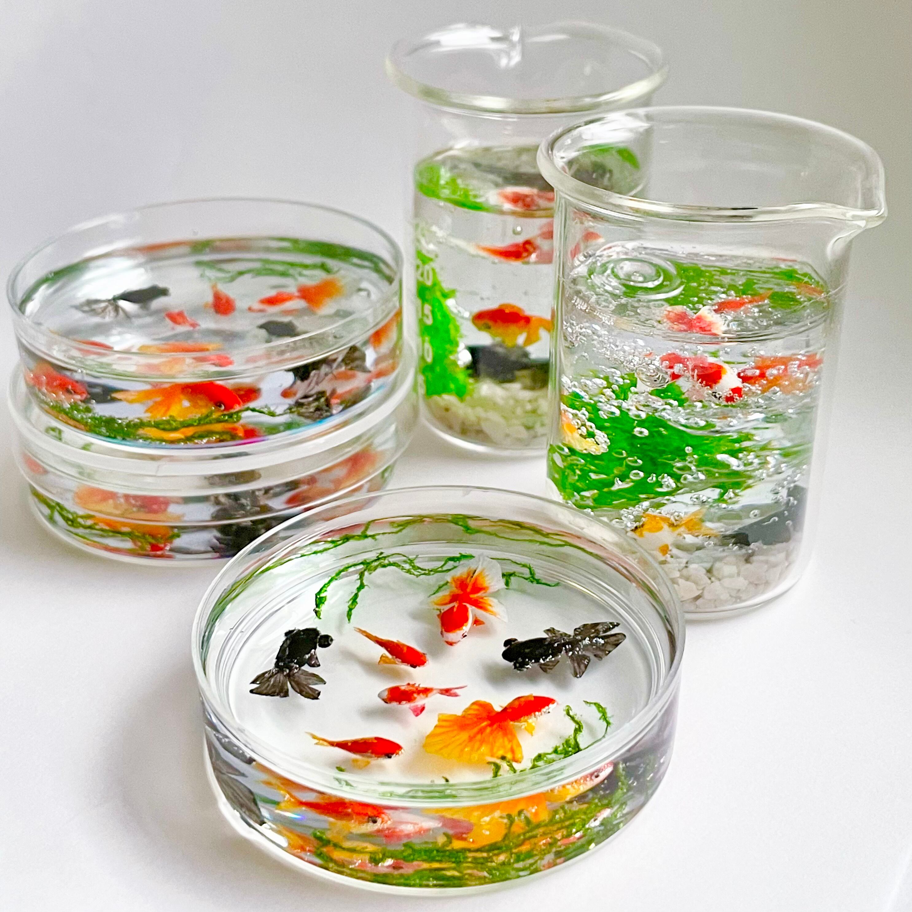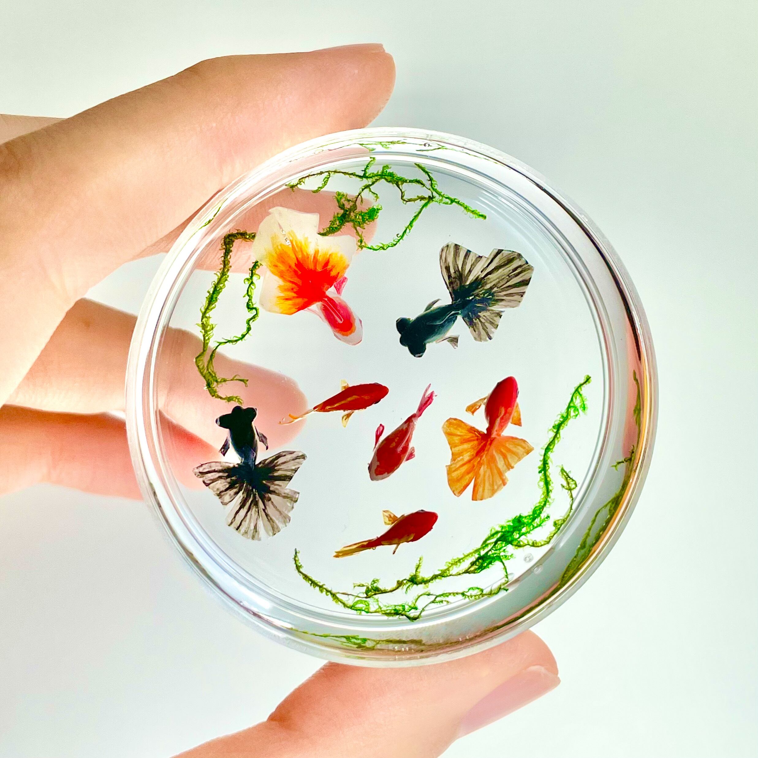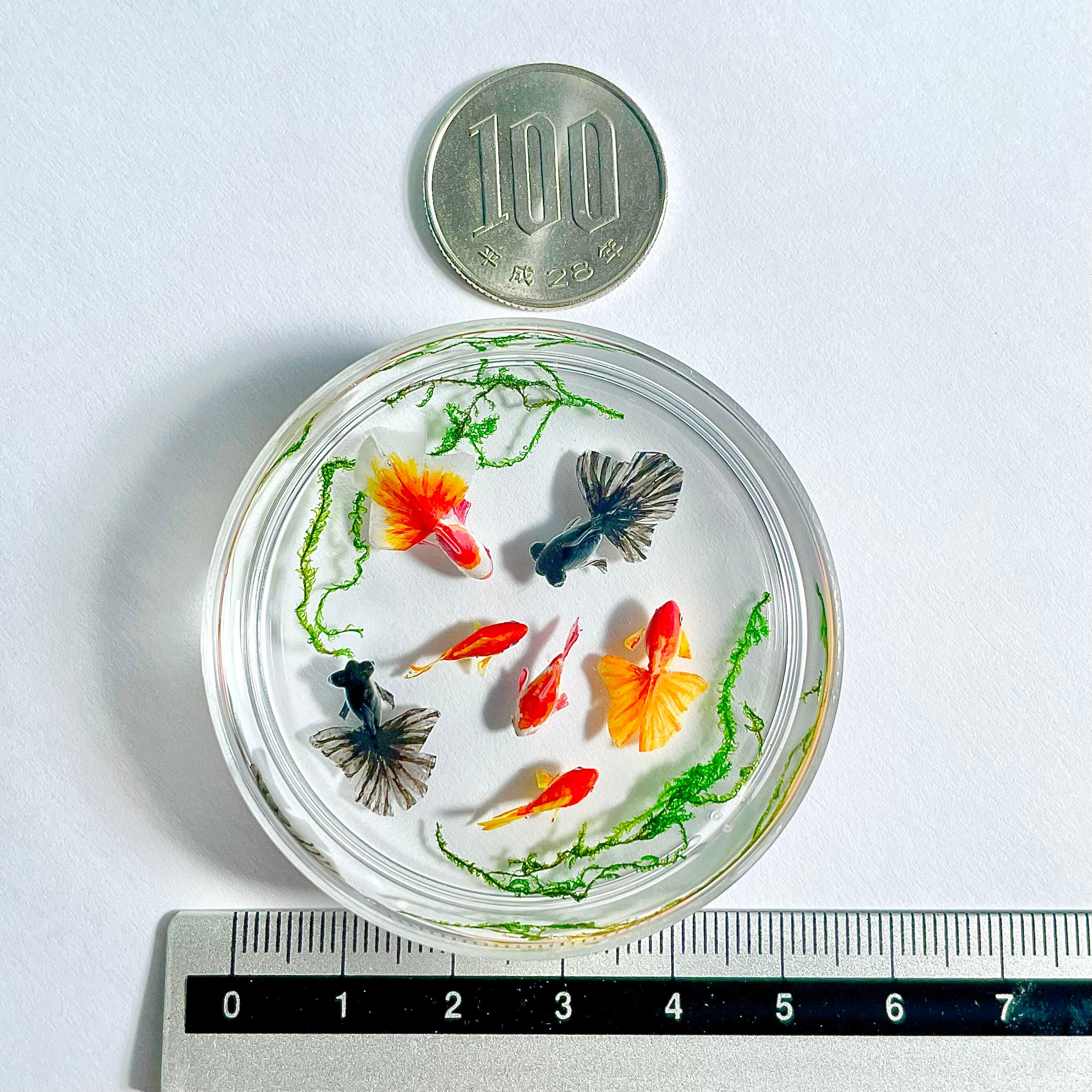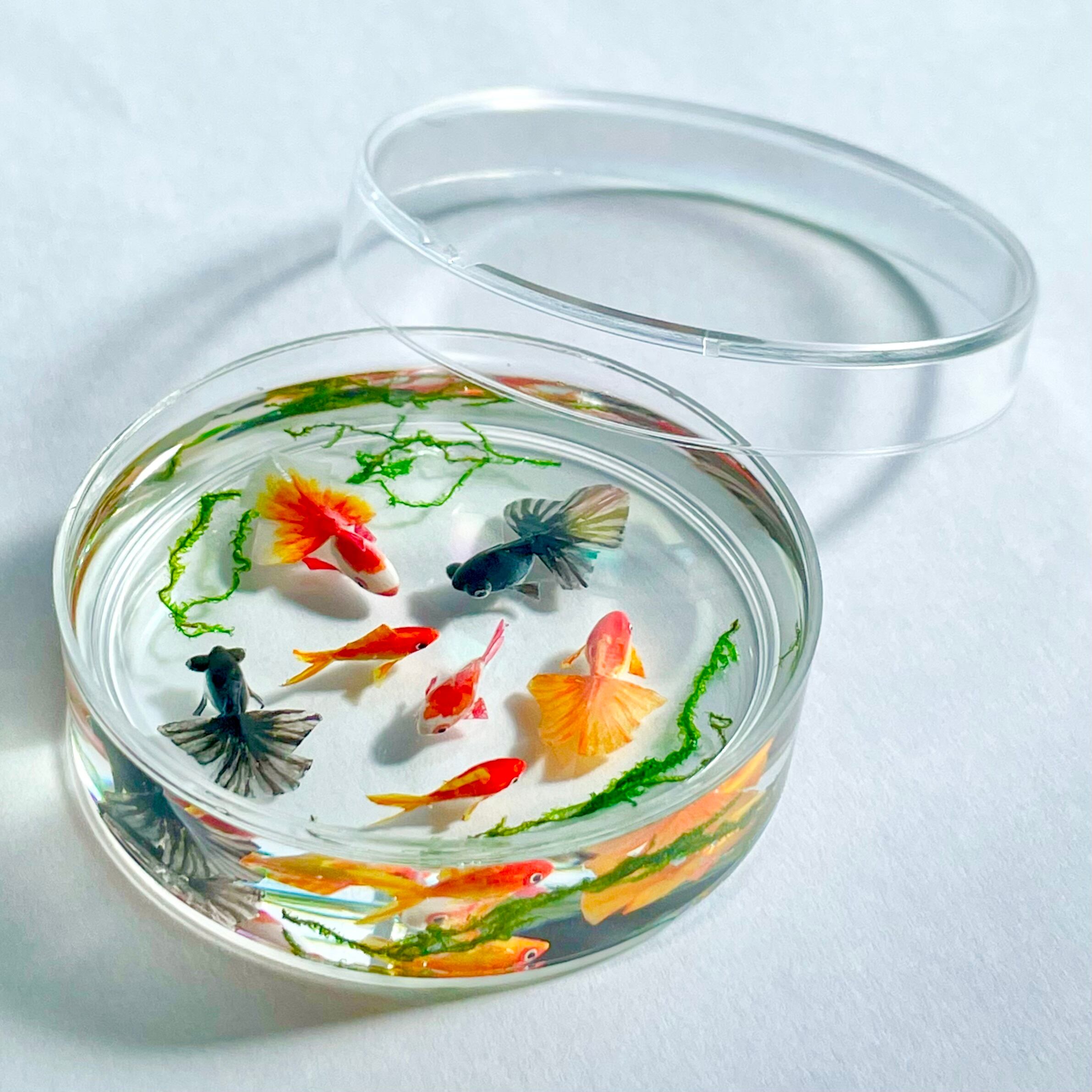 シャーレで泳ぐ金魚(琉金 赤、琉金 紅白、和金 赤、和金 紅白、出目金) ミニチュア インテリア雑貨