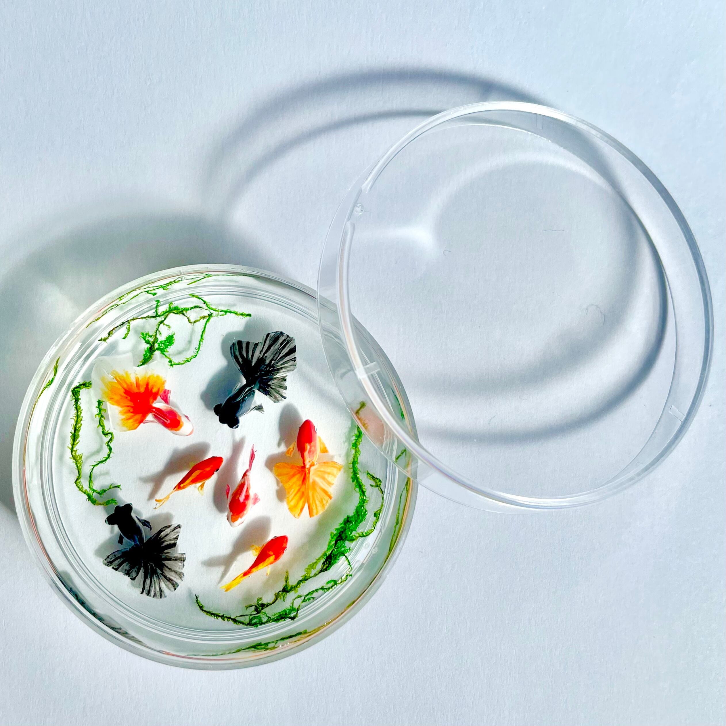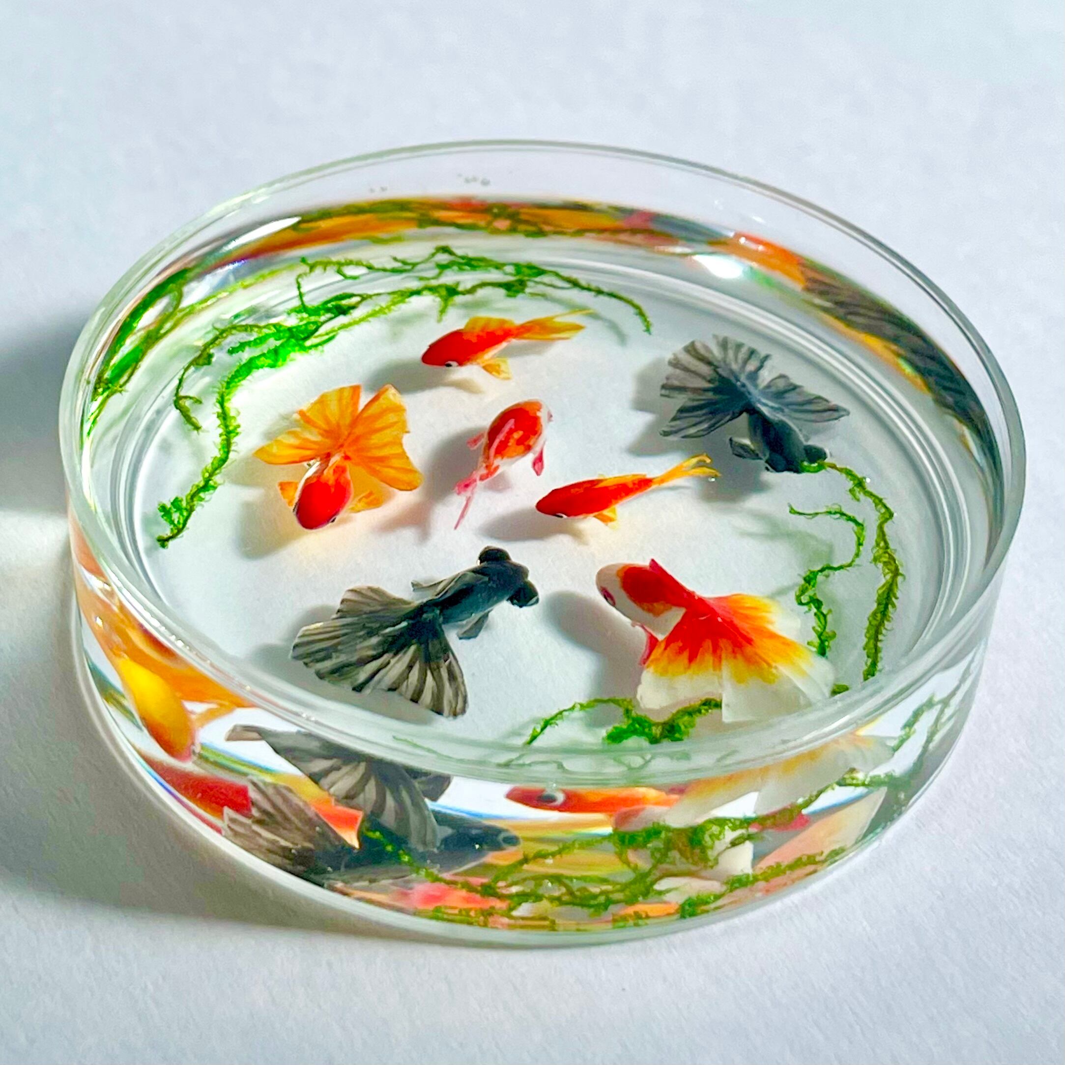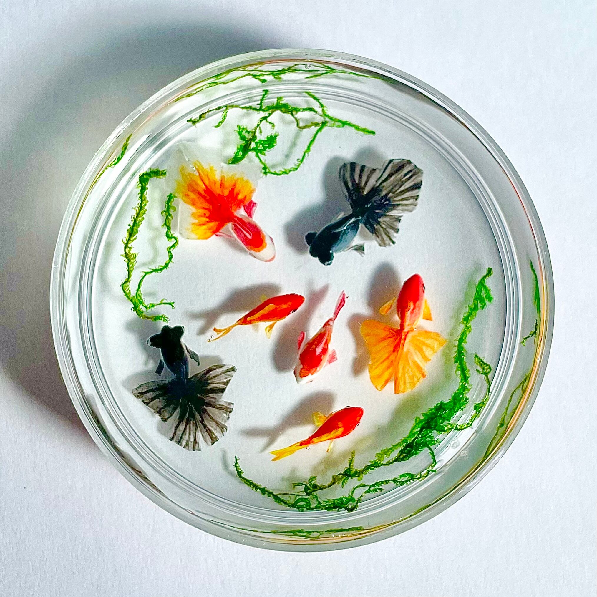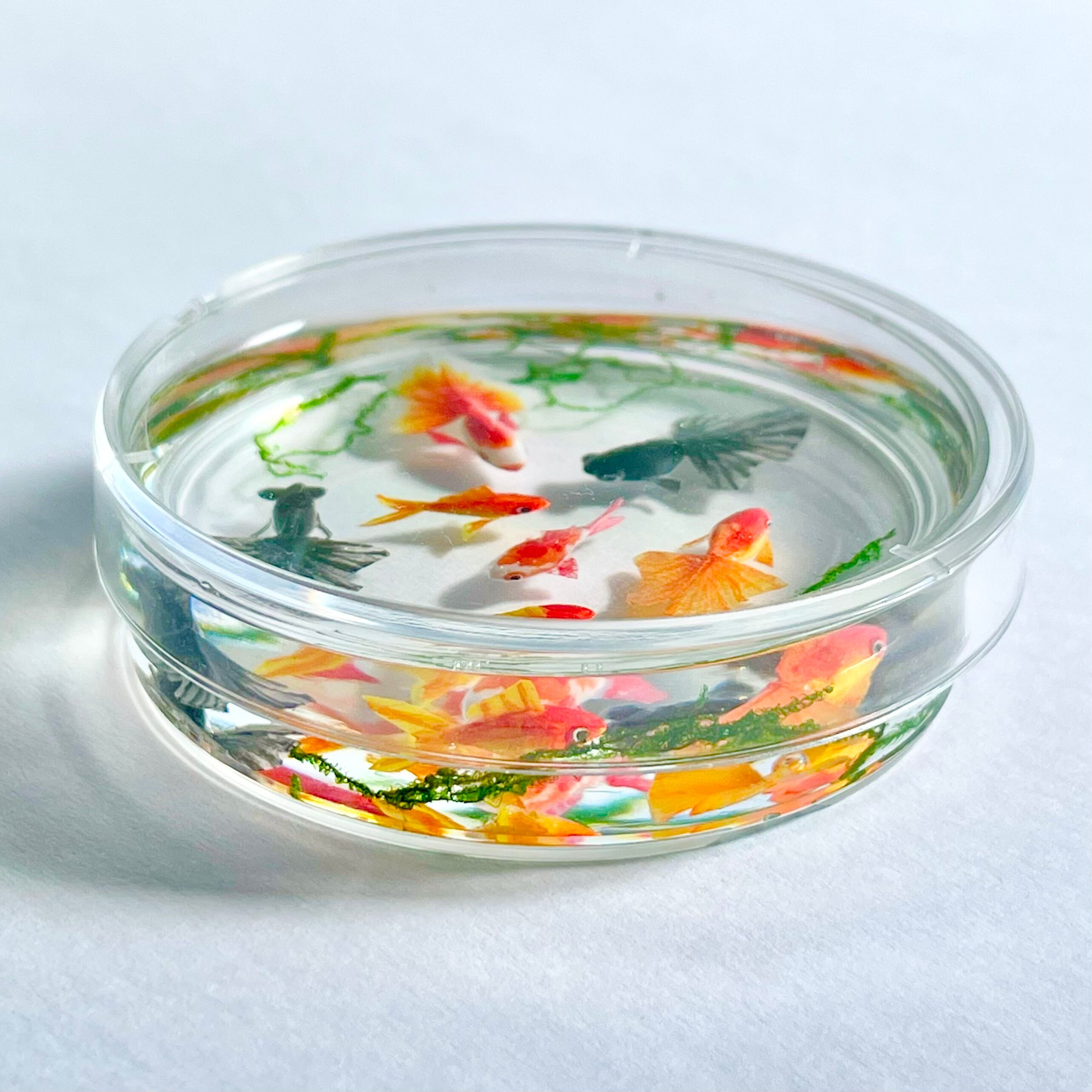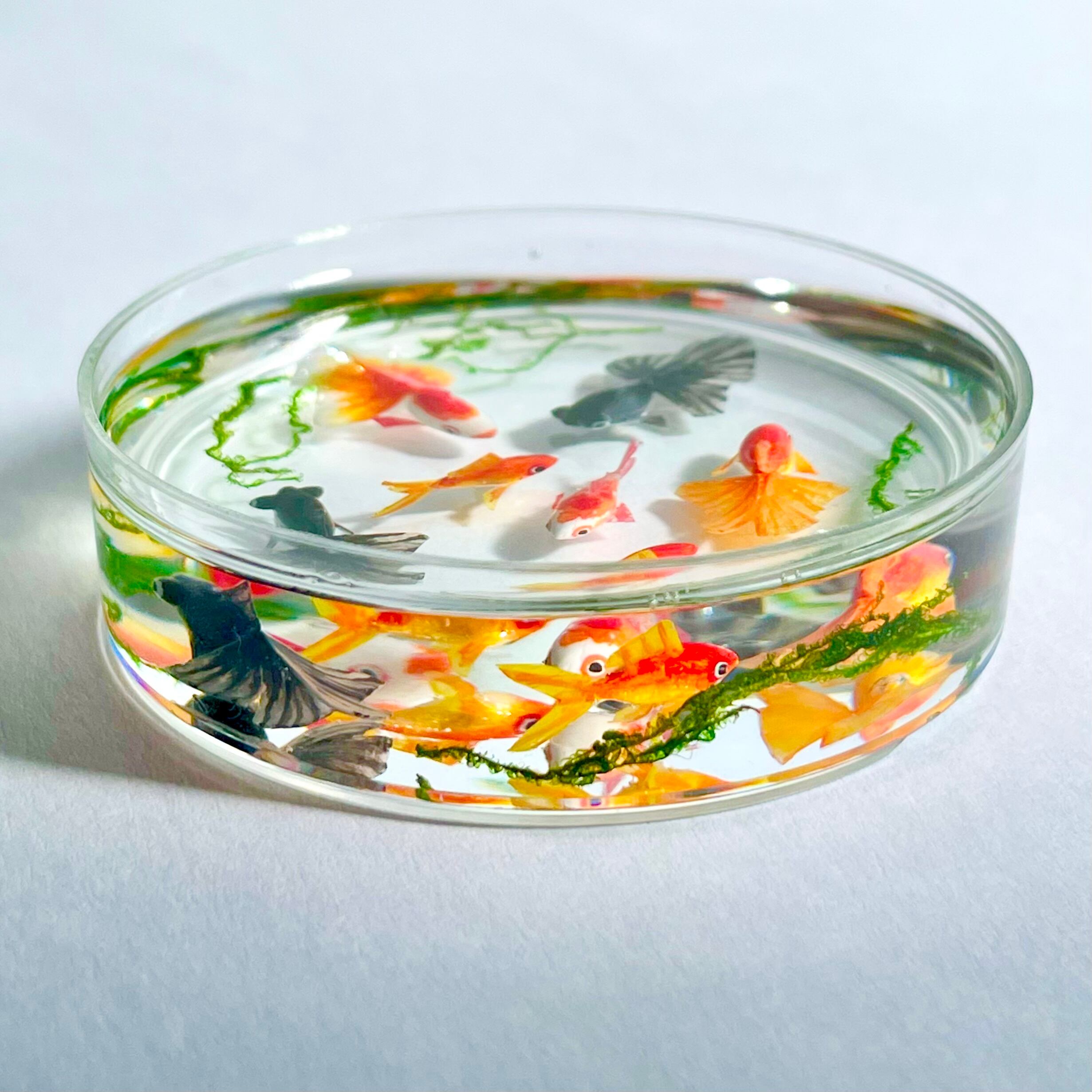シャーレで泳ぐ金魚(琉金 赤、琉金 紅白、和金 赤、和金 紅白、出目金) ミニチュア インテリア雑貨