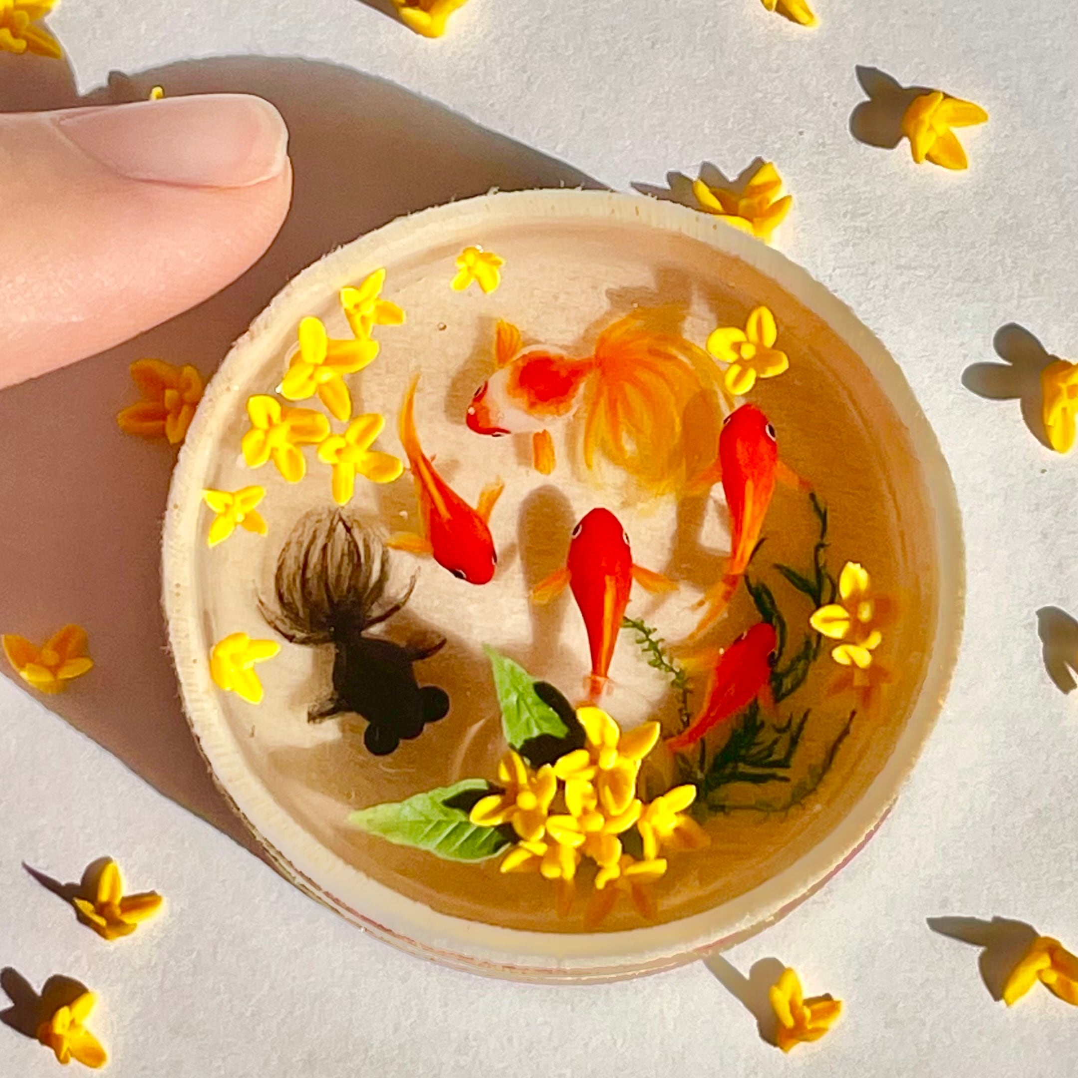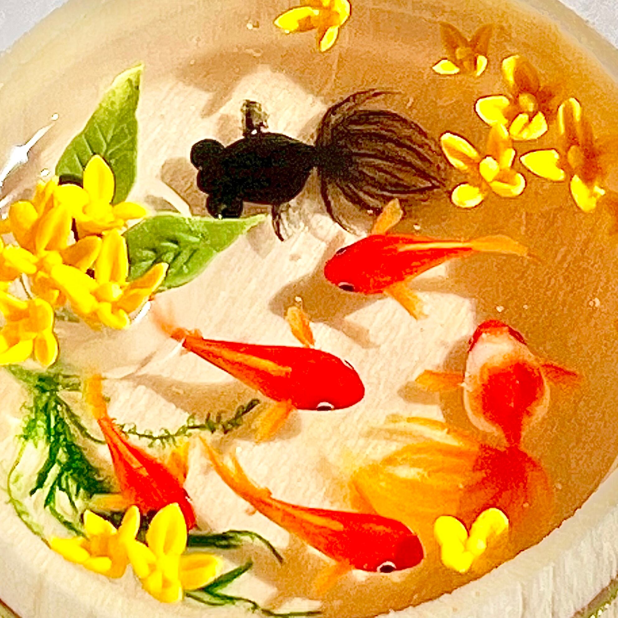 金魚も一匹ずつ型を使わずに造形し、小さな目をつけ、ヒレを描いておりますので、体の大きさやお顔や模様などお写真と若干異なります。