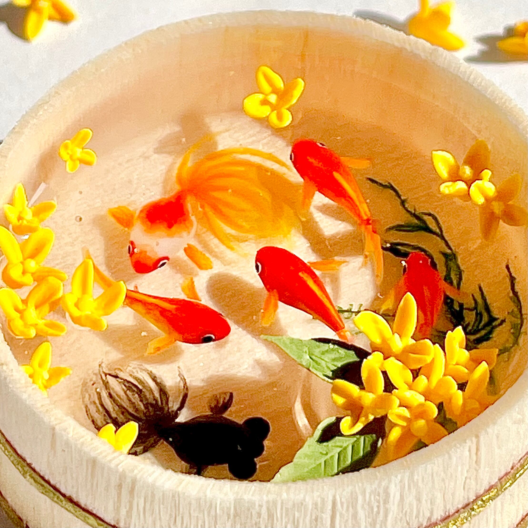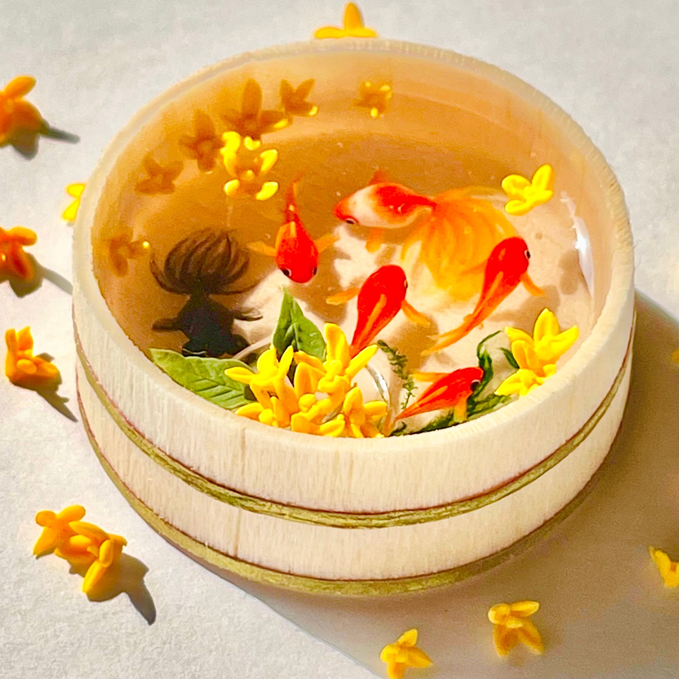 金魚は脂粘土で一匹ずつ、桶の中で美しく見えるサイズに造形いたしました。