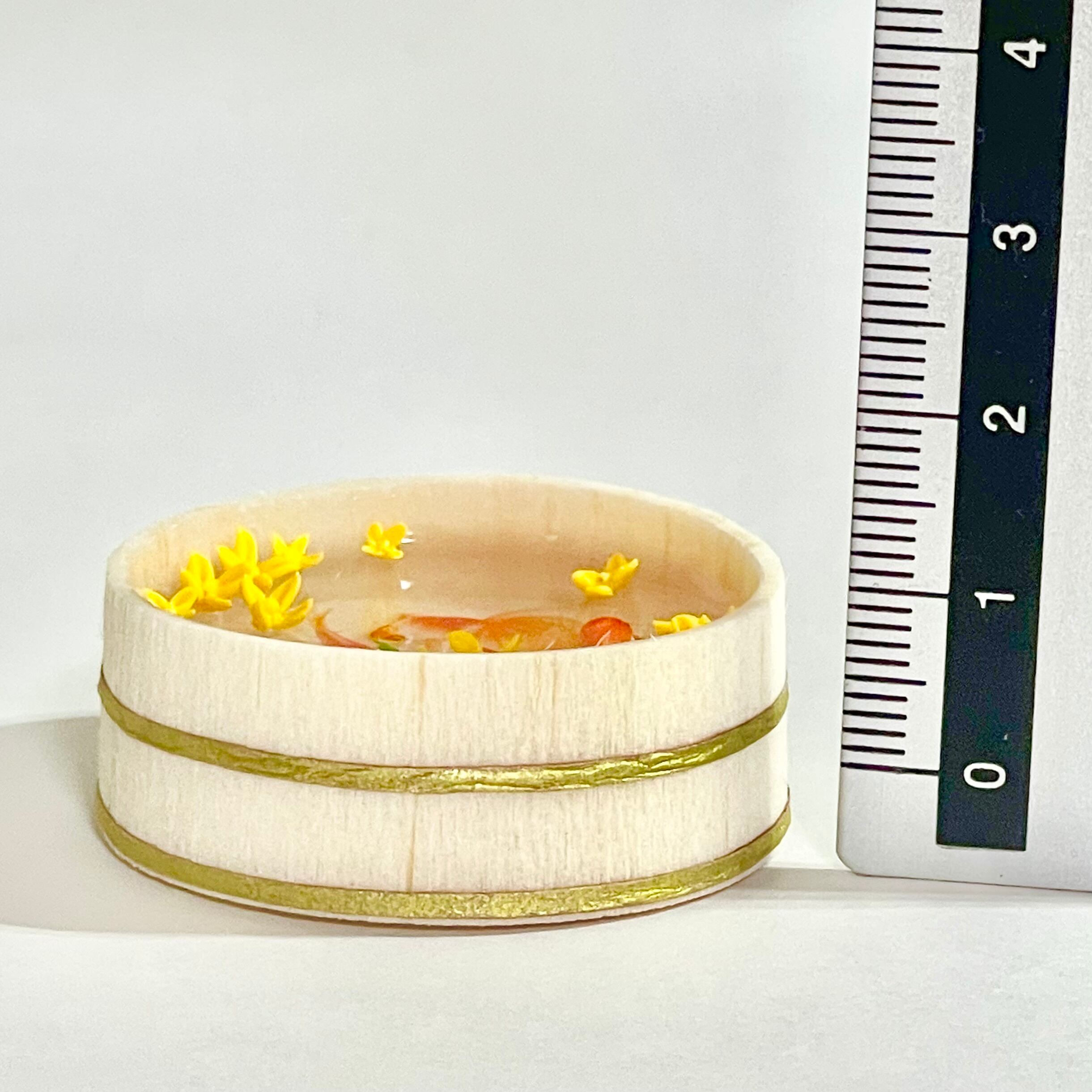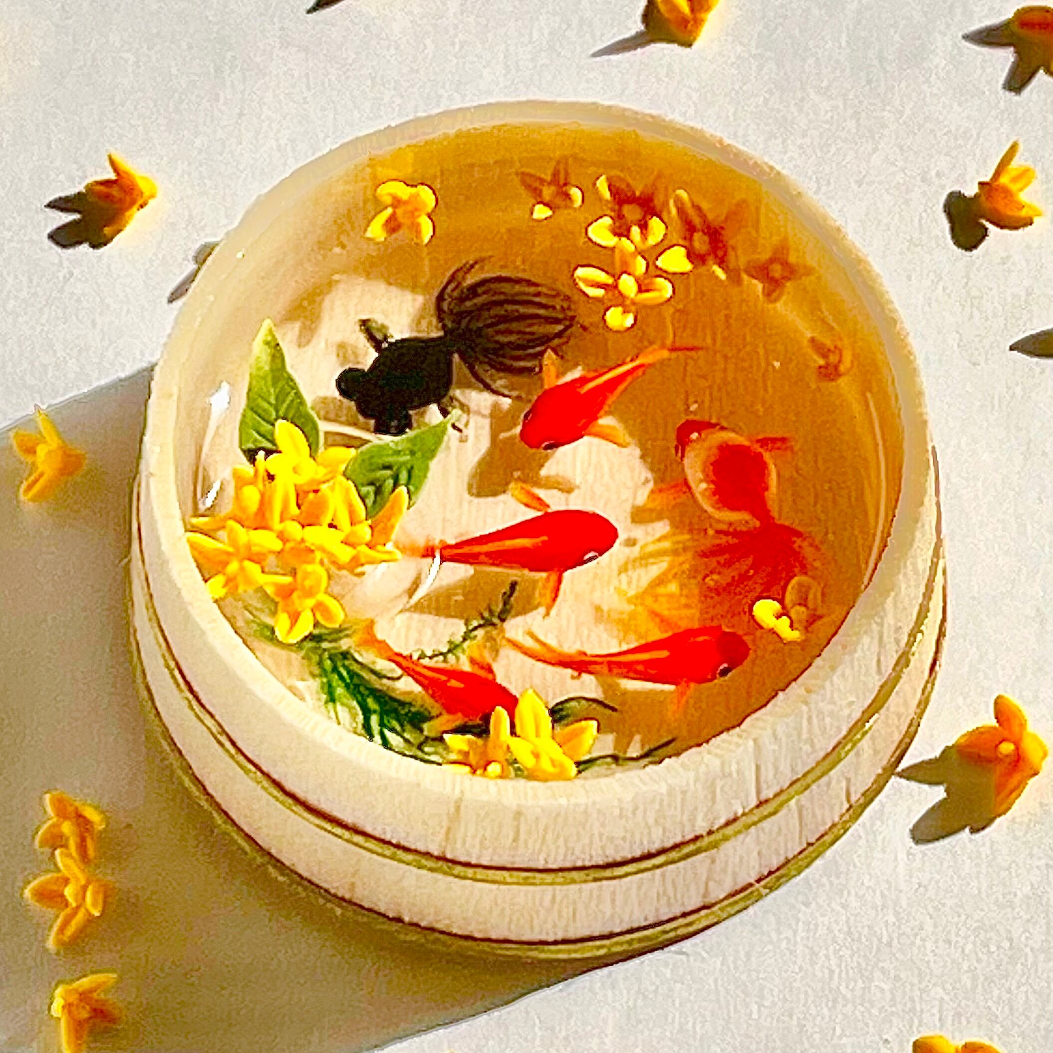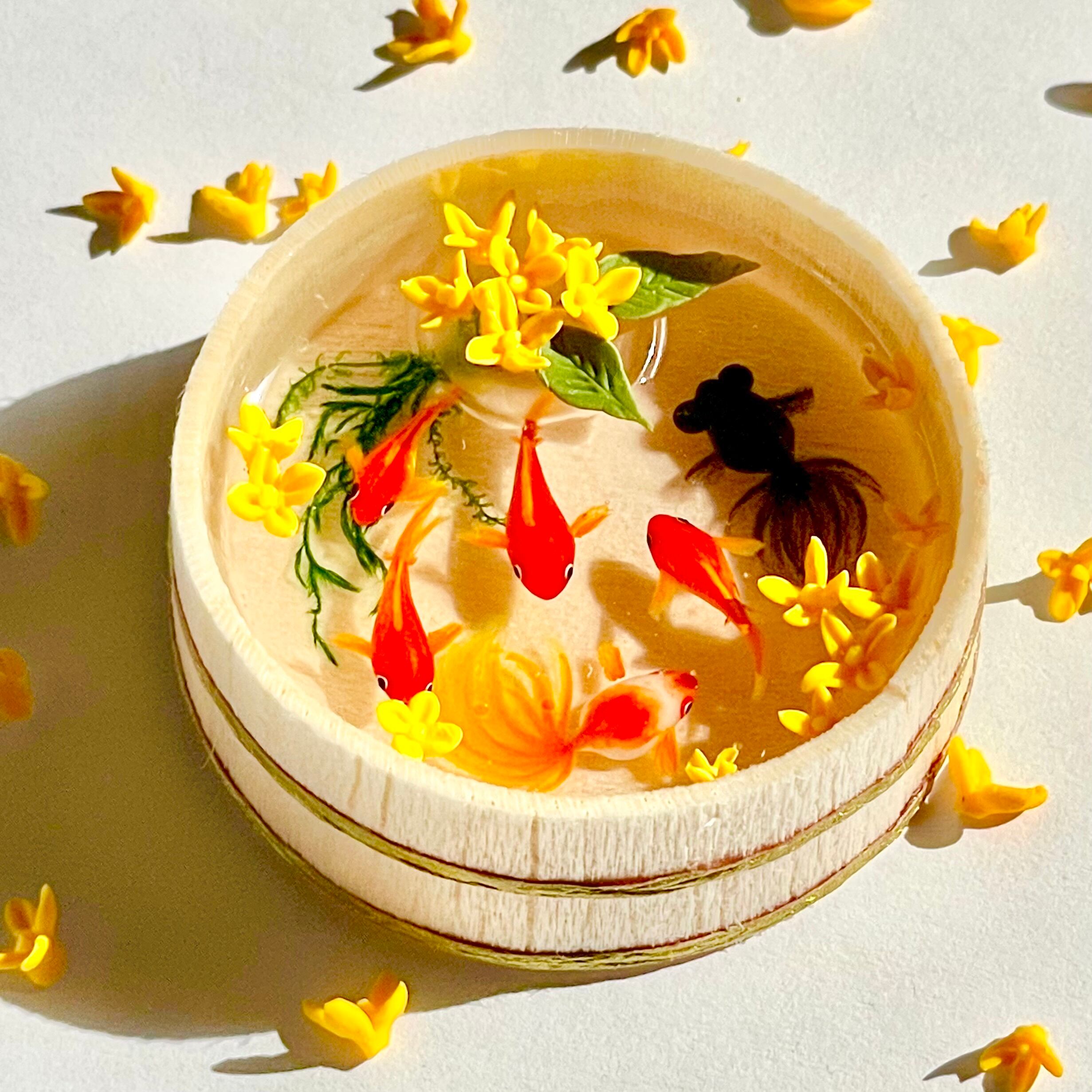 こちらはキンモクセイの浮かぶ木桶に金魚が泳ぐミニチュア桶です。
