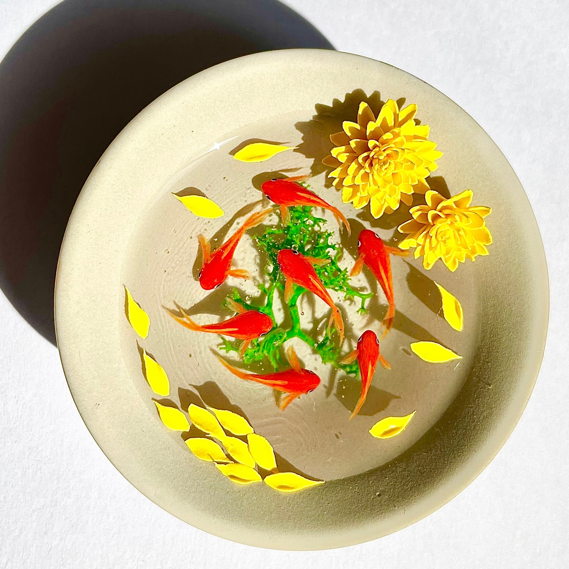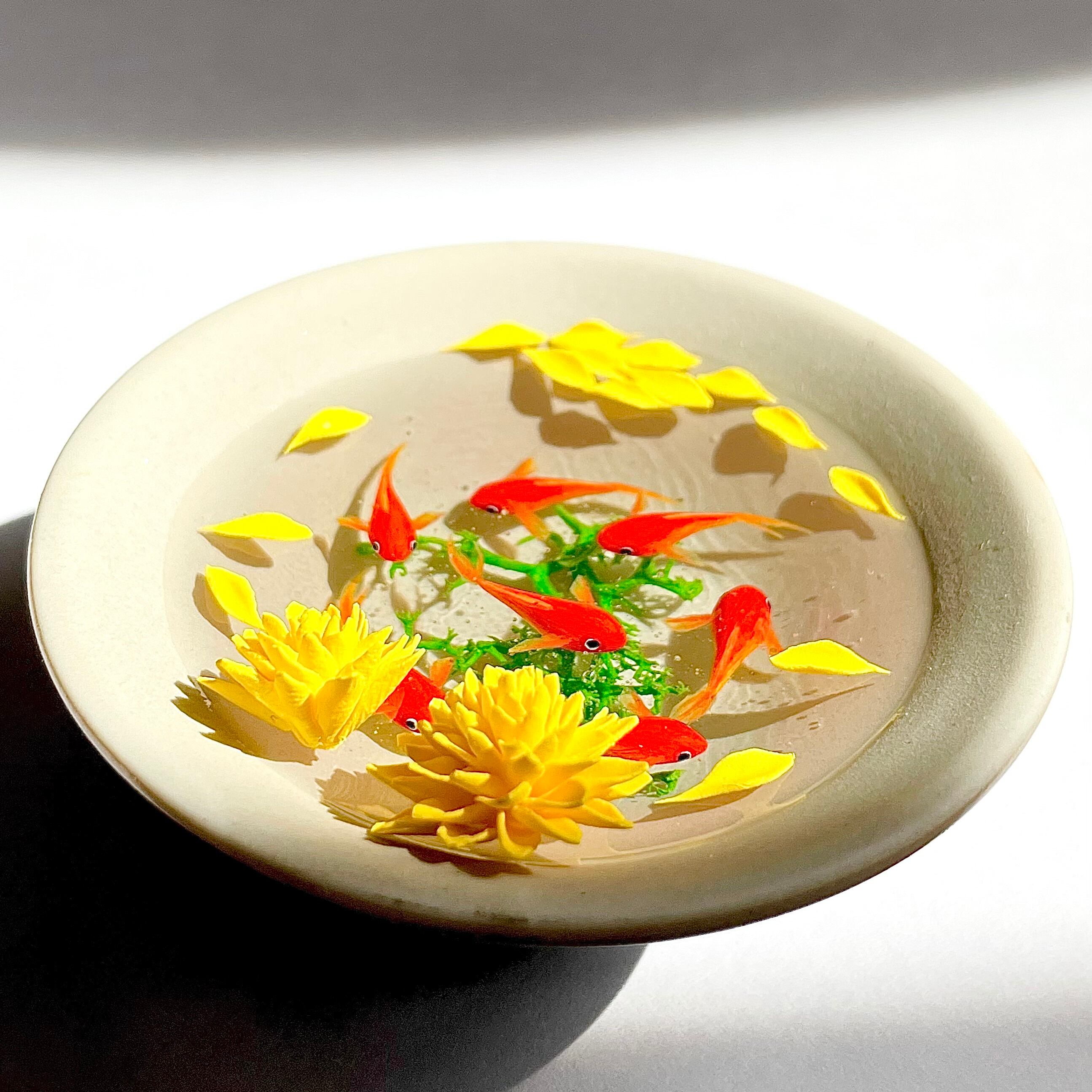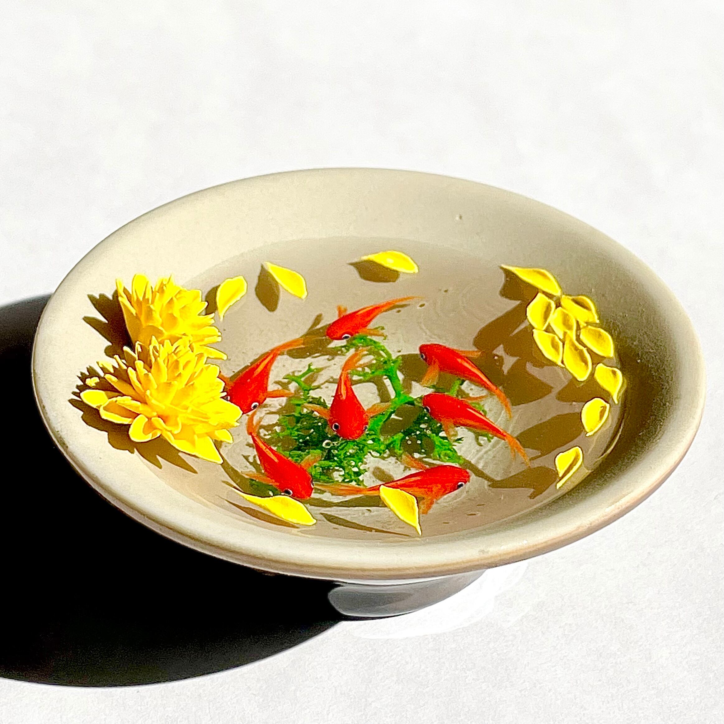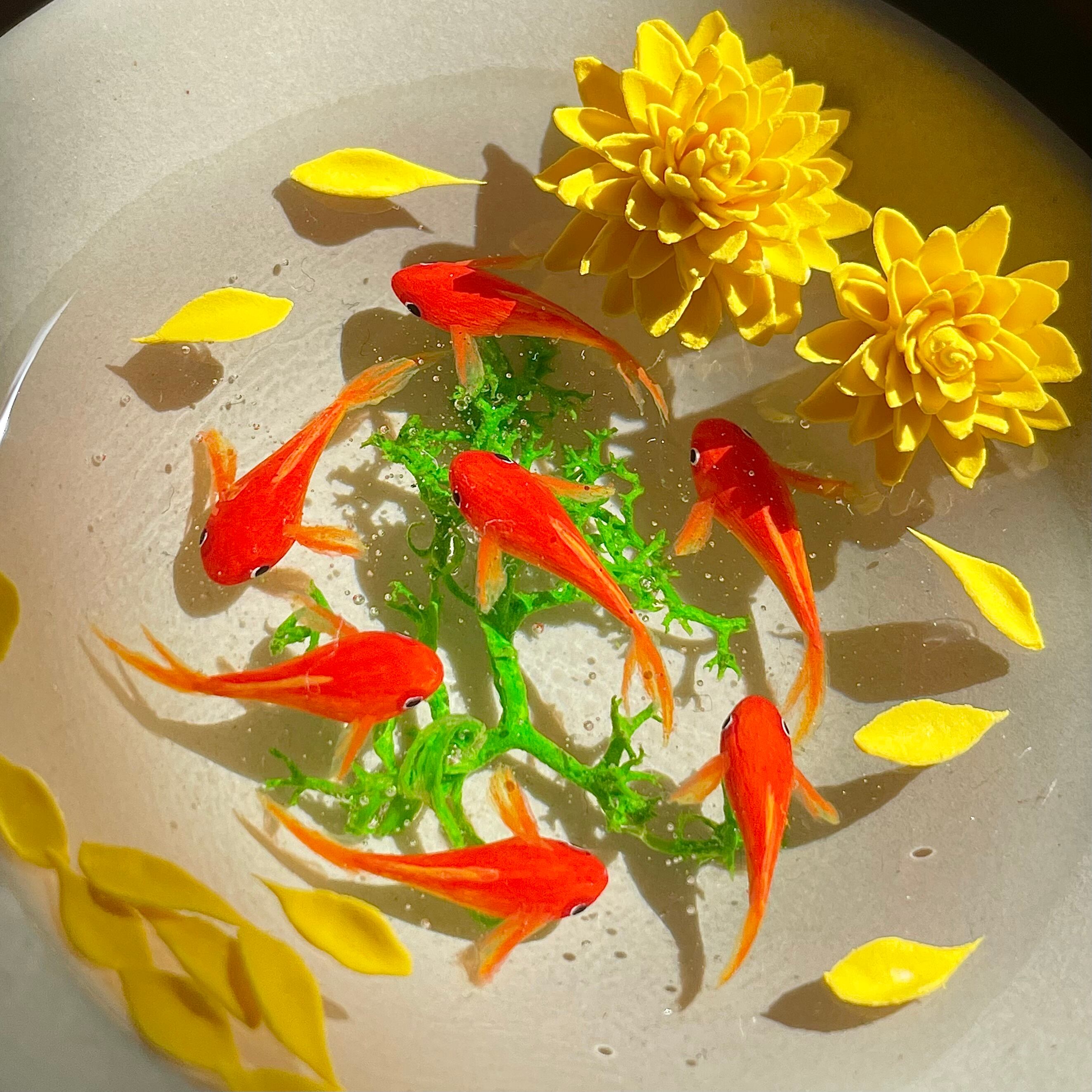 金魚も一匹ずつ型を使わずに造形し、小さな目をつけ、ヒレを描いておりますので、体の大きさやお顔や模様などお写真と若干異なります。
