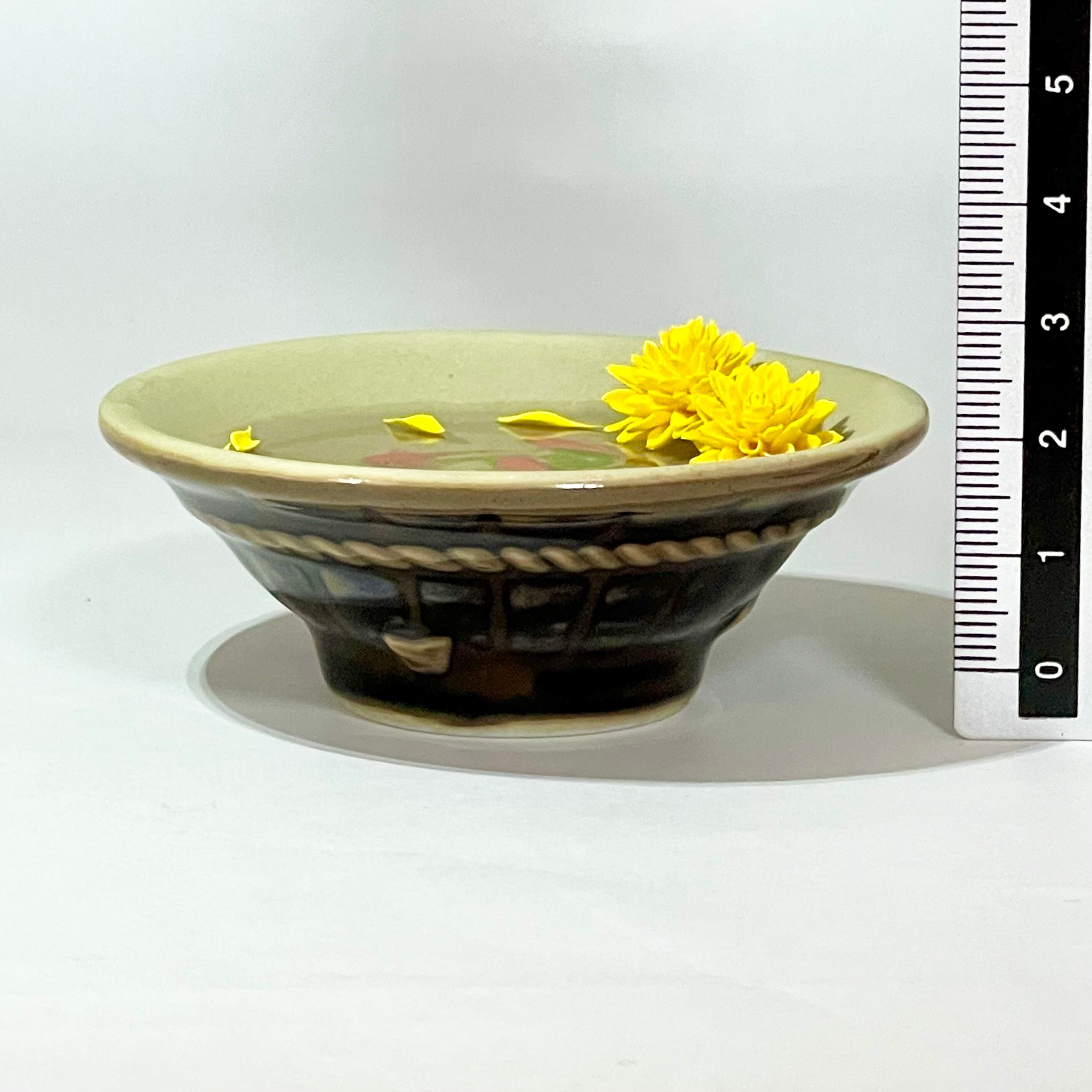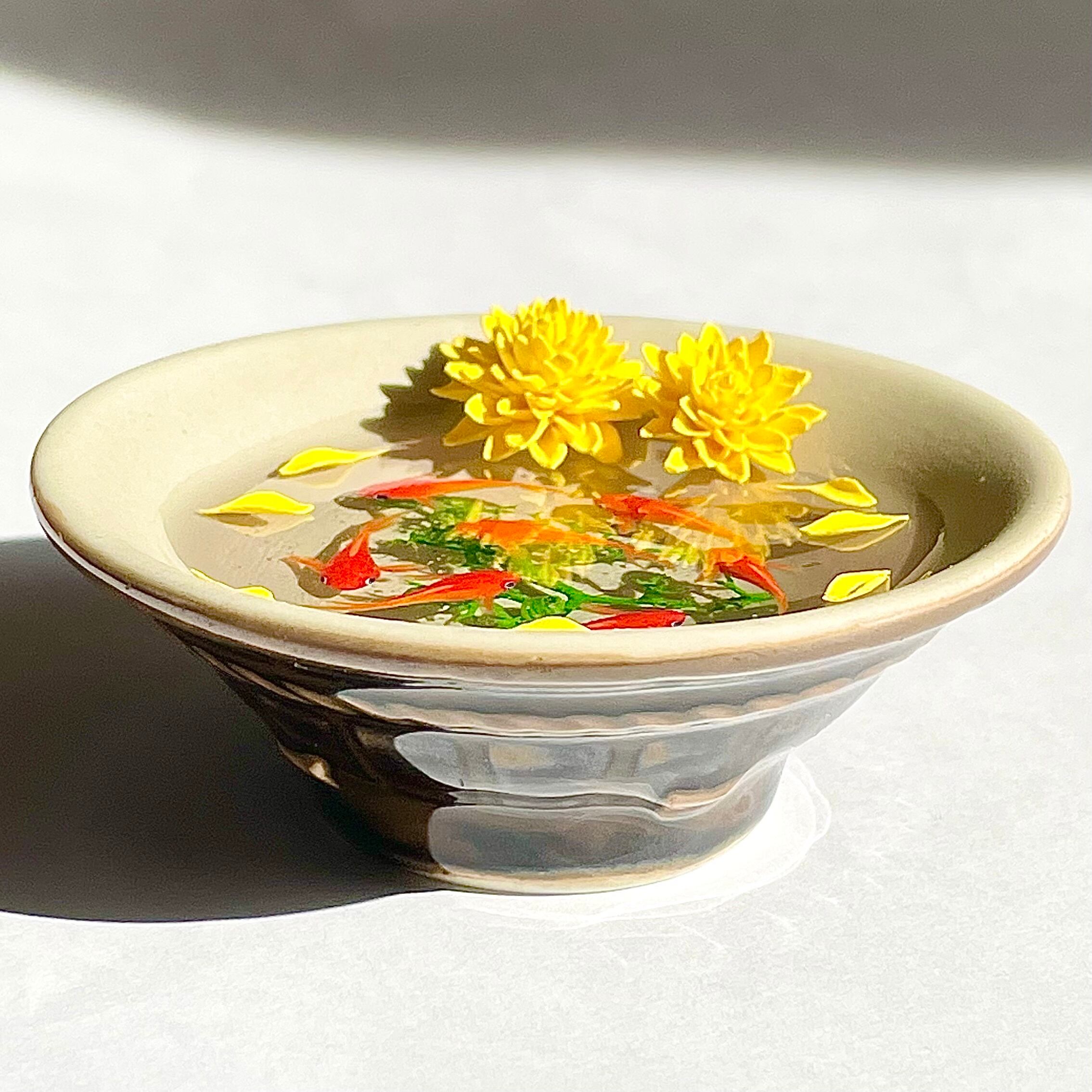 こちらは菊の浮かぶ盃に和金を泳がせた置物です。