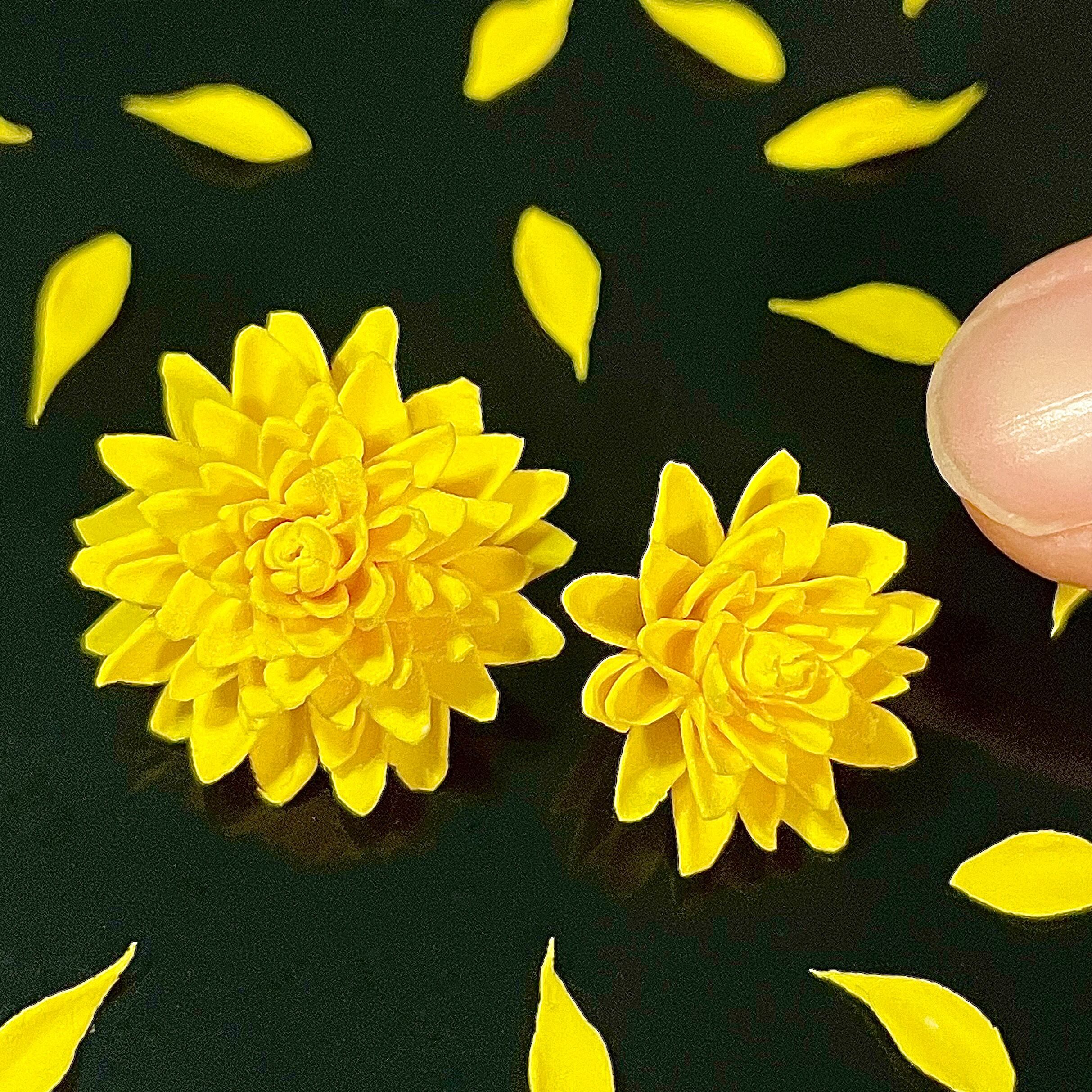 菊の花びらは一枚一枚全て手作業で薄く伸ばし、更に本物の花びらに近づけられるように柔らかなカーブをつけてお作りいたしました。