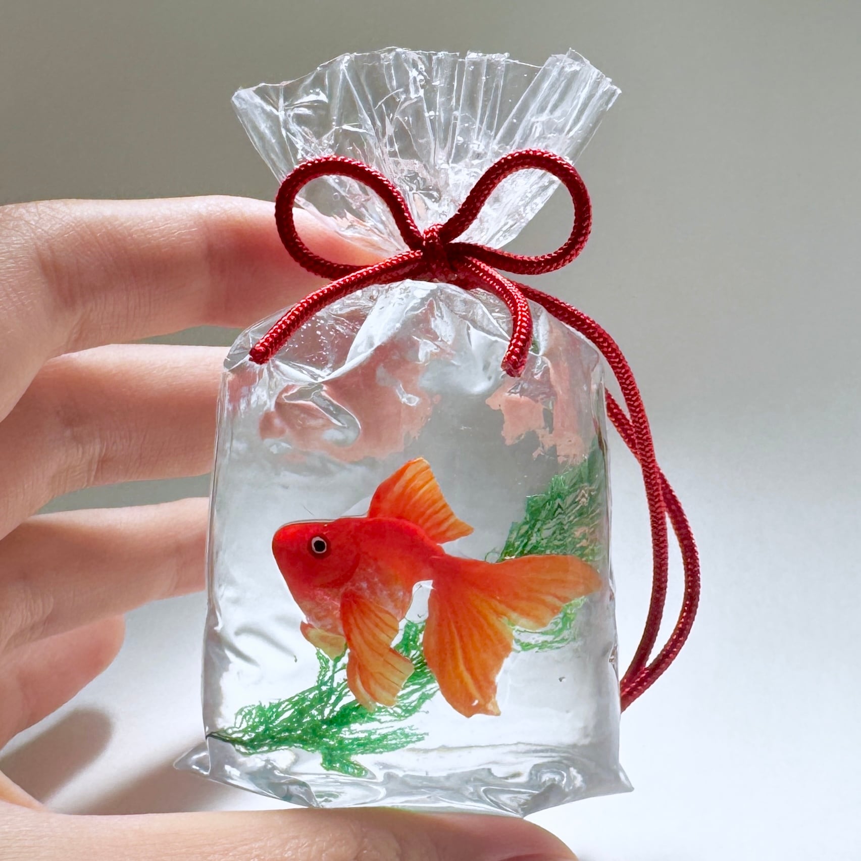 袋は実際に金魚すくいで使われている金魚袋を加工してお作りしておりますので、柔らかな立体感があり、手に取るとどこか懐かしい存在感を感じていただける仕上がりとなっております。