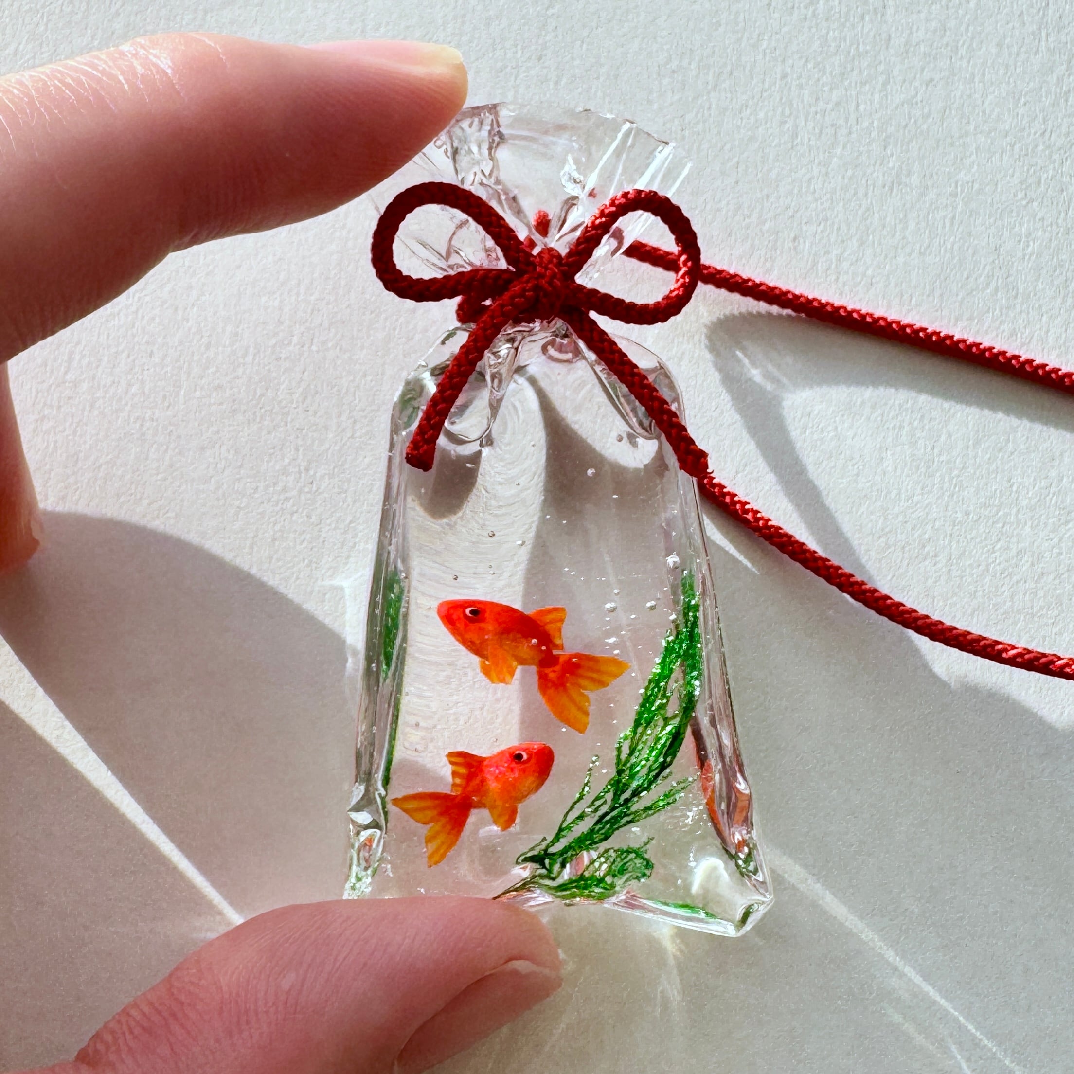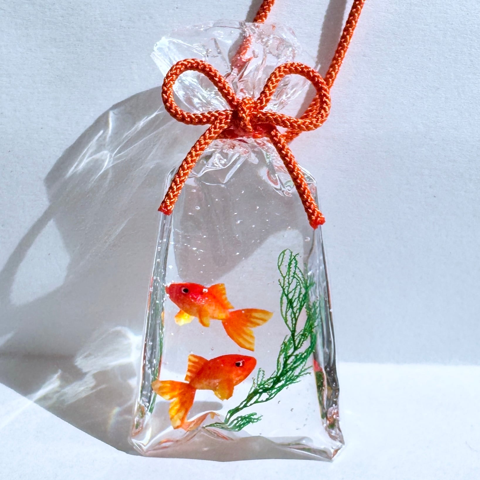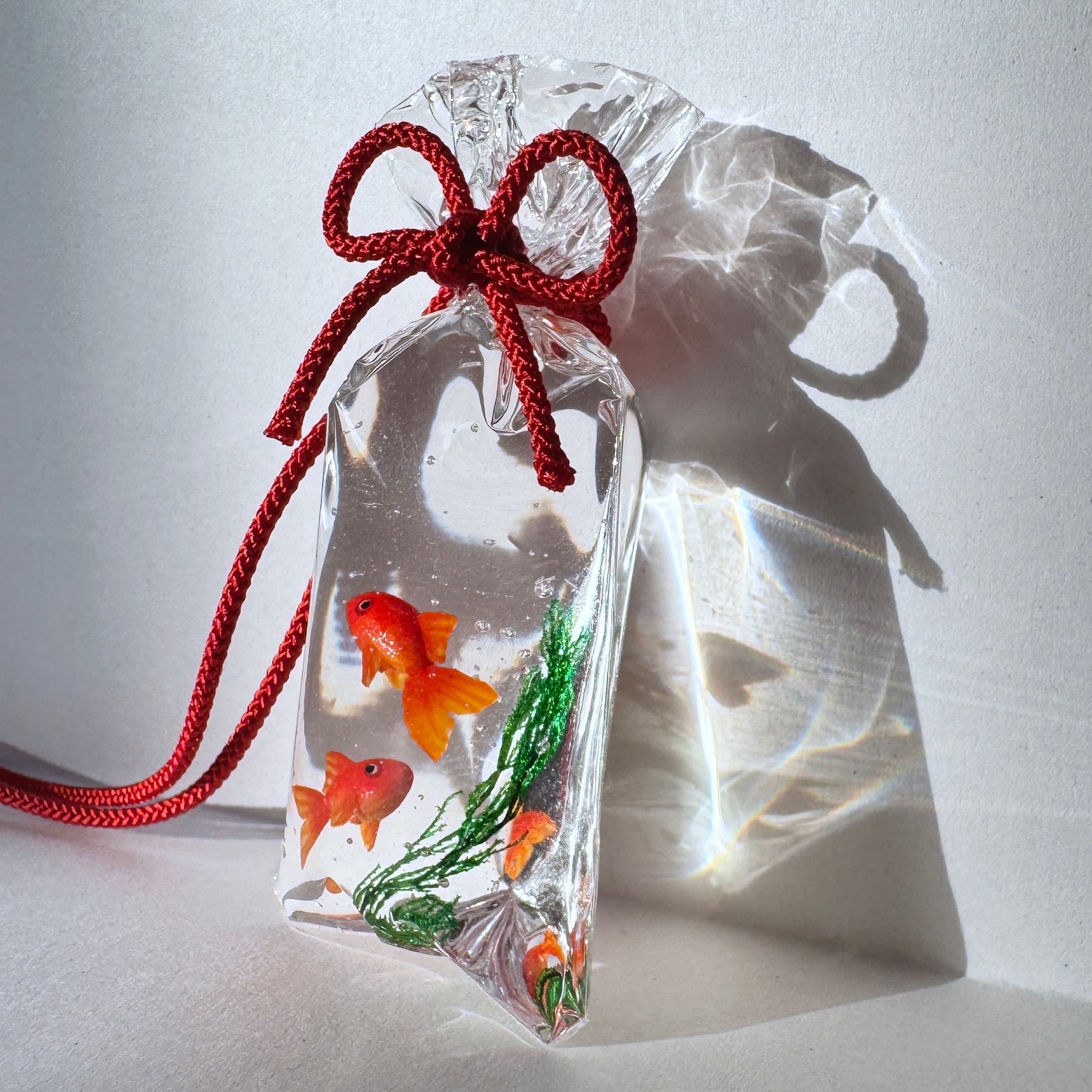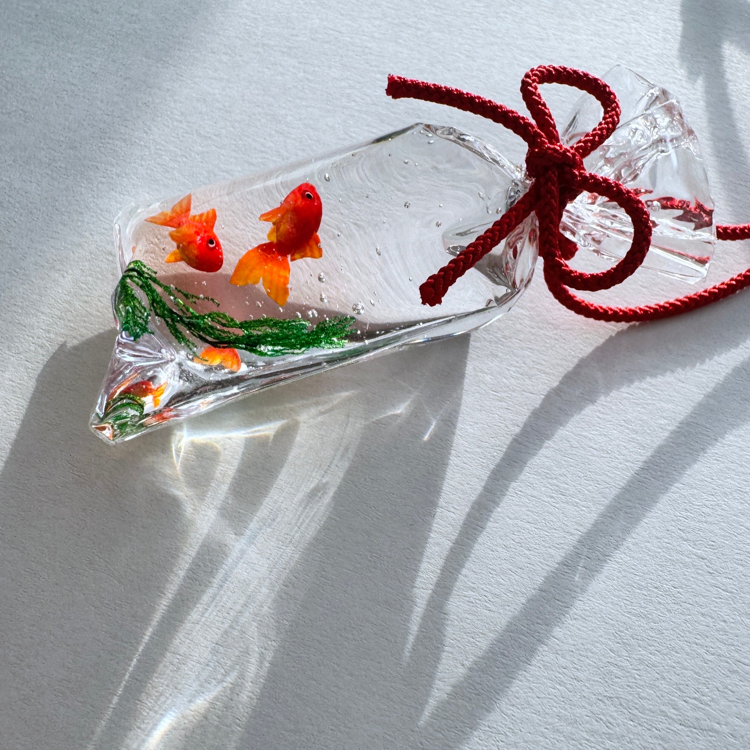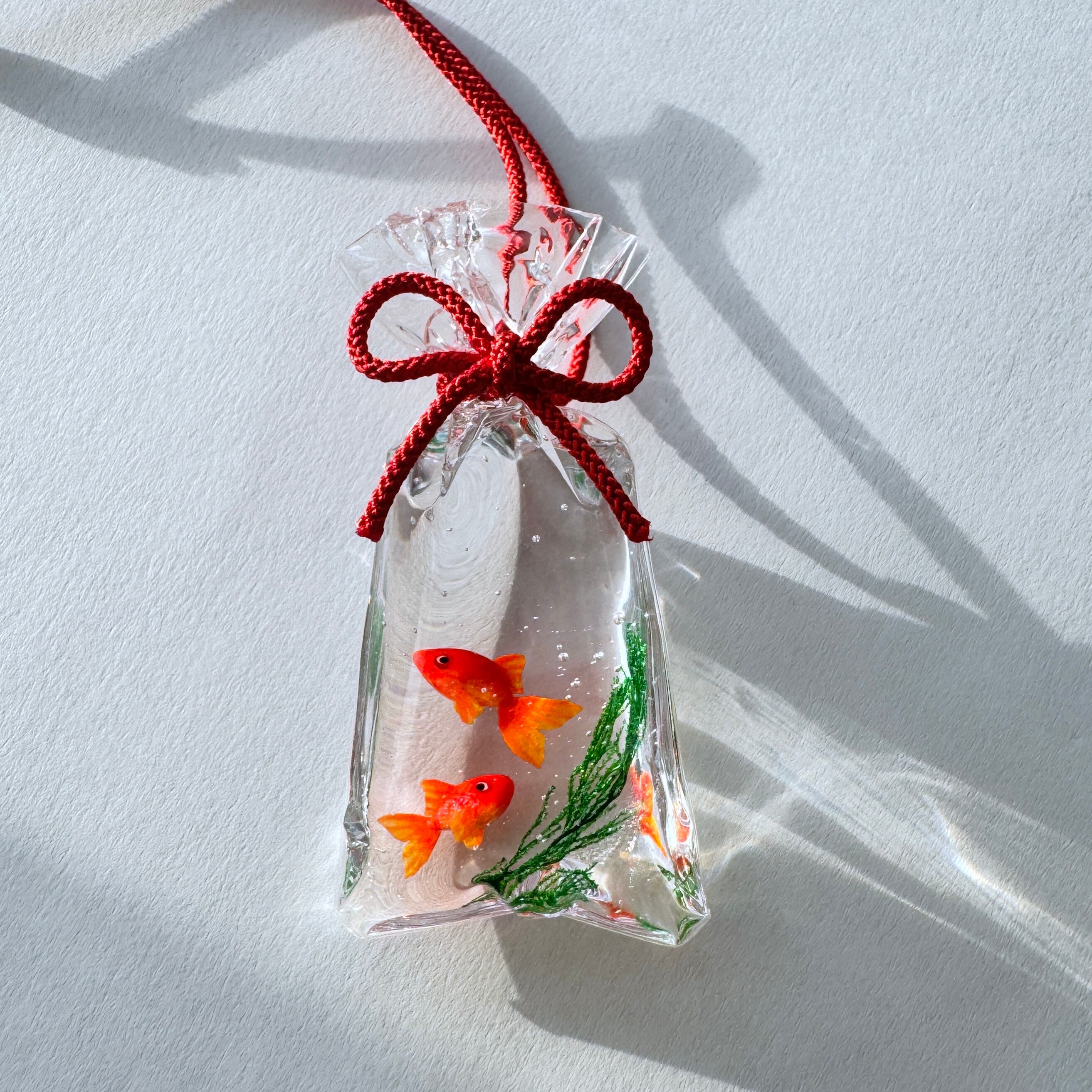 透き通る袋の中で、金魚たちがふわりと泳ぐ情景を表現いたしました。