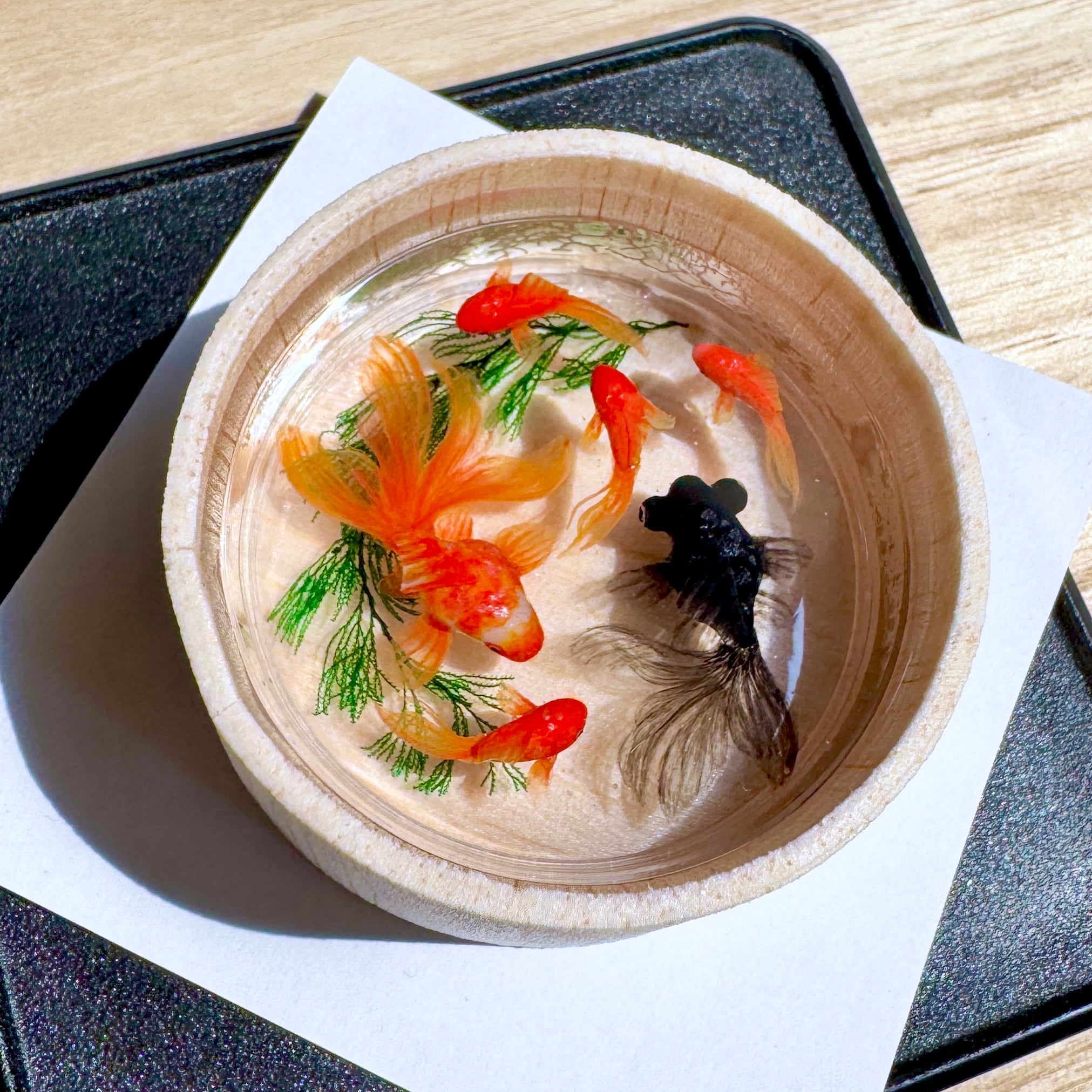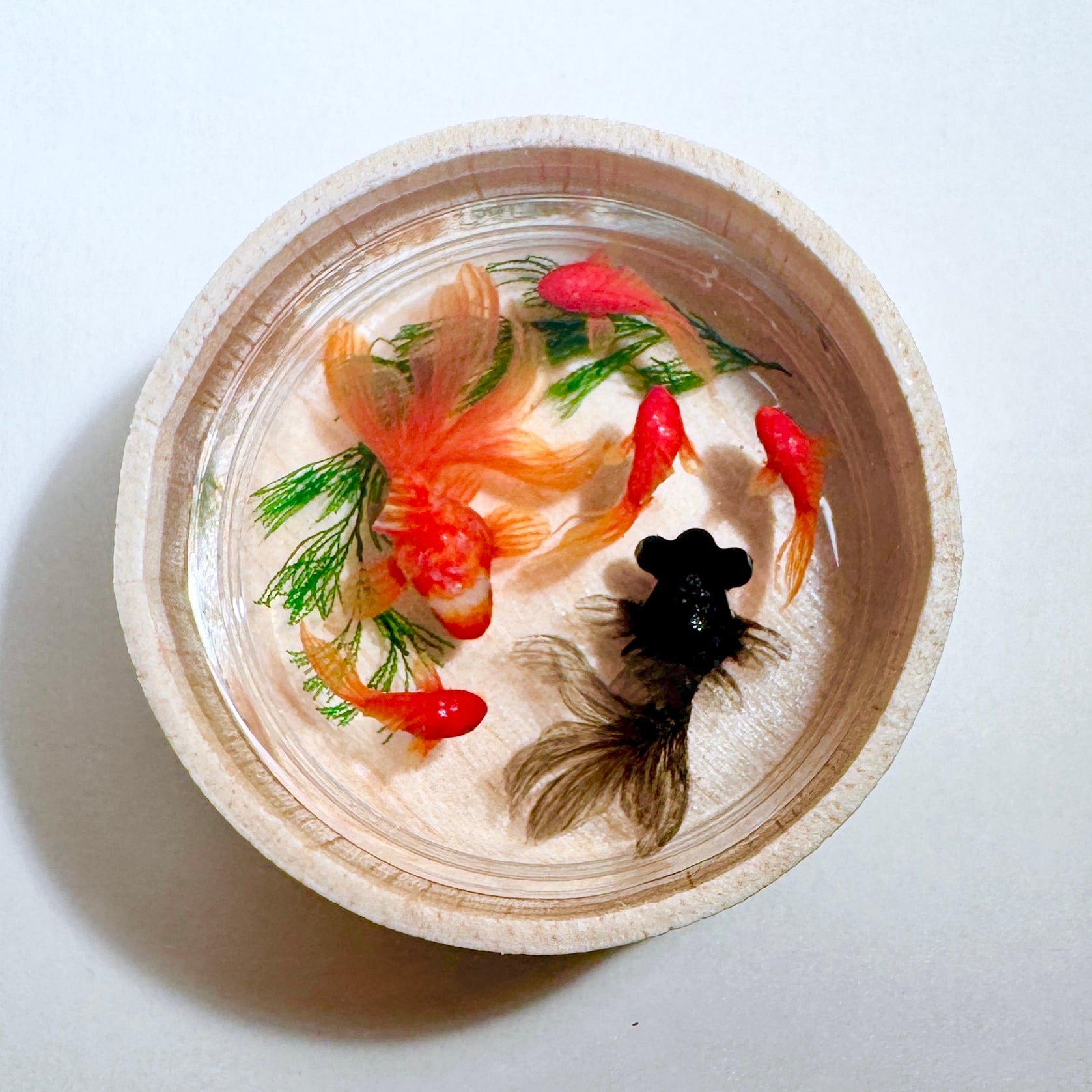 こちらは手作りの木桶で泳ぐ金魚の置物です。